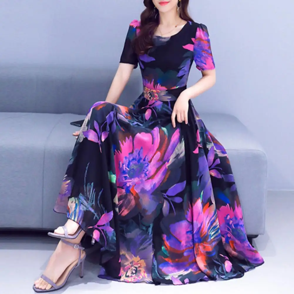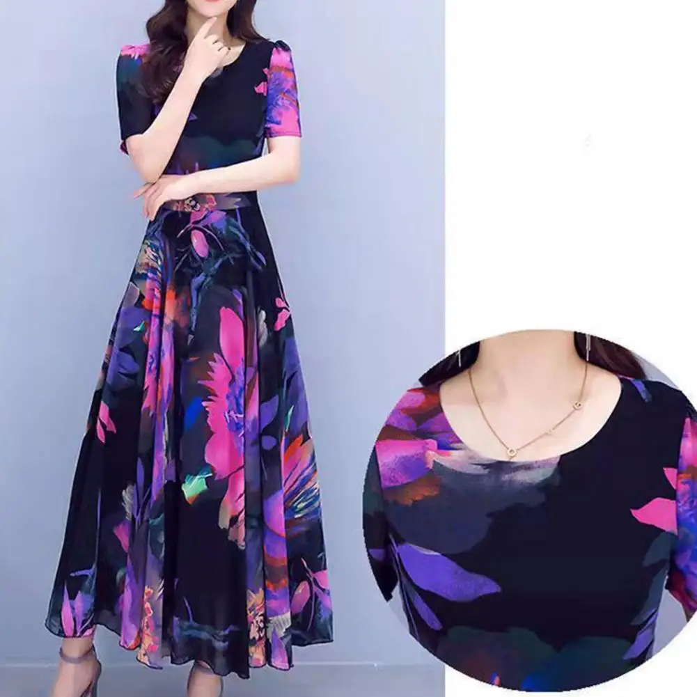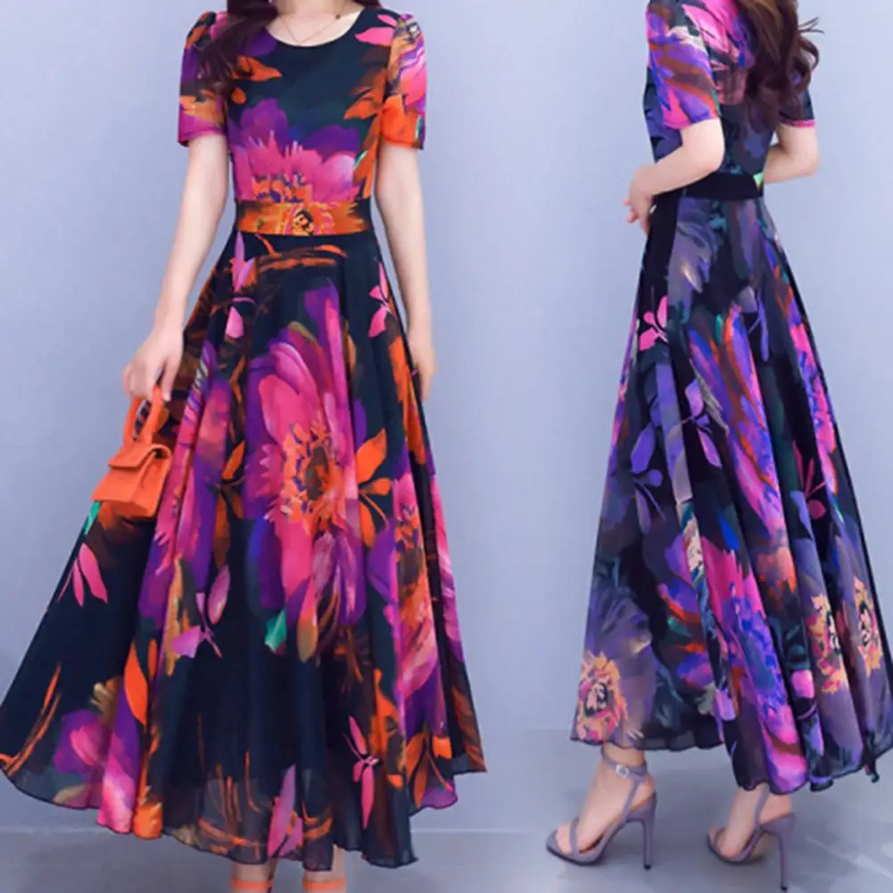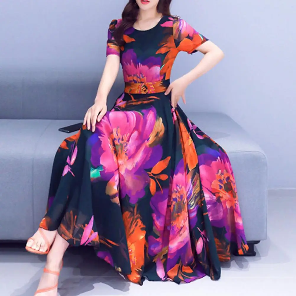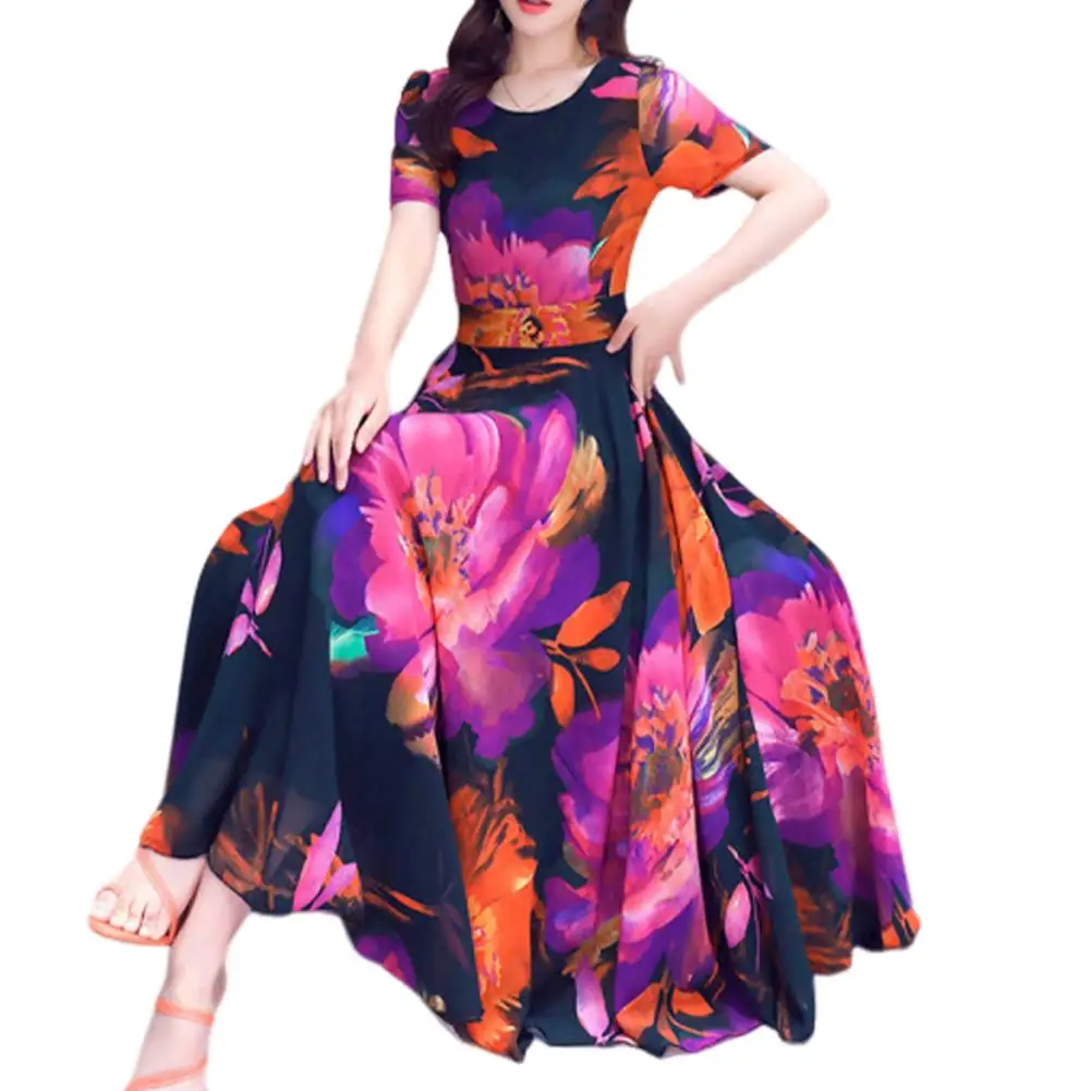 Women Dress Floral Print High Tight Waist Short Sleeve Round Neck A-line Big Swing Bohemian Plus Size Summer Beach Vacation Ankle Length Prom Party Midi Dress