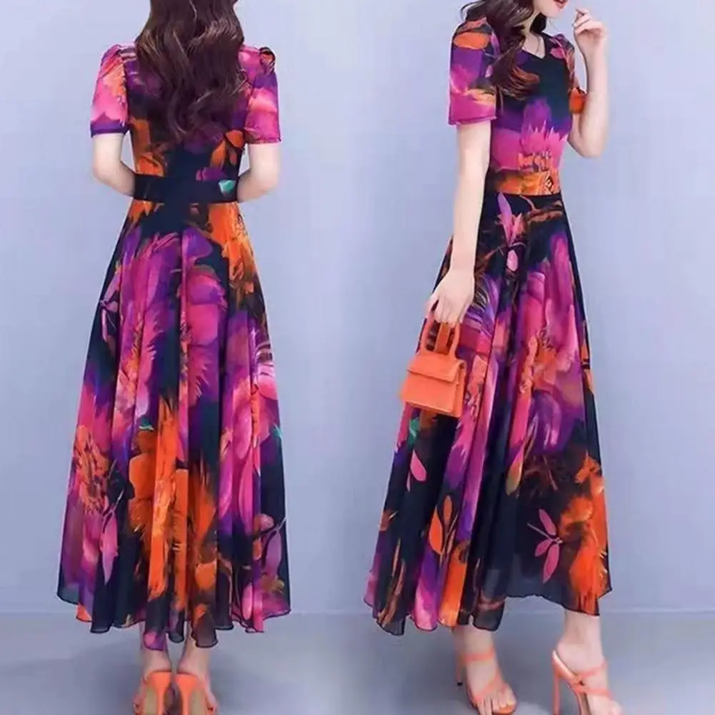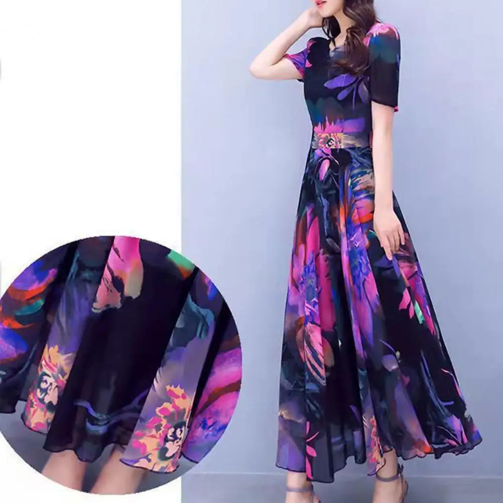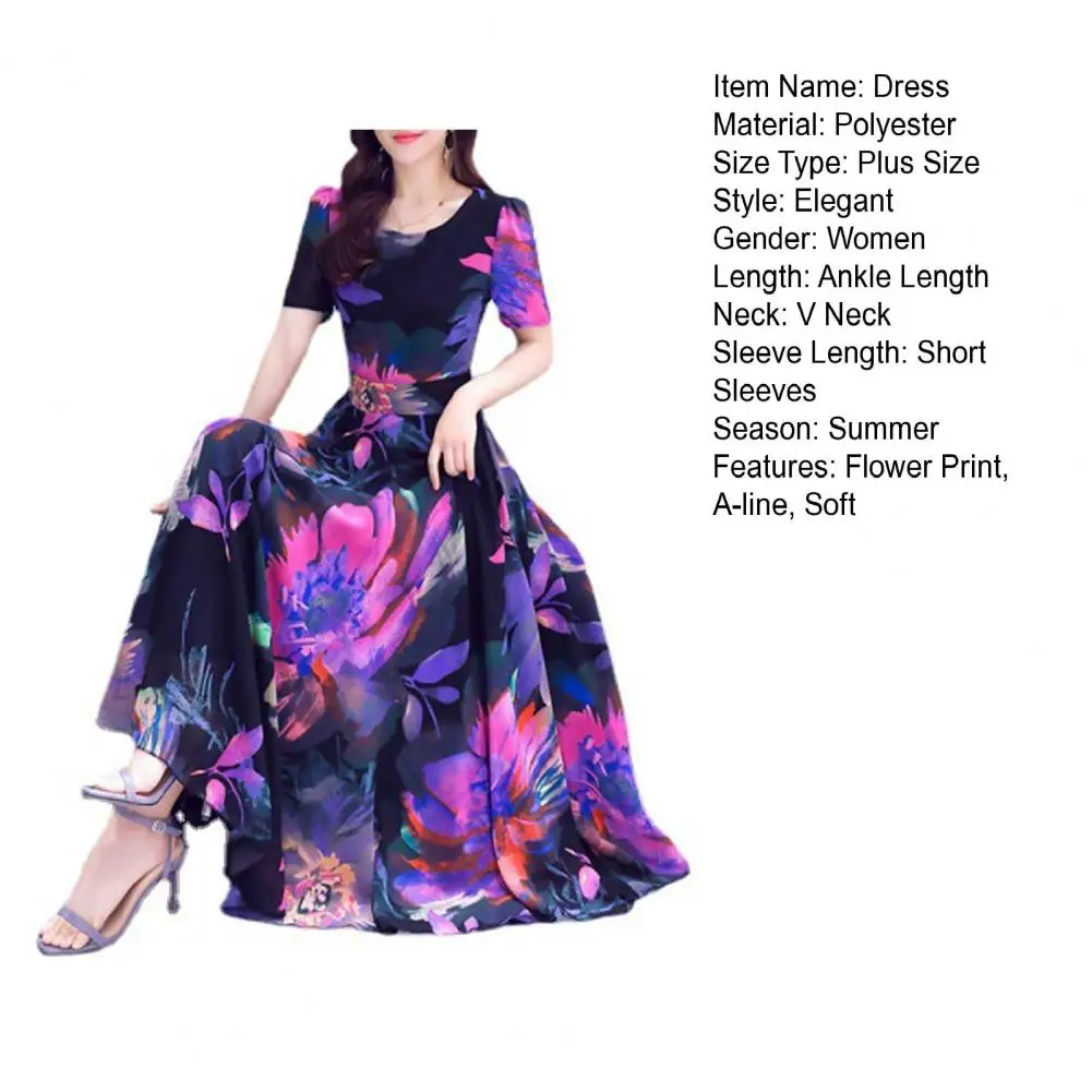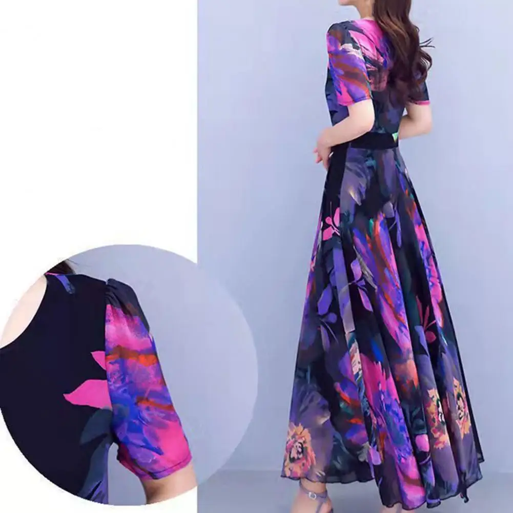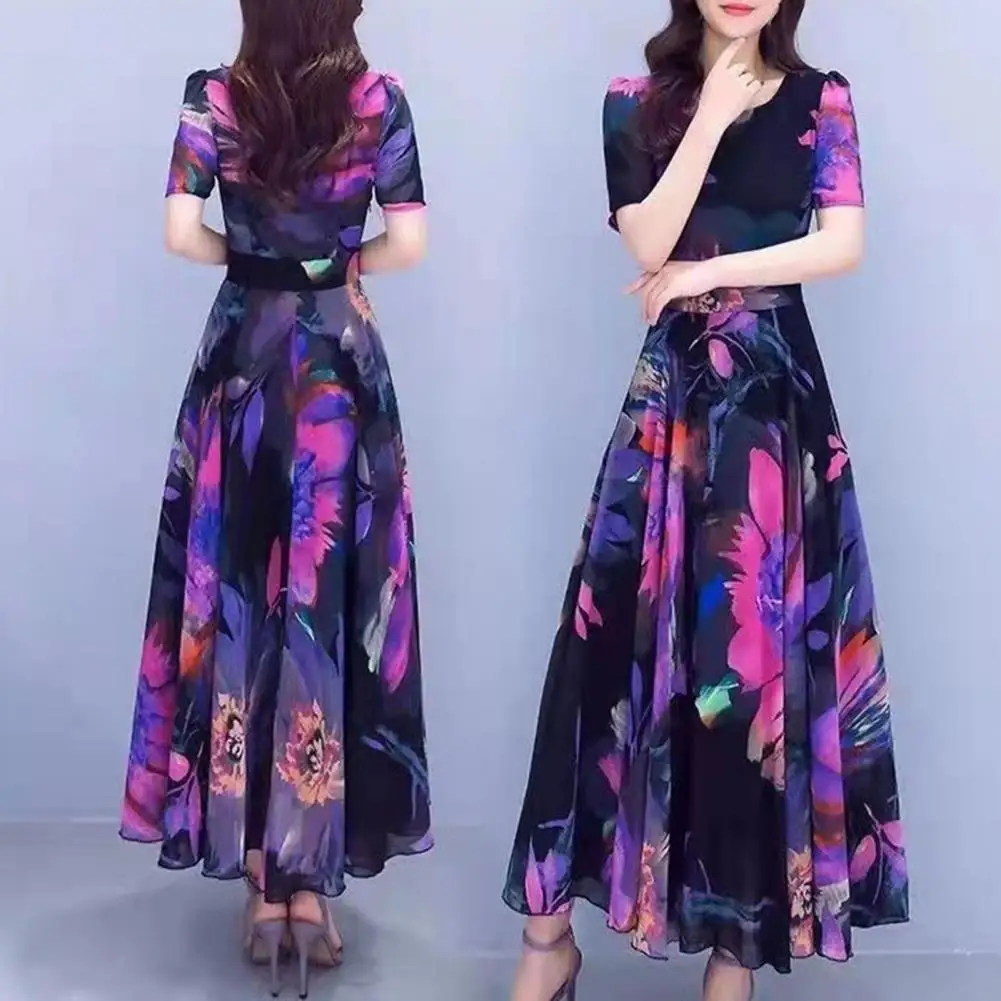 Women Dress Floral Print High Tight Waist Short Sleeve Round Neck A-line Big Swing Bohemian Plus Size Summer Beach Vacation Ankle Length Prom Party Midi Dress