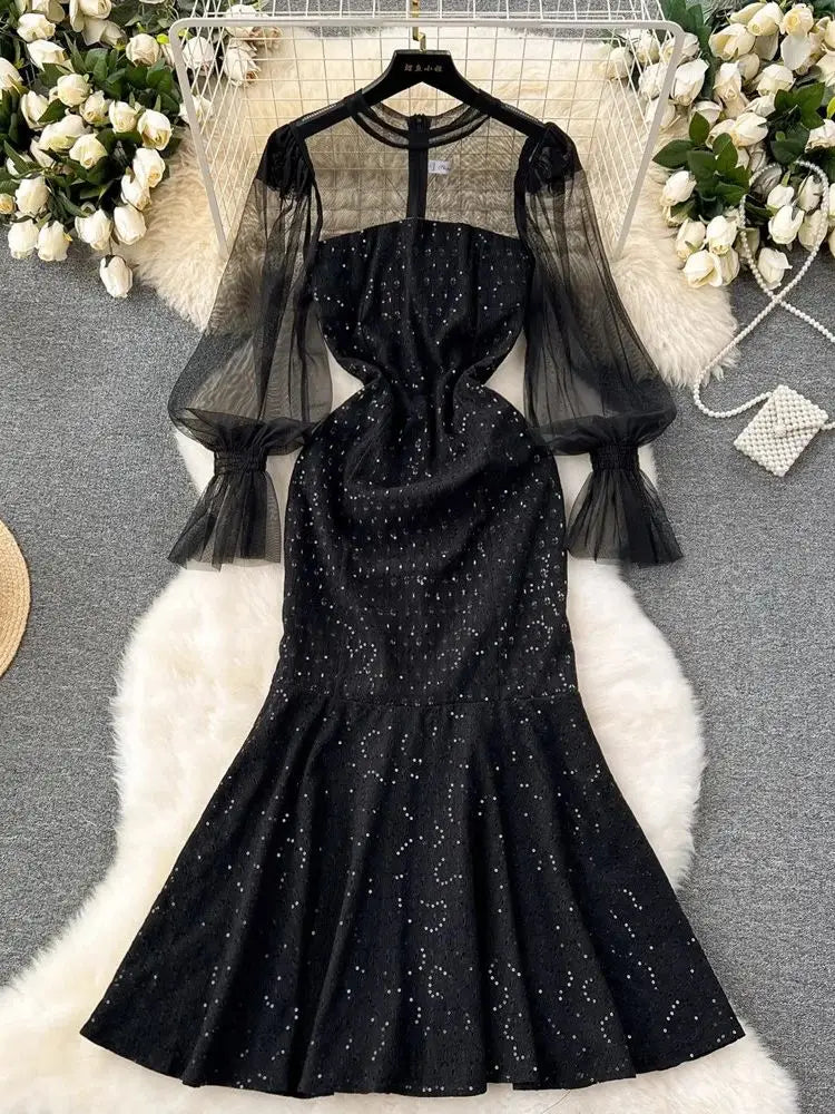 Women's Elegant Lace Maxi Dress - High Waist, Round Neck, Bodycon - Spring/Autumn 2024