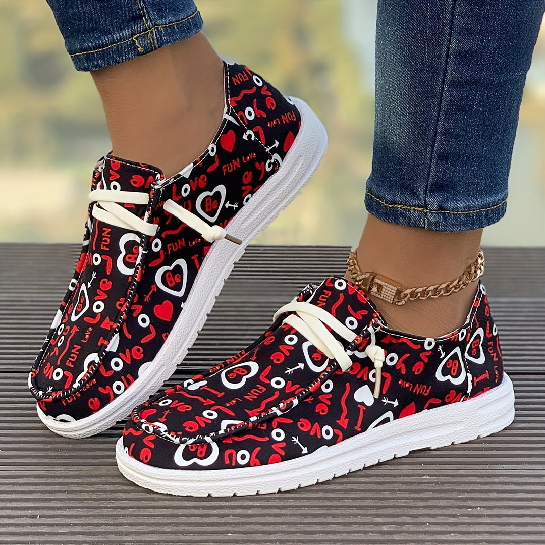 Women's Fashion Outdoor Skate Shoes, Upper With Letters And Hearts Pattern, Valentine Style Flat Comfortable Light Lace-up Skate Shoes