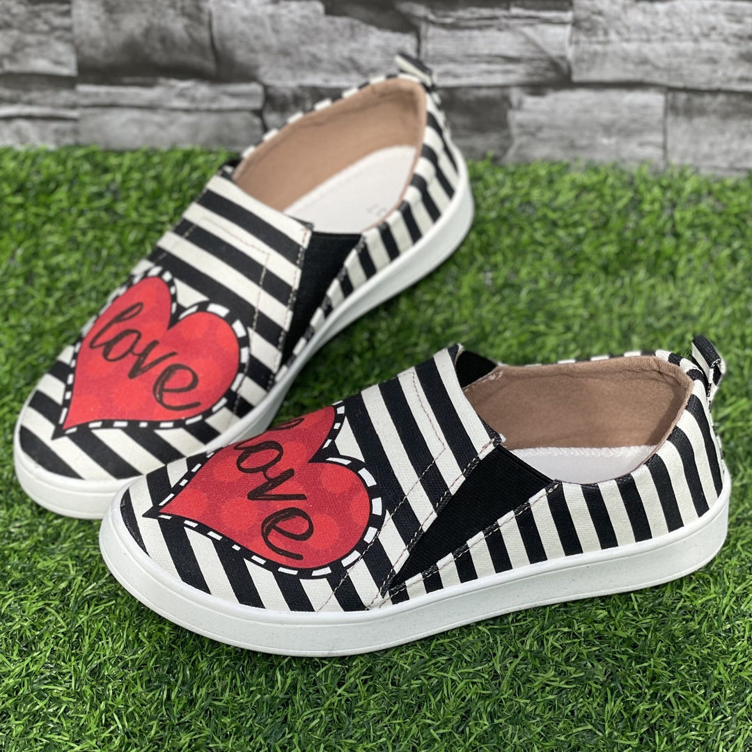 Women's Heart & Striped Print Laofers, Slip On Lightweight Soft Sole Casual Shoes, Valentine's Day Canvas Travel Shoes