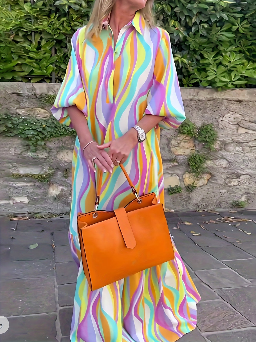 Plus Size Elegant Dress, Women's Plus Colorblock Stripe Print Half Puff Sleeve Button Detail Lapel Collar Smock Pron Maxi Dress
