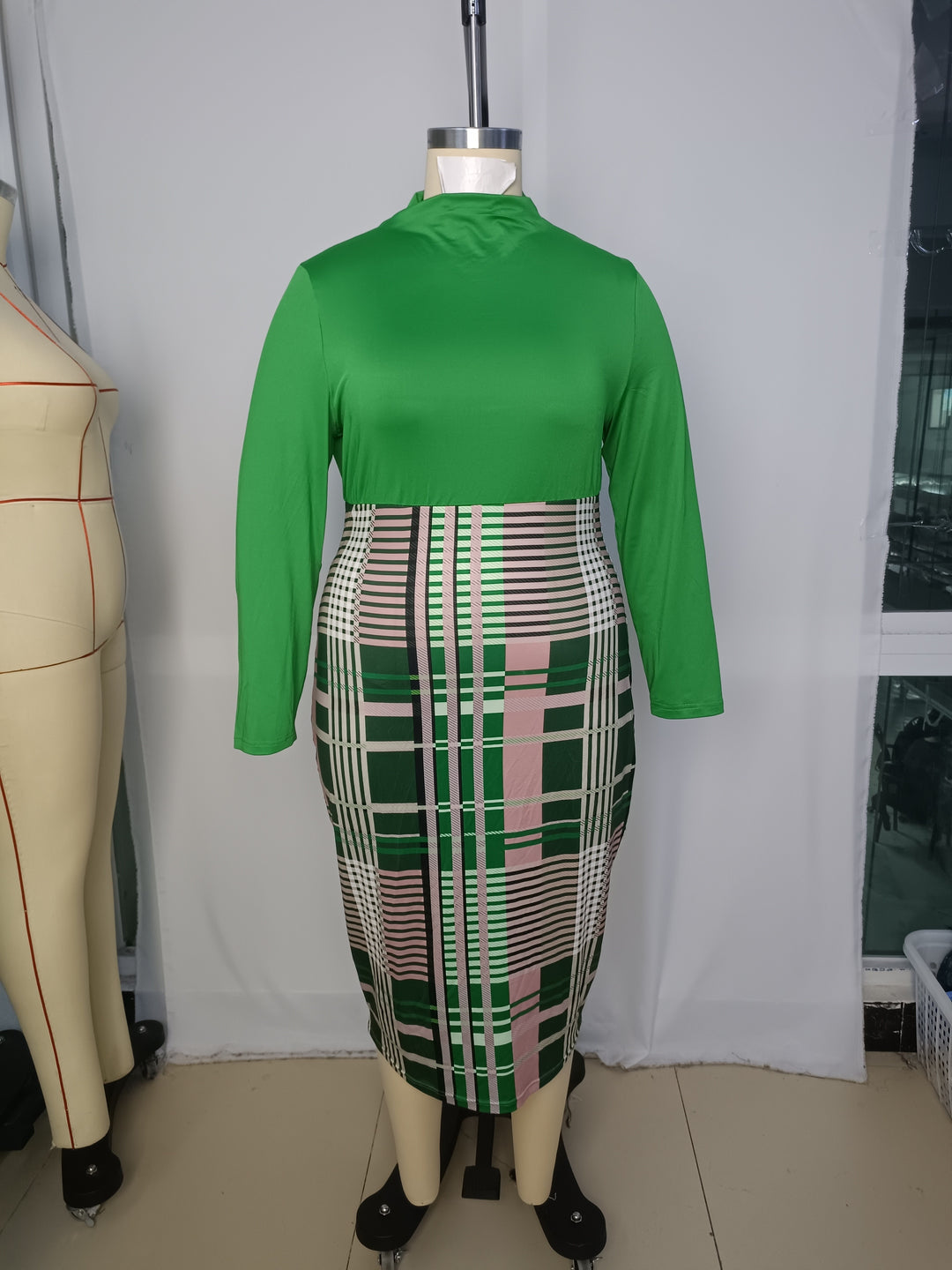 Plus Size Elegant Dress, Women's Plus Colorblock Plaid Print Long Sleeve Mock Neck Bodycon Midi Dress