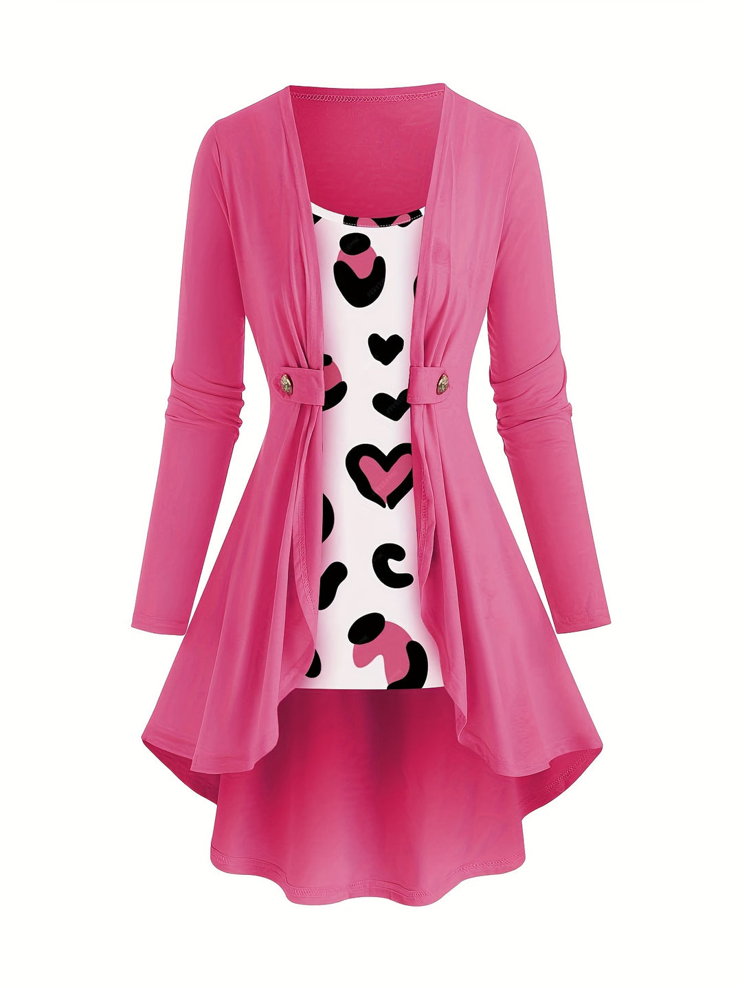 Plus Size Colorblock Two-piece Set, Irregular Hem Long Sleeve Cardigan & Heart Print Cami Top Outfits, Women's Plus Size Clothing