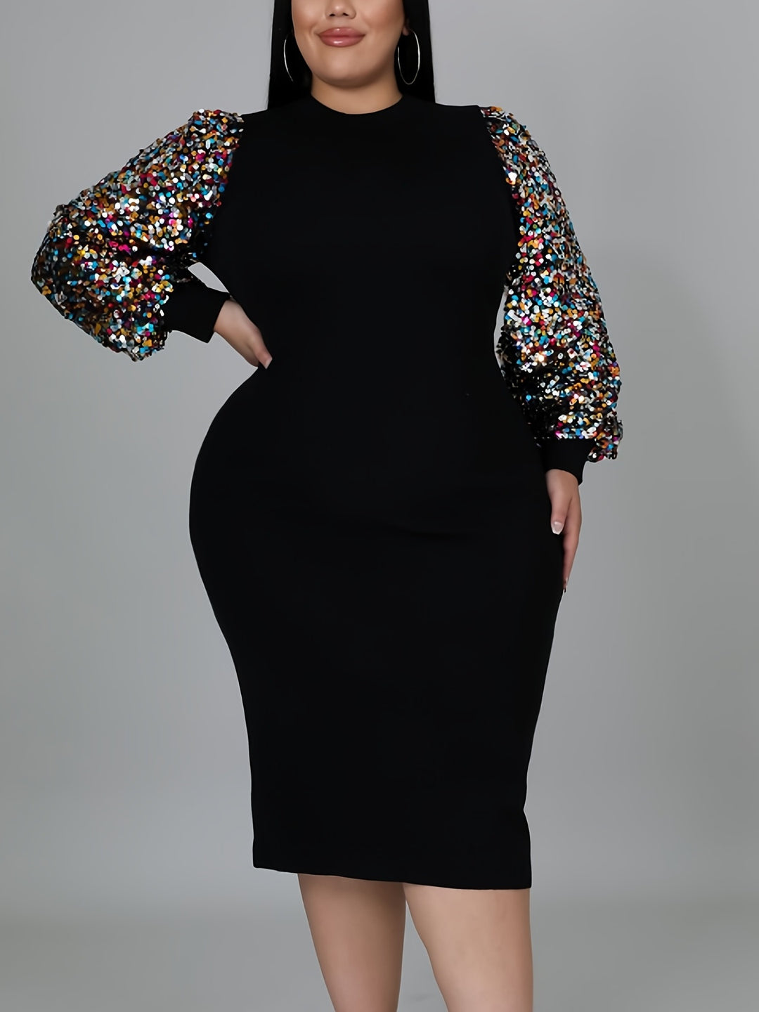 Plus Size Elegant Dress, Women's Plus Colorblock Sequins Decor Long Sleeve Round Neck Bodycon Midi Dress