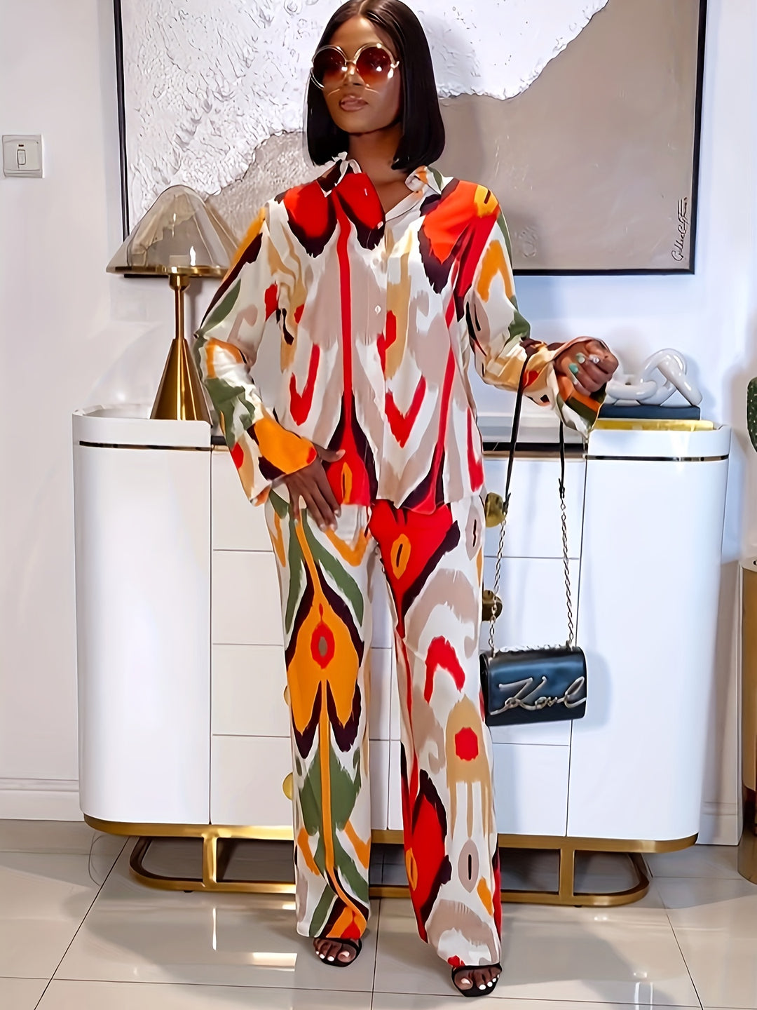 Plus Size Colorblock Print Two-piece Set, Long Sleeve Button Top & Straight Leg Pants, Women's Plus Size Clothing