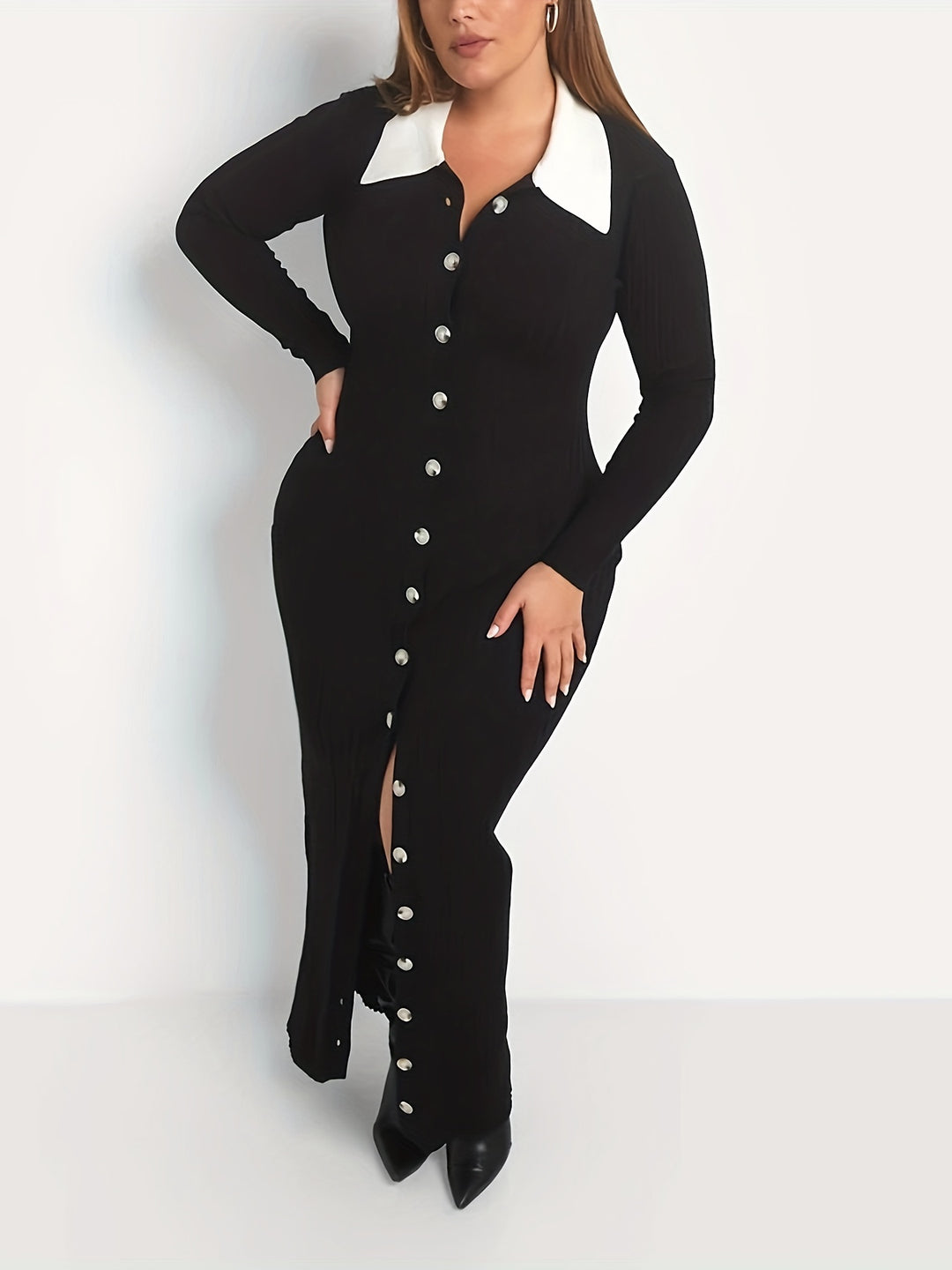 Plus Size Colorblock Button Front Dress, Casual Collared Long Sleeve Midi Dress, Women's Plus Size Clothing