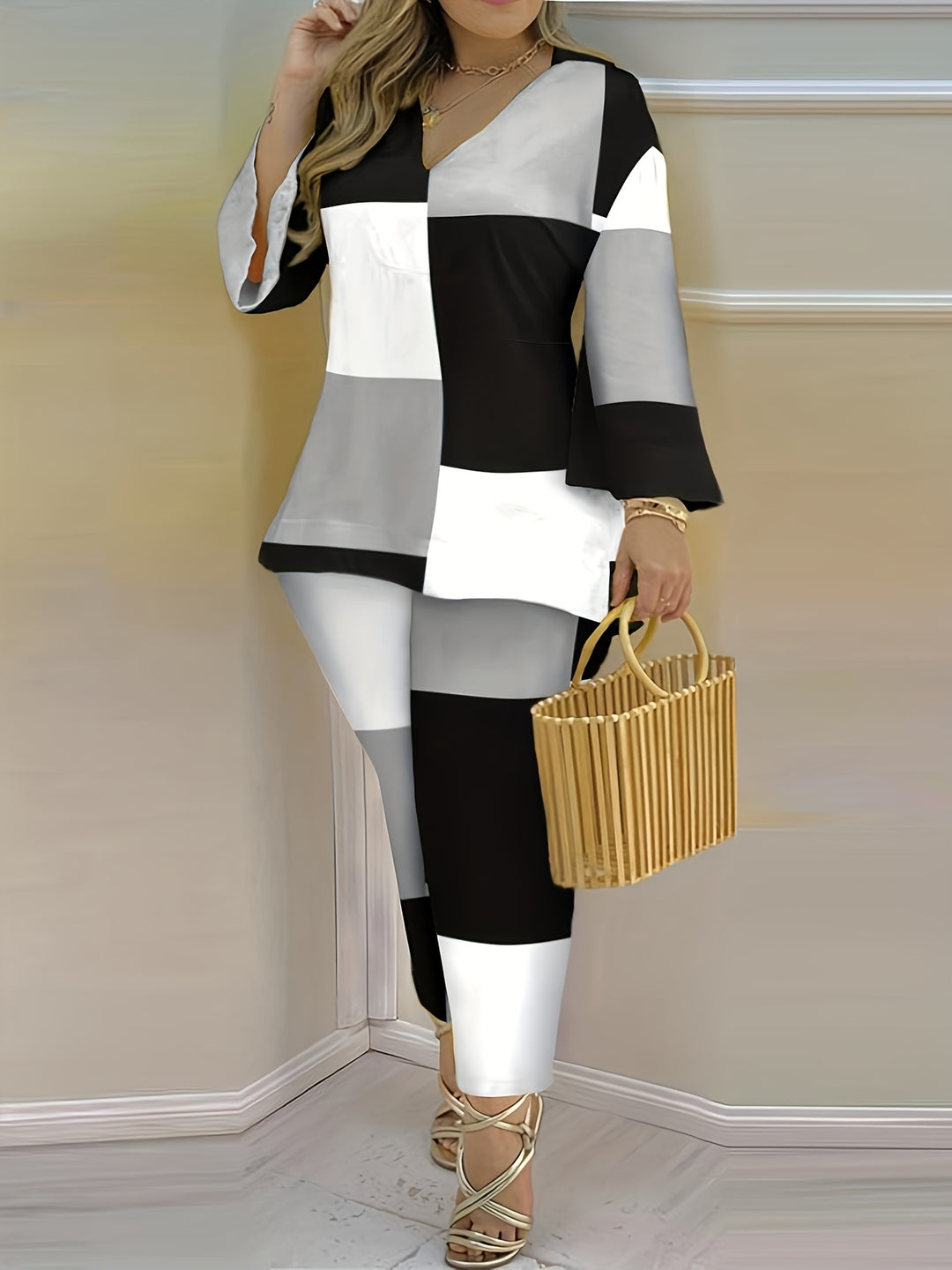 Plus Size Elegant Outfits Set, Women's Plus Colorblock Bell Sleeve V Neck Top & Pants Outfits Two Piece Set