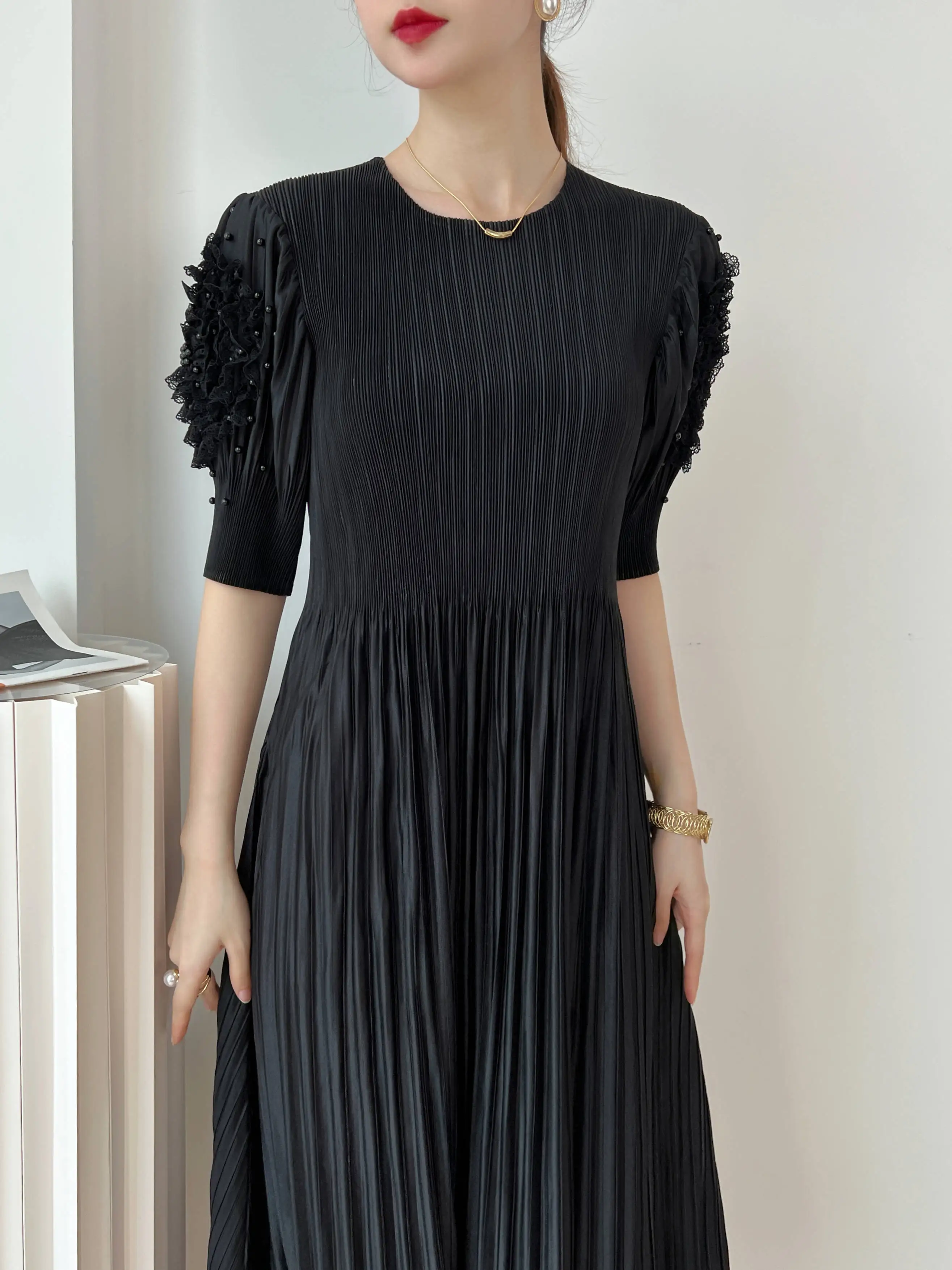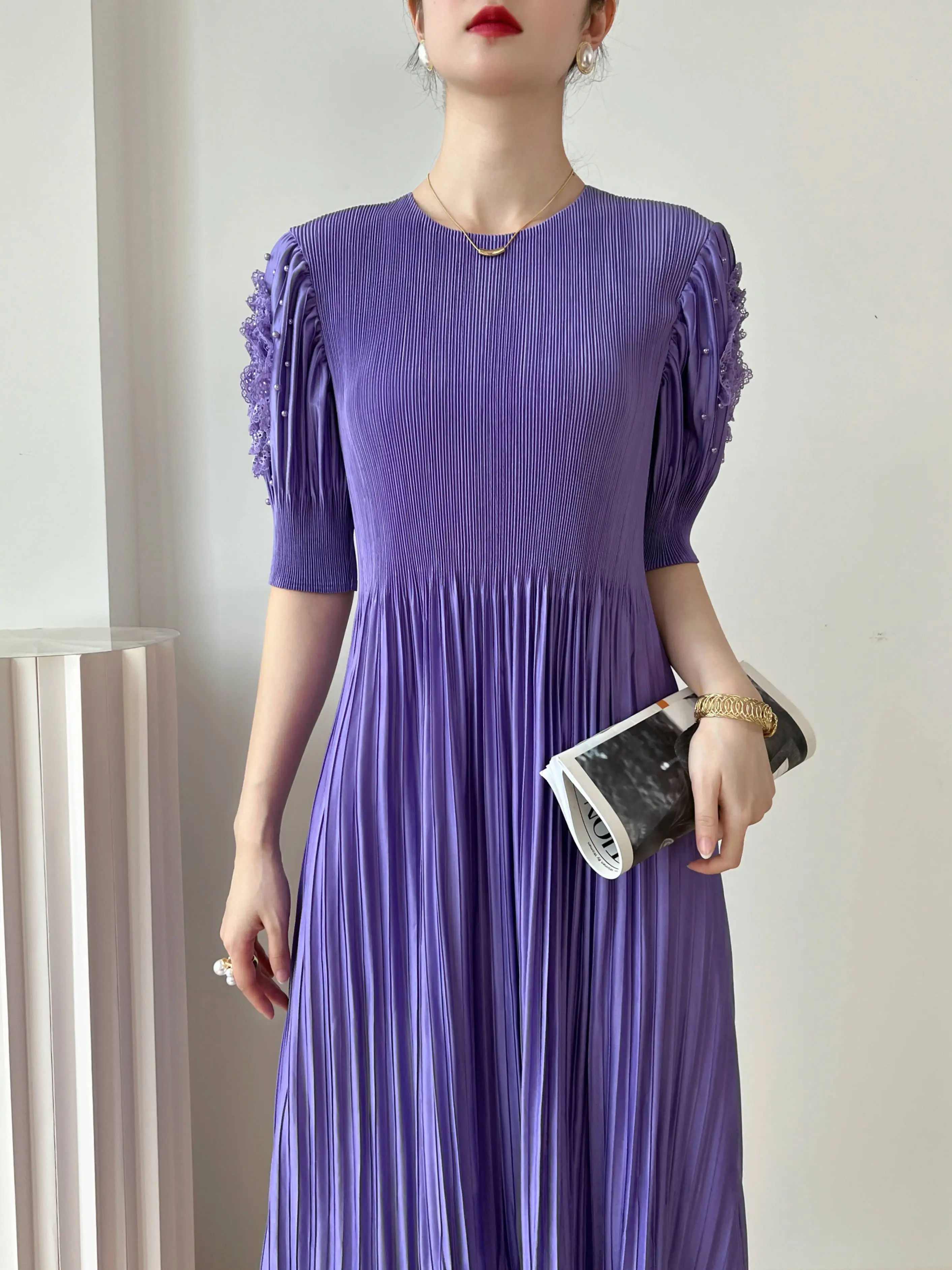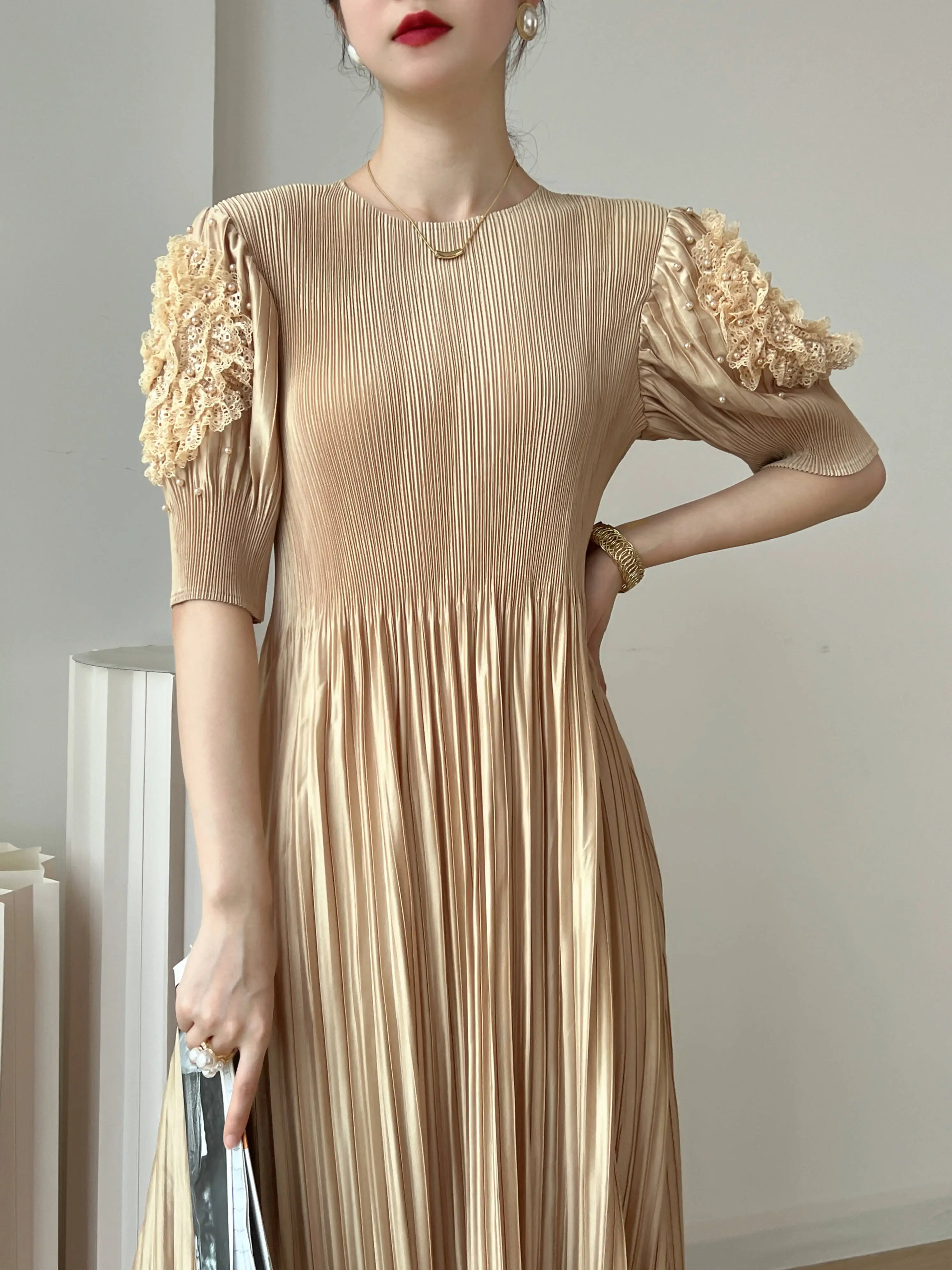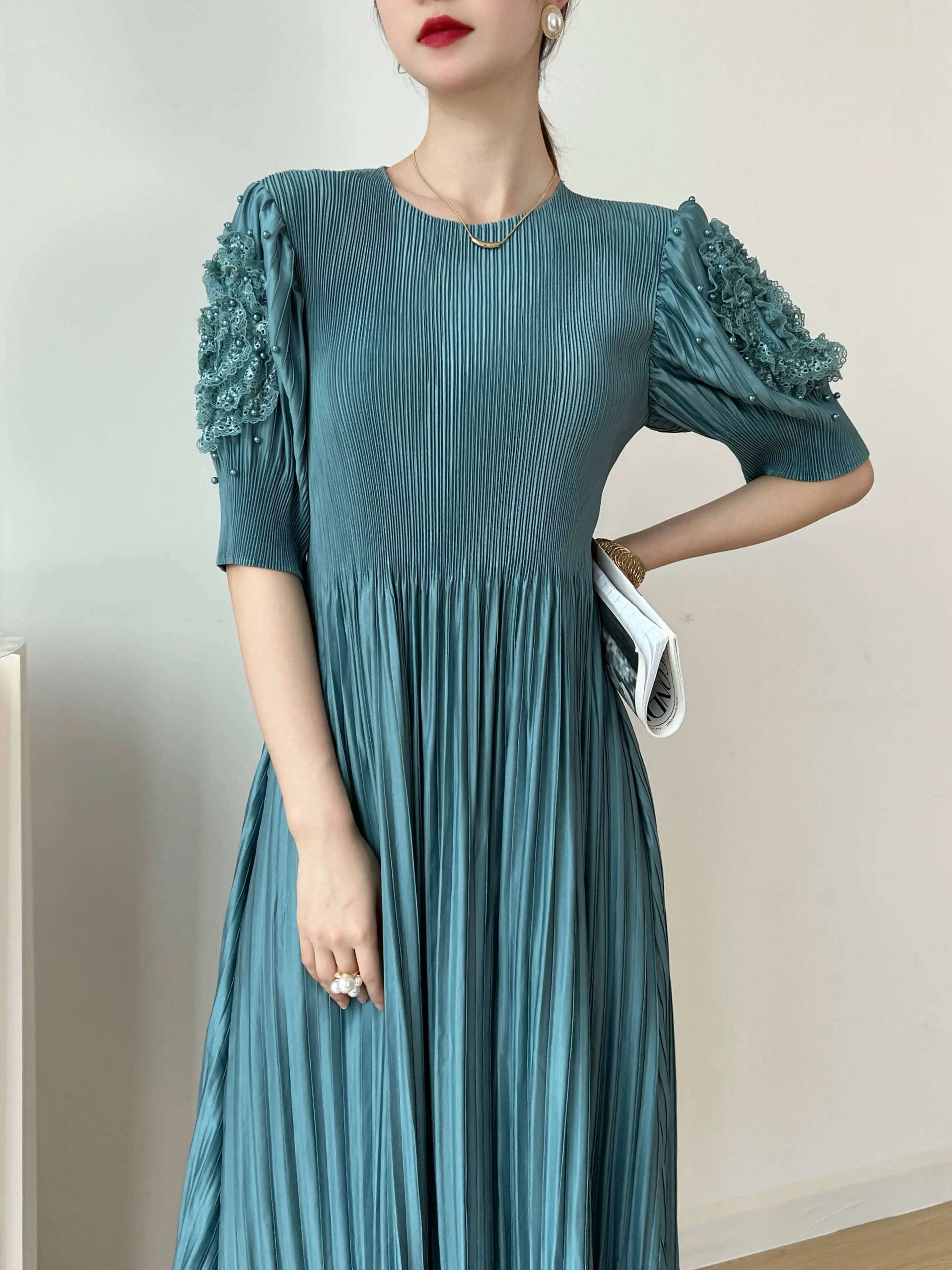 Introducing the YUDX Miyake 2023 Spring and Summer New Dress, a must-have for any fashion-forward woman. This dress features a pleated design, solid color, and a round neck for a timeless and elegant look. The loose fit and bubble sleeves add a touch of playfulness, making it perfect for any party or special occasion. Not only does it solve the problem of finding the perfect dress, but it also offers comfort and style in one. Made with premium materials, this dress is a best-seller and exclusive to our brand. Don't miss out on this limited-time opportunity to elevate your wardrobe with the perfect fit.
