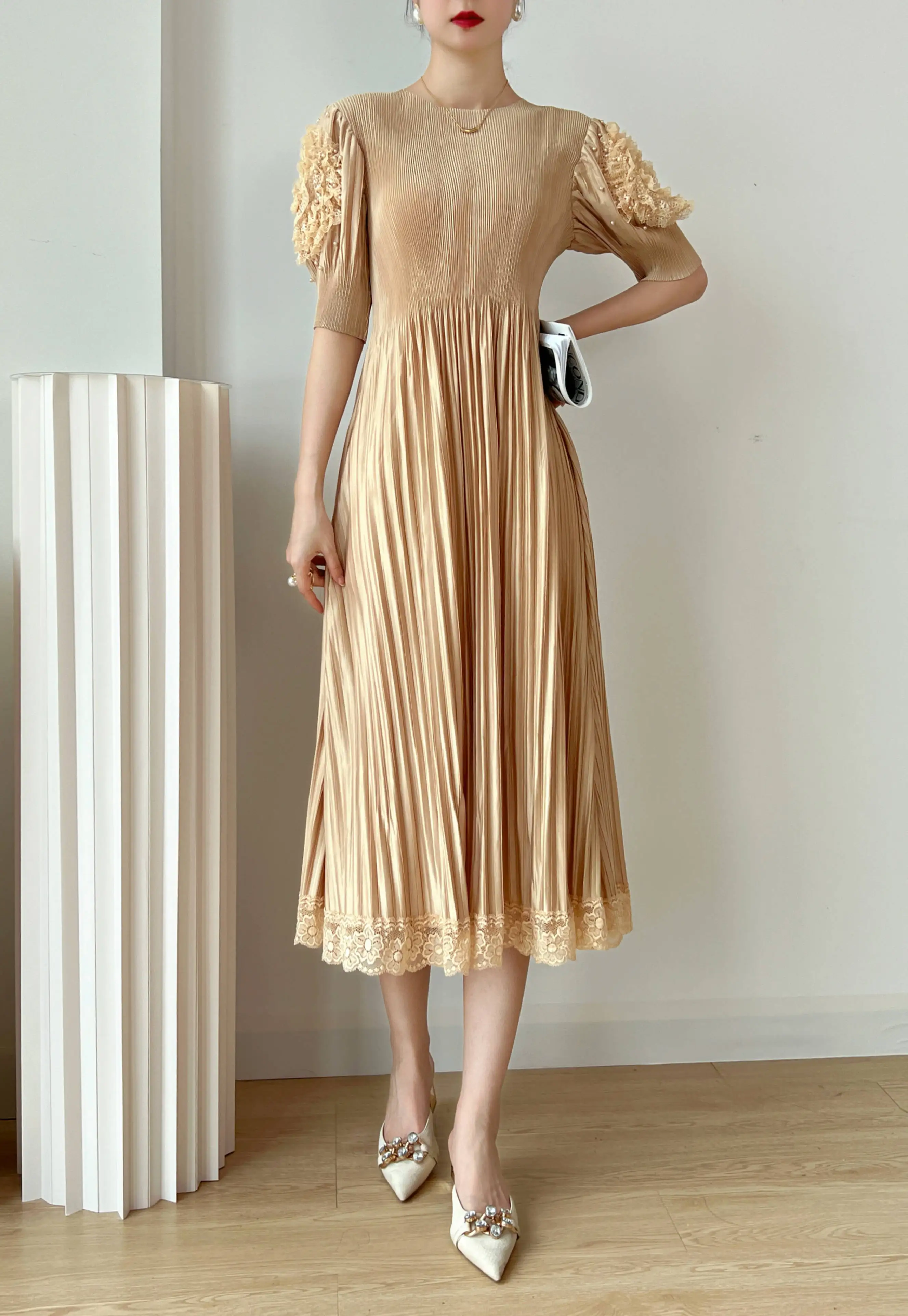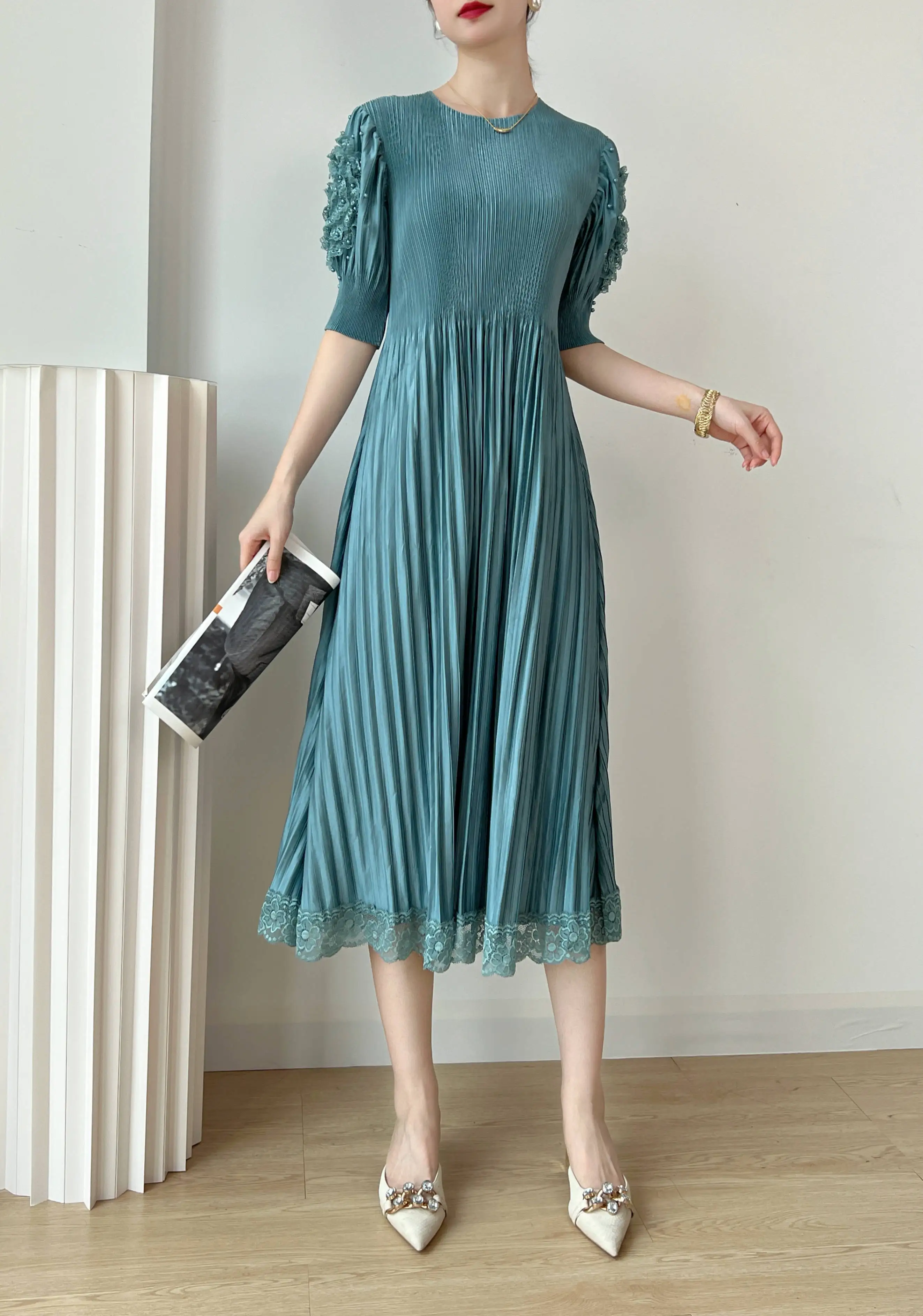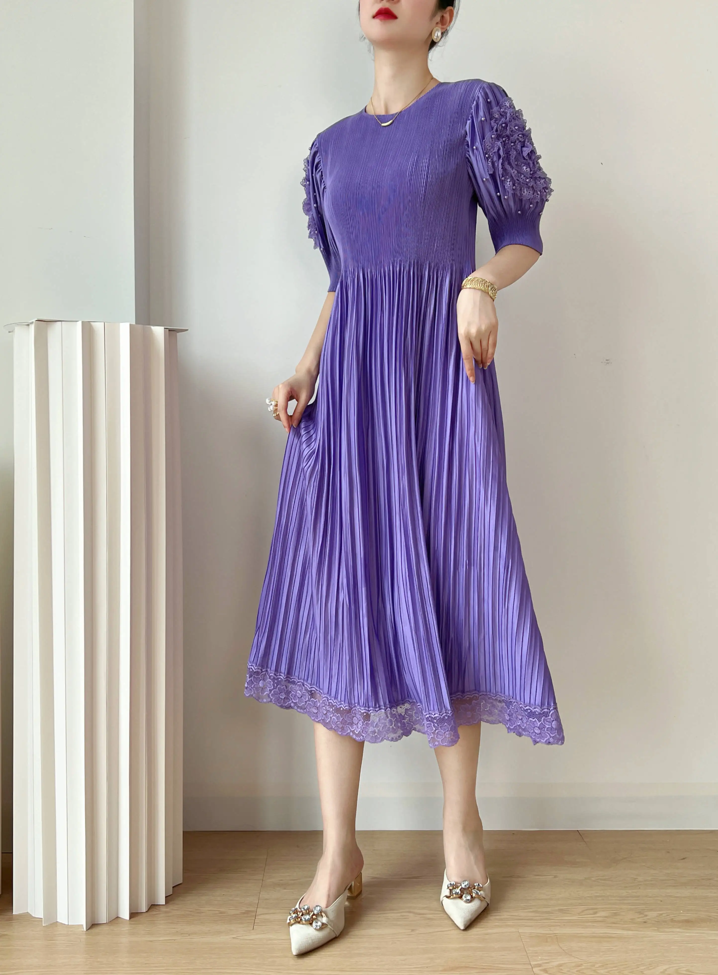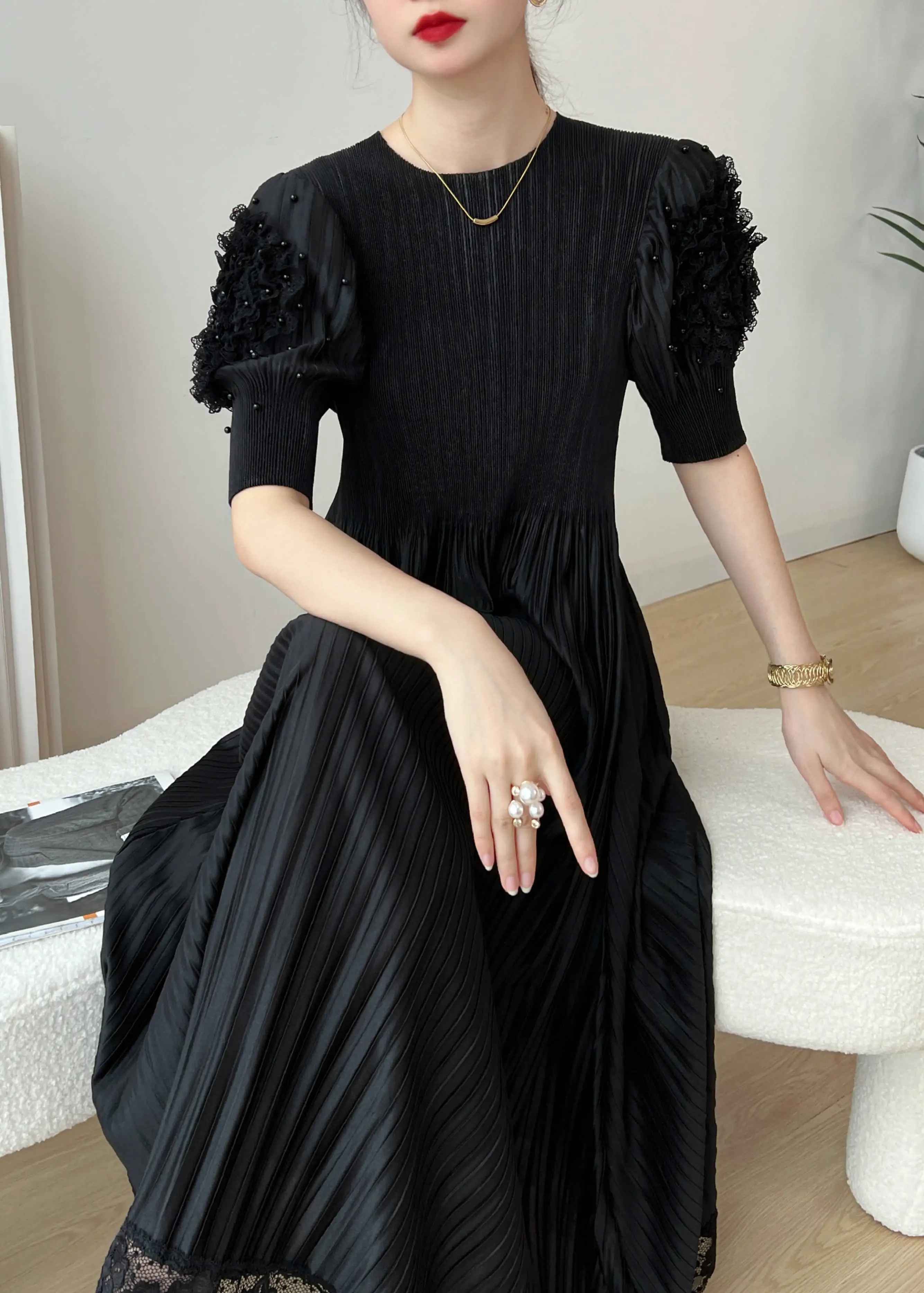 Introducing the YUDX Miyake 2023 Spring and Summer New Dress, a must-have for any fashion-forward woman. This dress features a pleated design, solid color, and a round neck for a timeless and elegant look. The loose fit and bubble sleeves add a touch of playfulness, making it perfect for any party or special occasion. Not only does it solve the problem of finding the perfect dress, but it also offers comfort and style in one. Made with premium materials, this dress is a best-seller and exclusive to our brand. Don't miss out on this limited-time opportunity to elevate your wardrobe with the perfect fit.