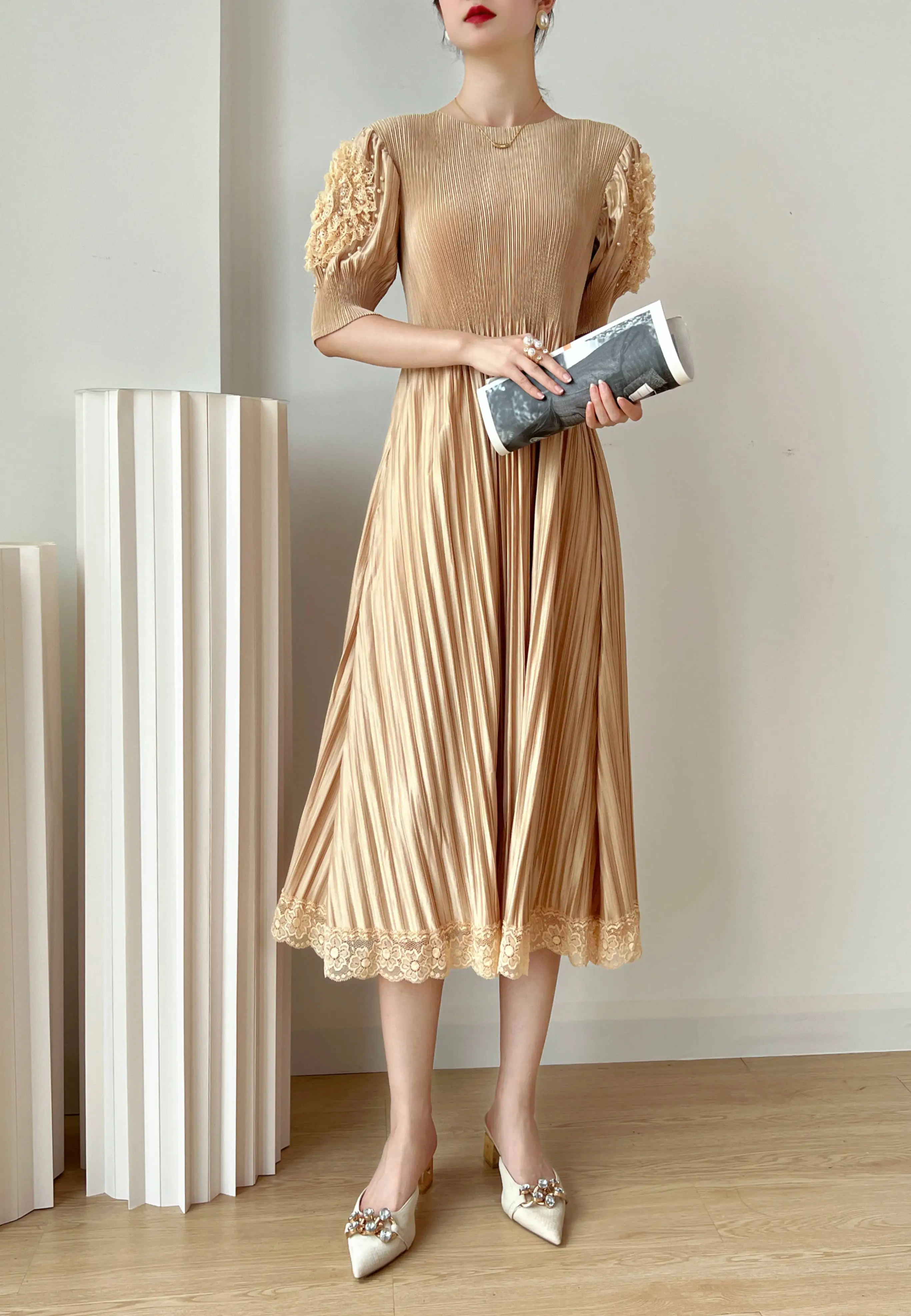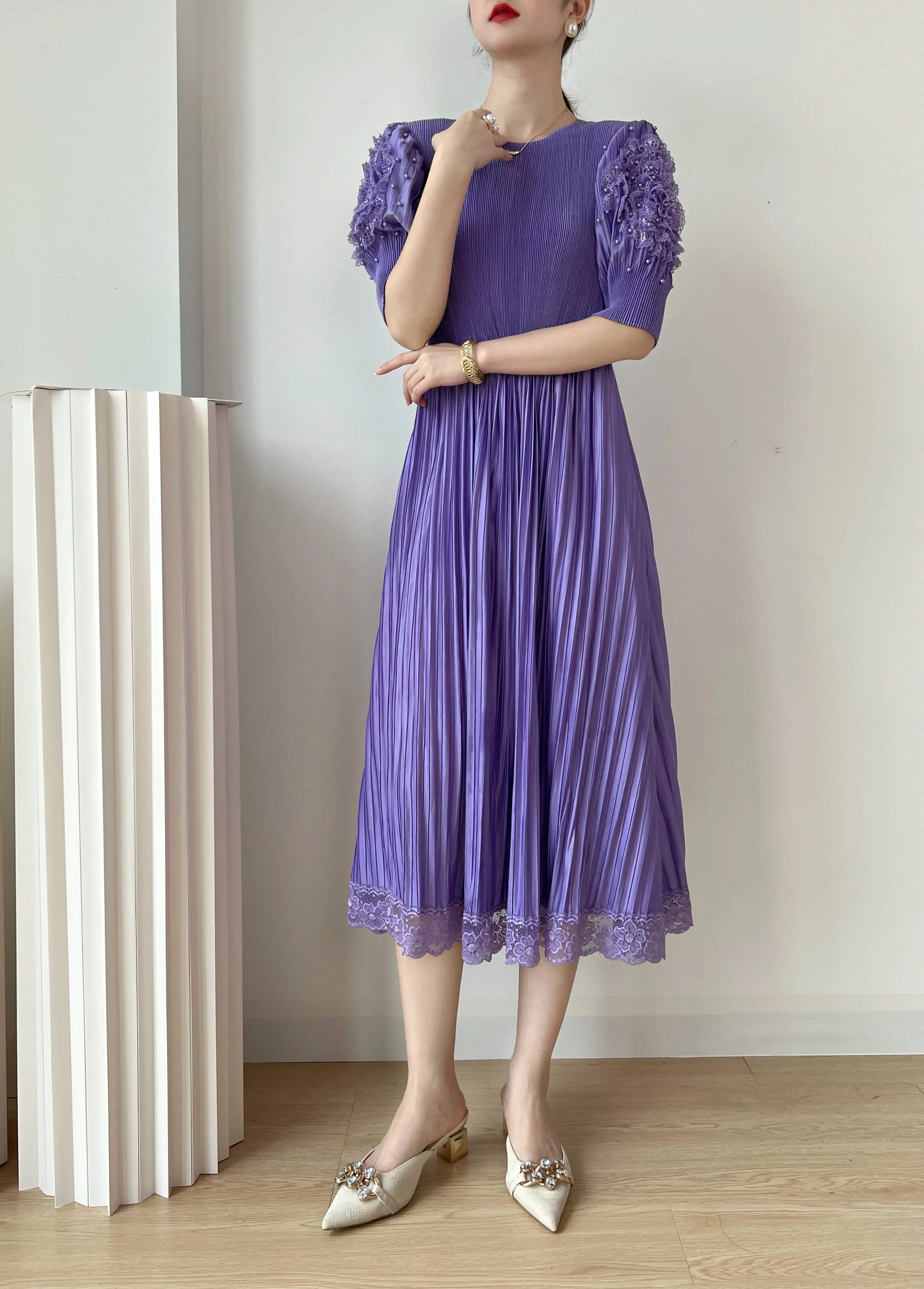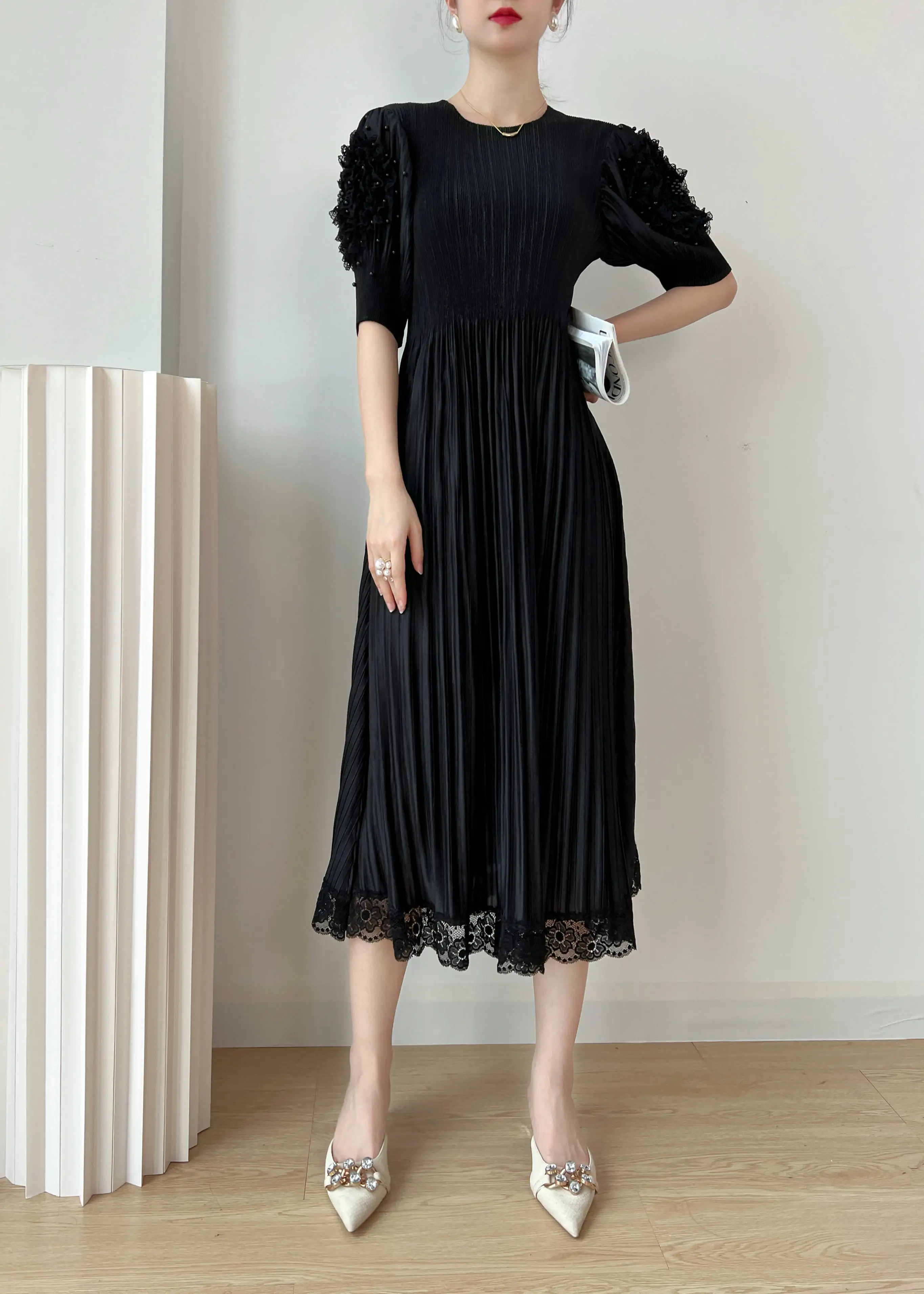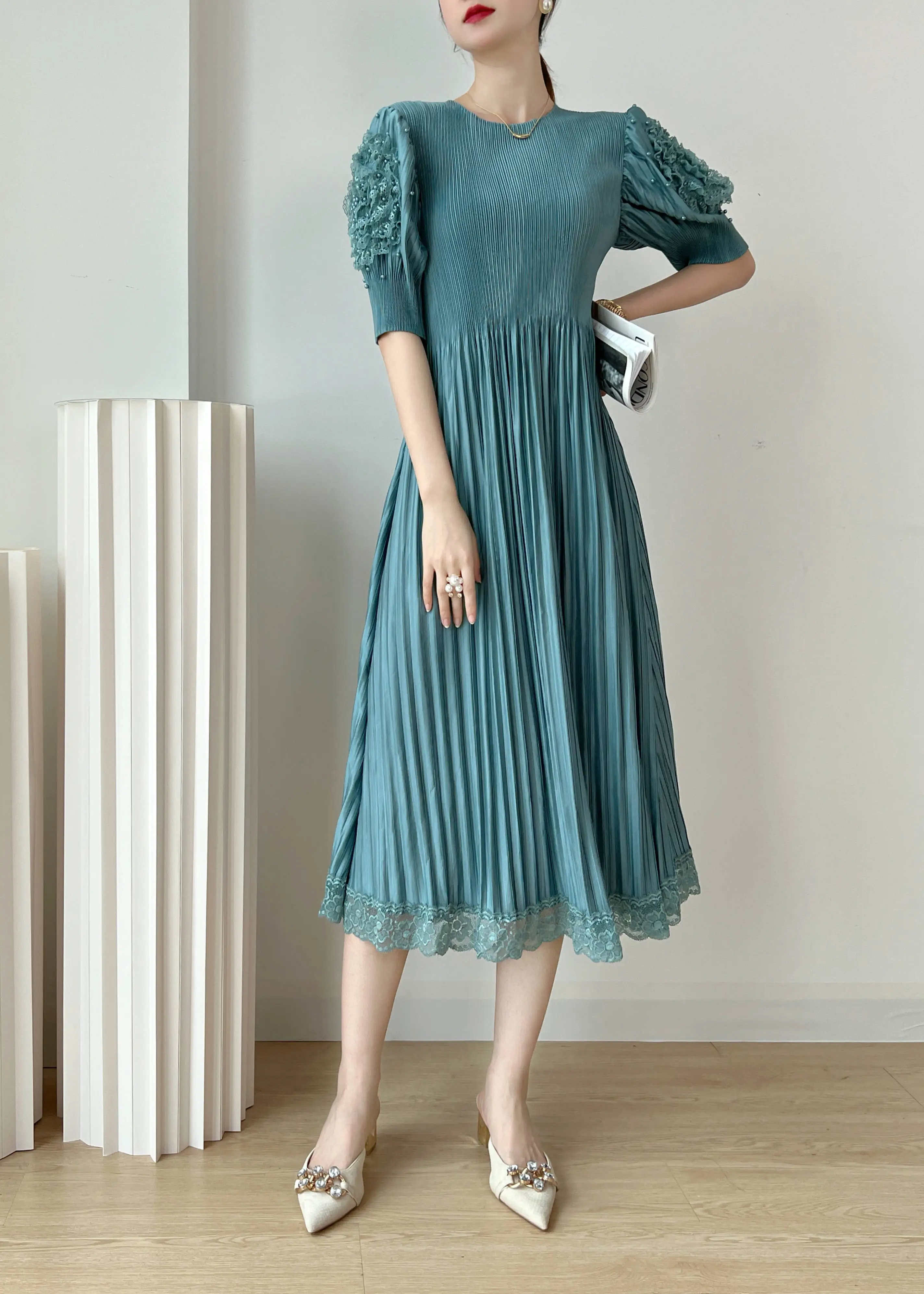 Introducing the YUDX Miyake 2023 Spring and Summer New Dress, a must-have for any fashion-forward woman. This dress features a pleated design, solid color, and a round neck for a timeless and elegant look. The loose fit and bubble sleeves add a touch of playfulness, making it perfect for any party or special occasion. Not only does it solve the problem of finding the perfect dress, but it also offers comfort and style in one. Made with premium materials, this dress is a best-seller and exclusive to our brand. Don't miss out on this limited-time opportunity to elevate your wardrobe with the perfect fit.