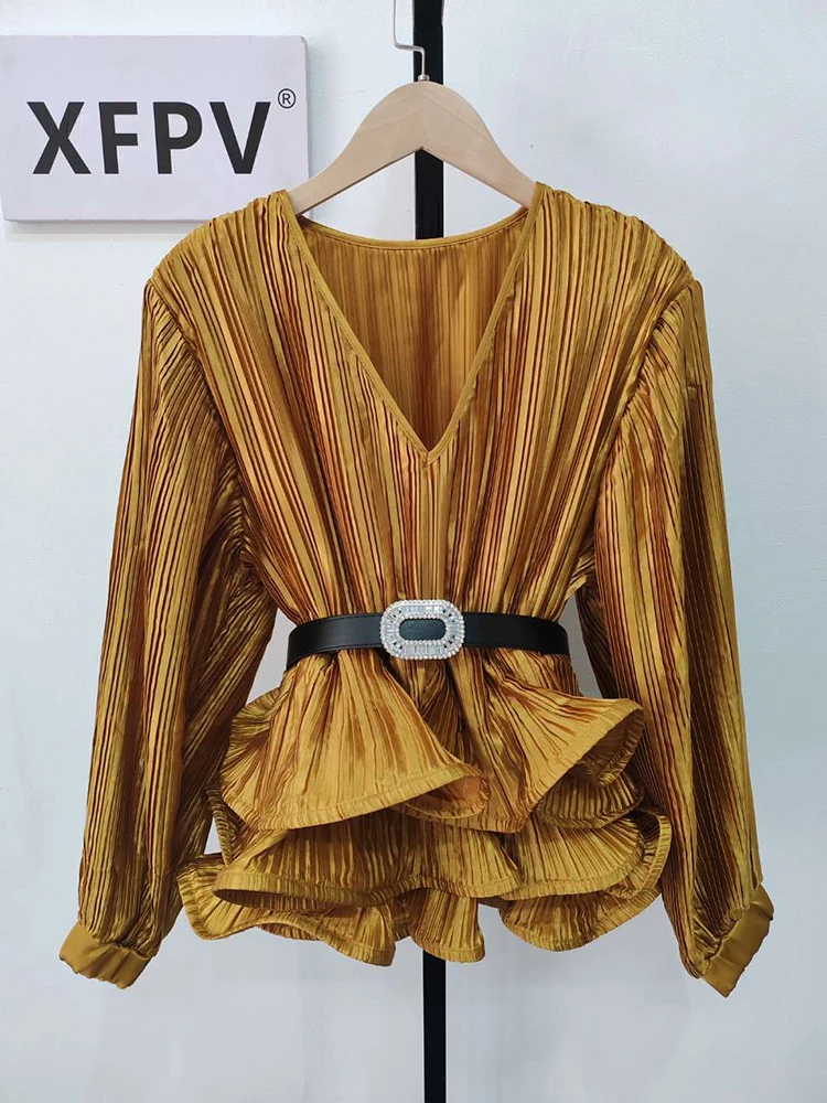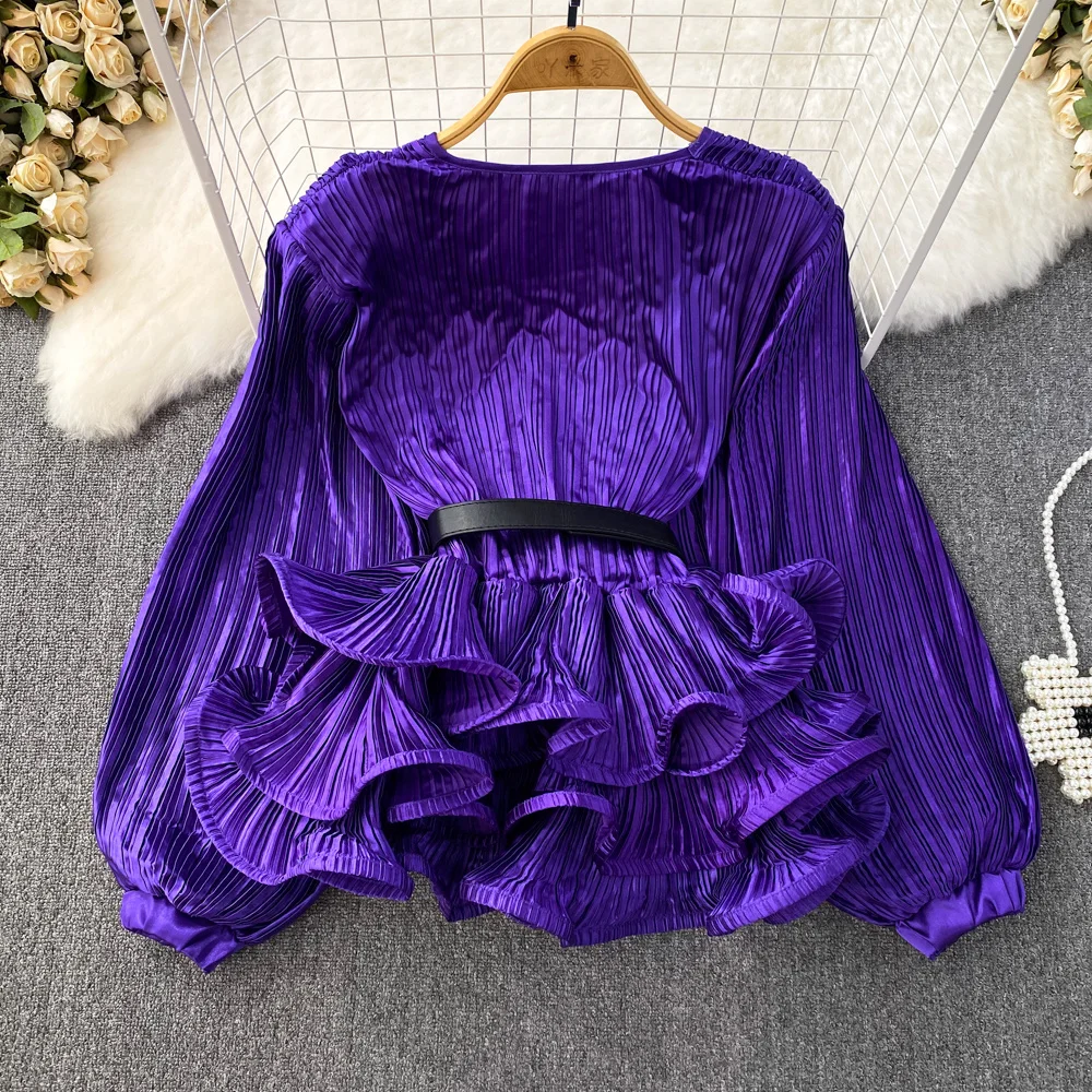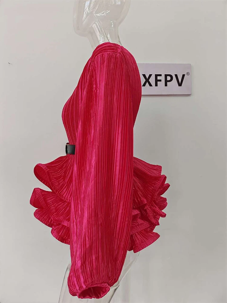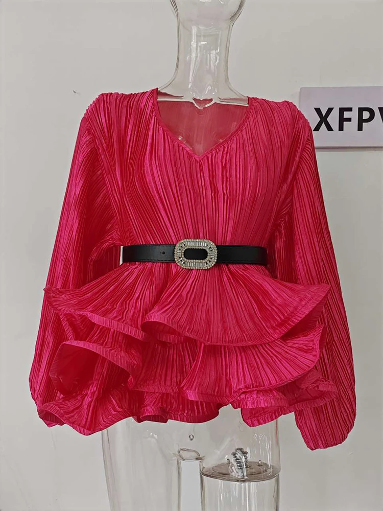 Introducing our latest fashion must-have, the XFPV Y2k Solid Belt Ruffle Patchwork Slim Lantern Sleeve Blouse. This elegant and chic top is designed to enhance your inner charm and elevate your style. With its tasteful design and impeccable fit, this blouse is perfect for any occasion. Made from high-quality materials, it is both comfortable and durable. Its unique ruffle patchwork and slim lantern sleeves make it stand out from other basics shirts, giving you a stylish and sophisticated look. Available in one size, it is a perfect fit for sizes 110-180. Don't miss out on this limited time offer and add this best-selling blouse to your wardrobe today!