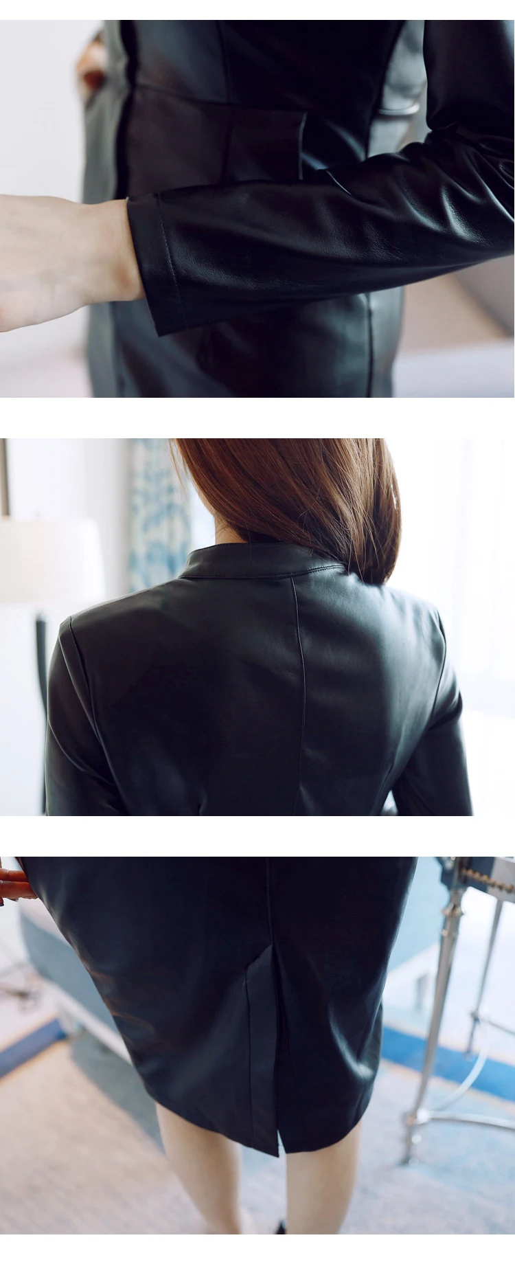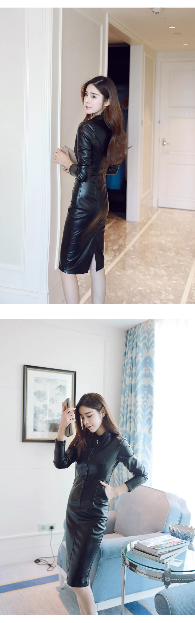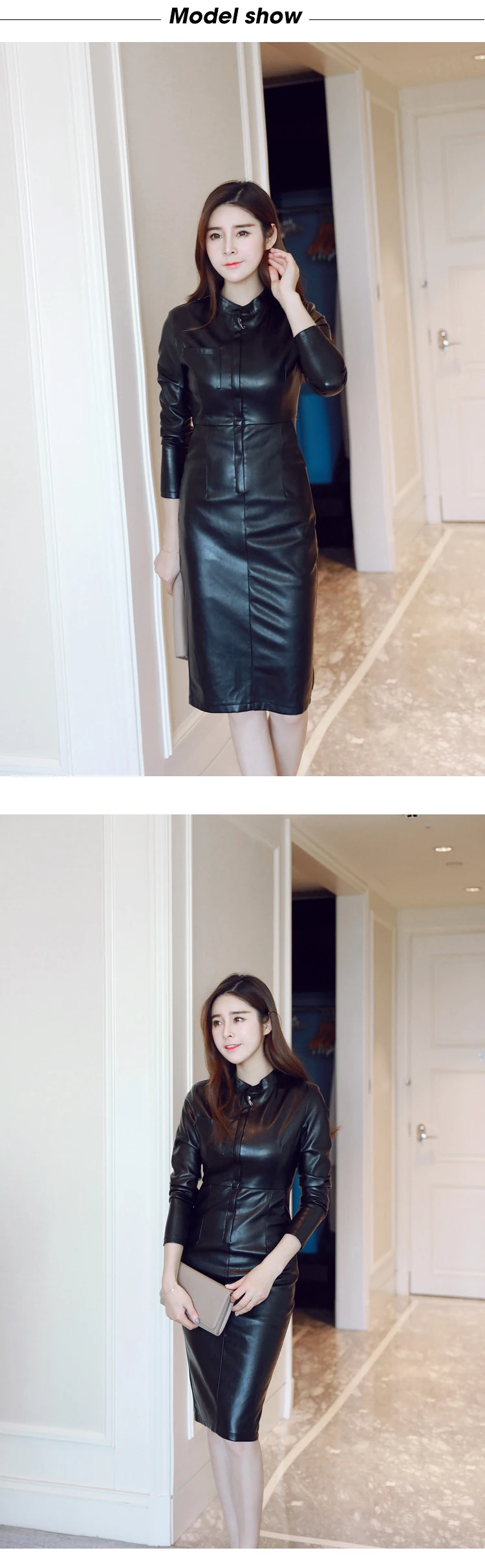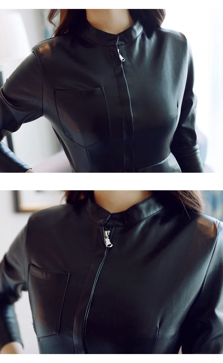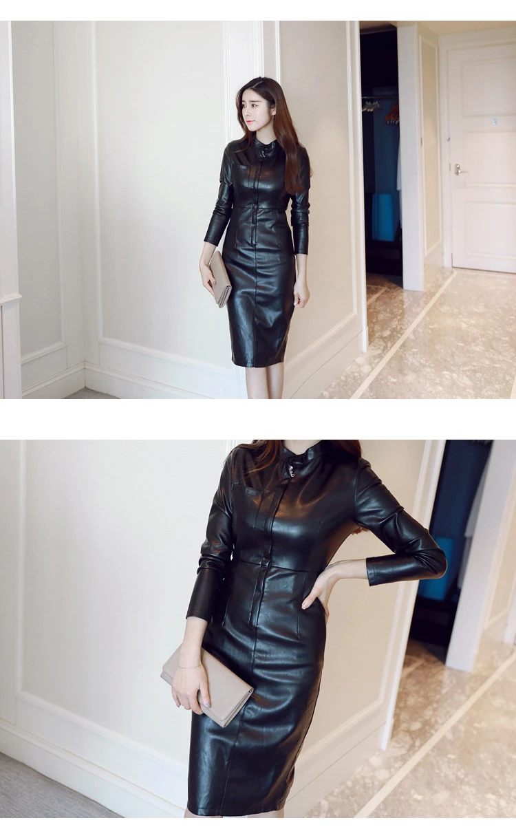 2023 Women Midi Dress Classic Elegant PU Leather Black Robe Zipper Long Sleeve Pockets Wrap Hip Clothes Office Street Vestidos
