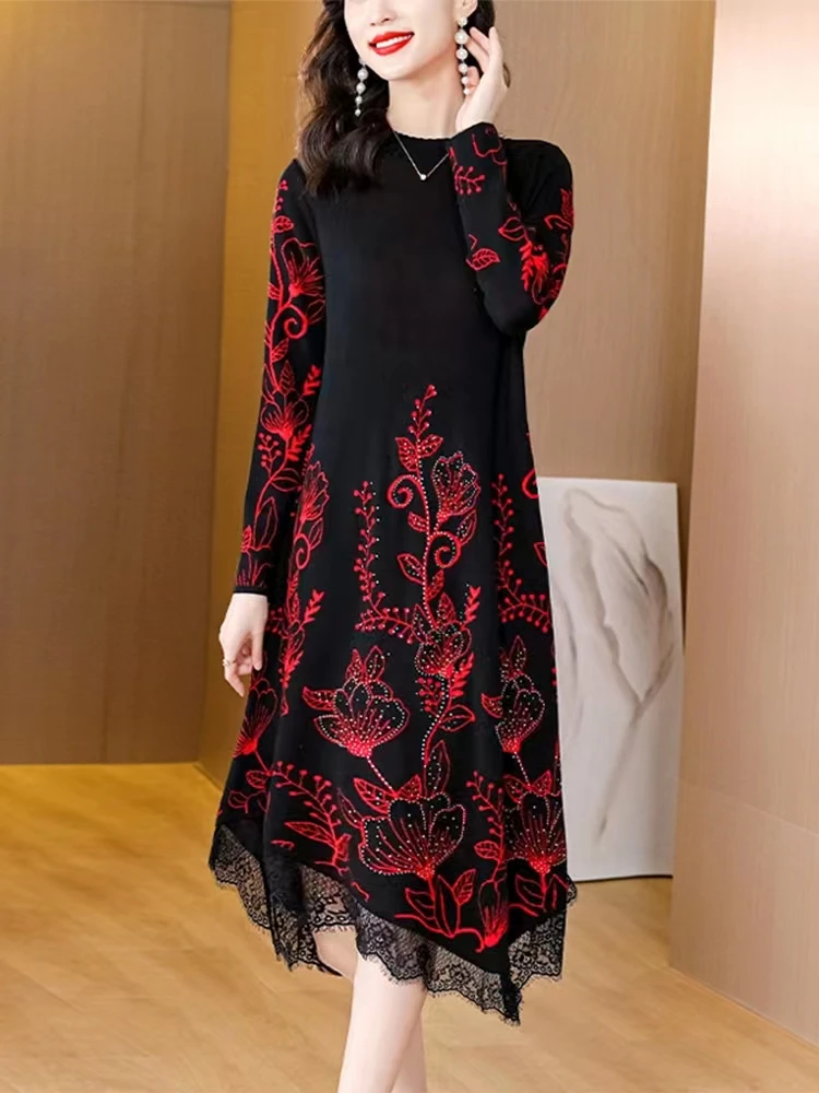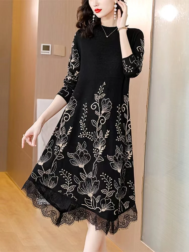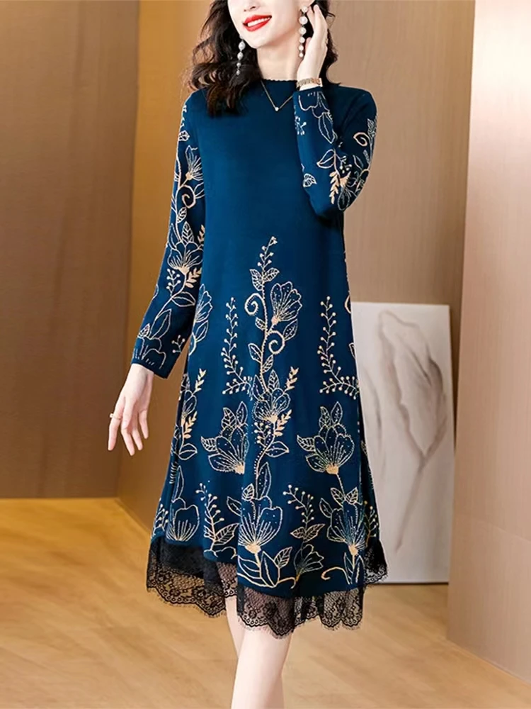 2024 Chic Blue Floral Knit Pullover Sweater - Luxury Lace Ruffles for Women