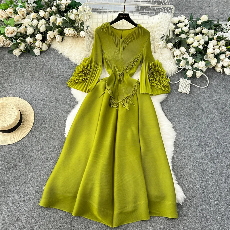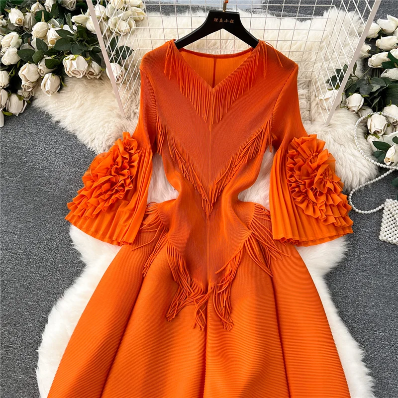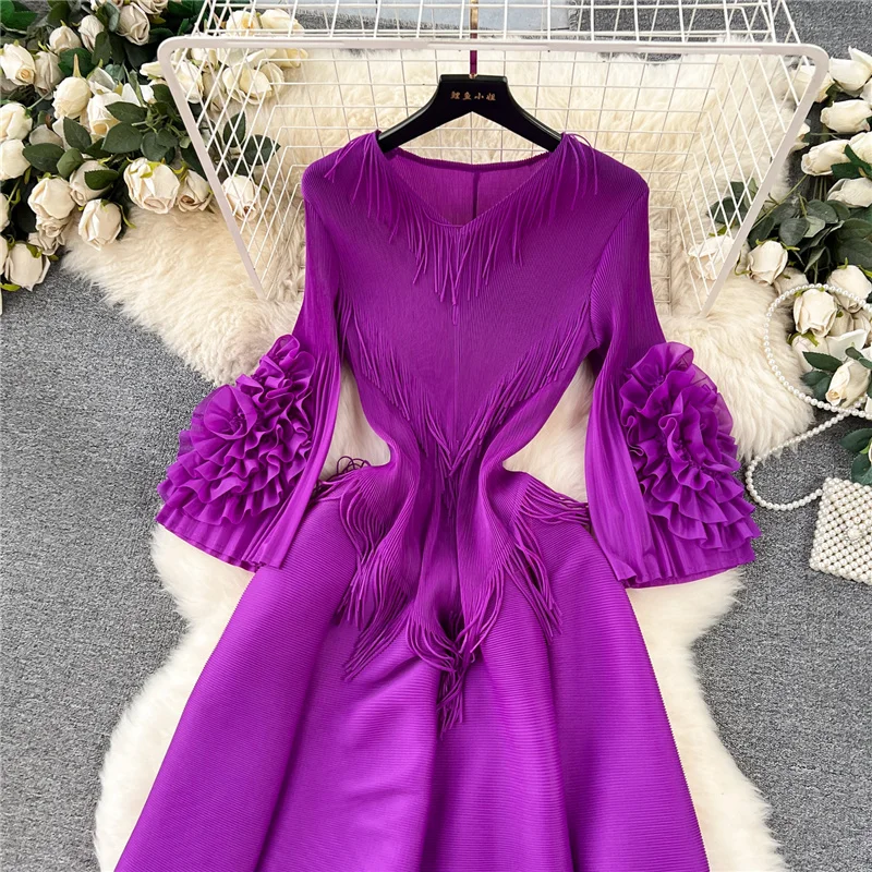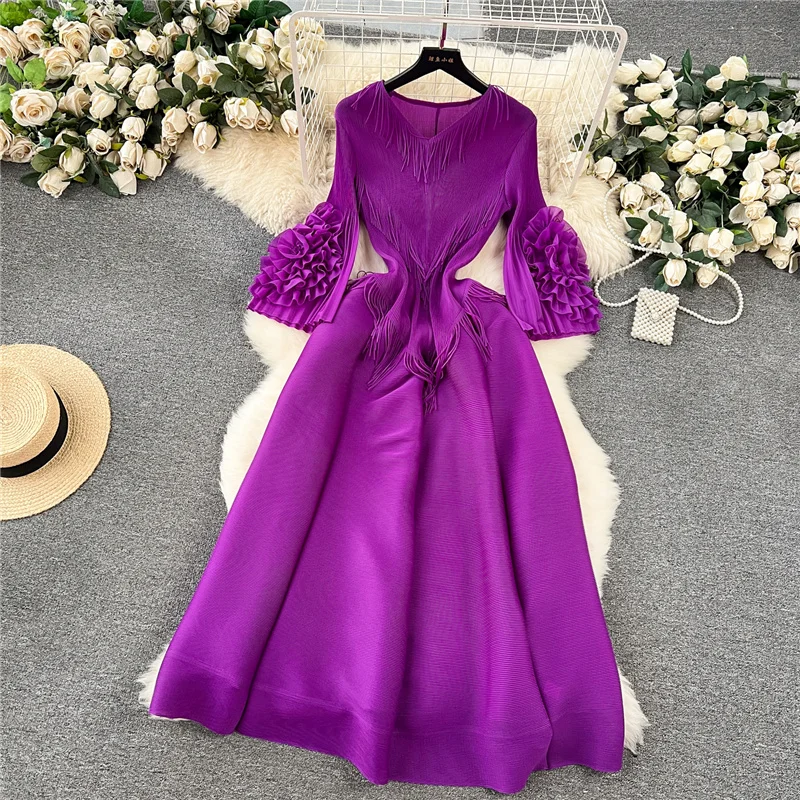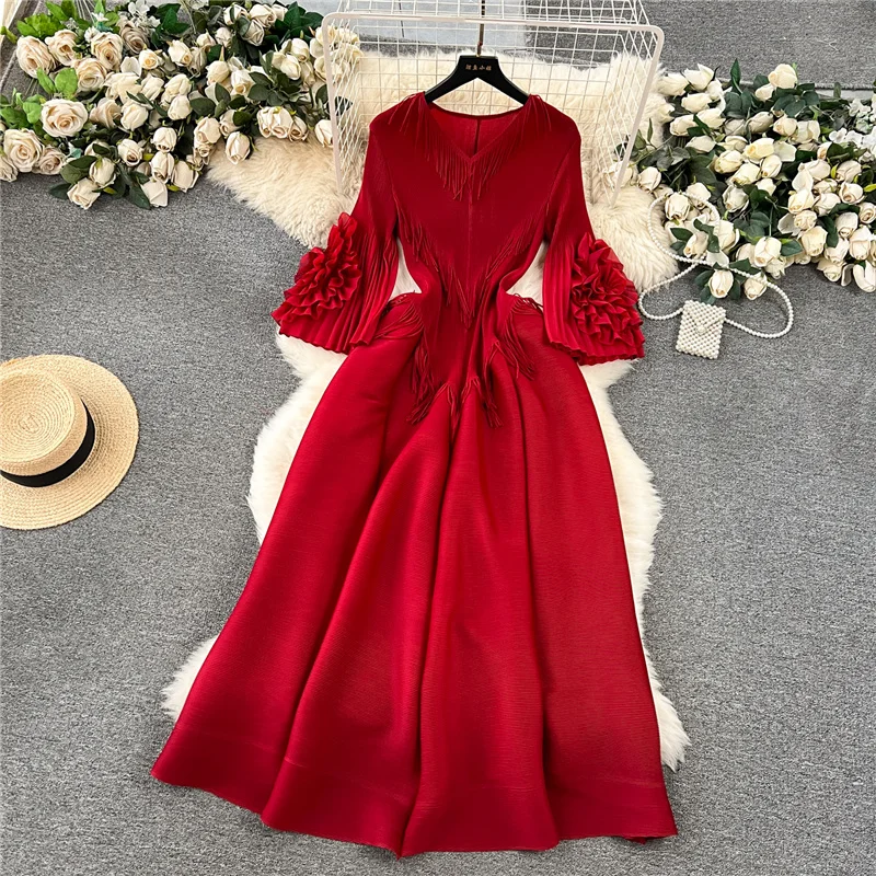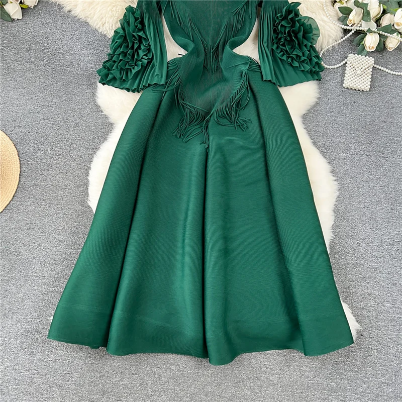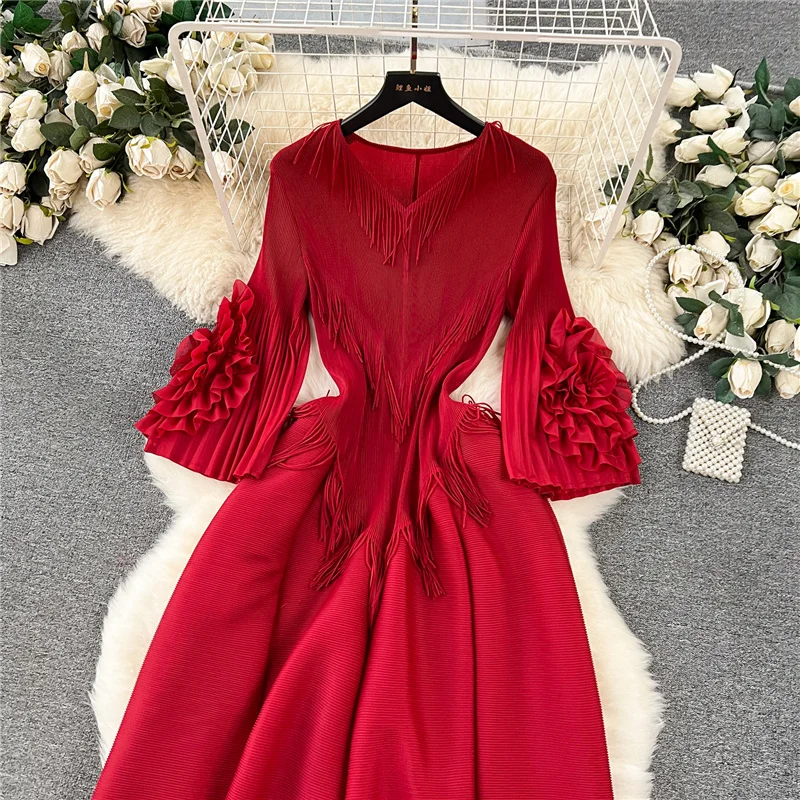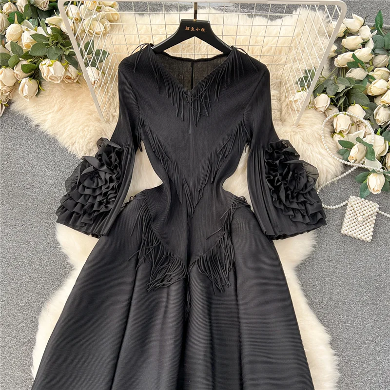 2024 Elegant Miyake V-Neck A-line Dress with Tassel and 3D Flower Detail