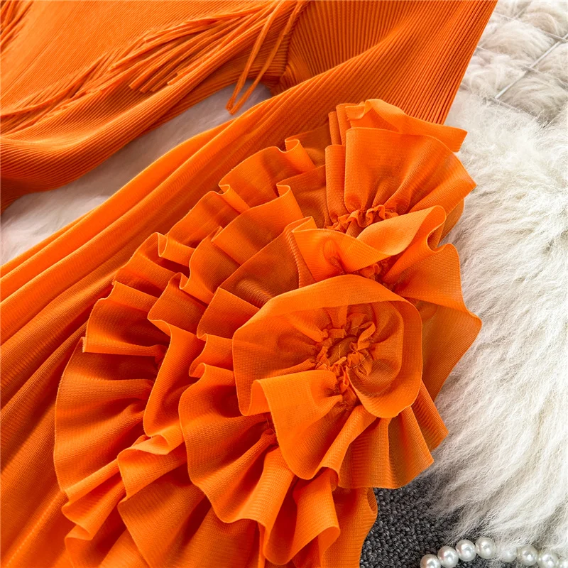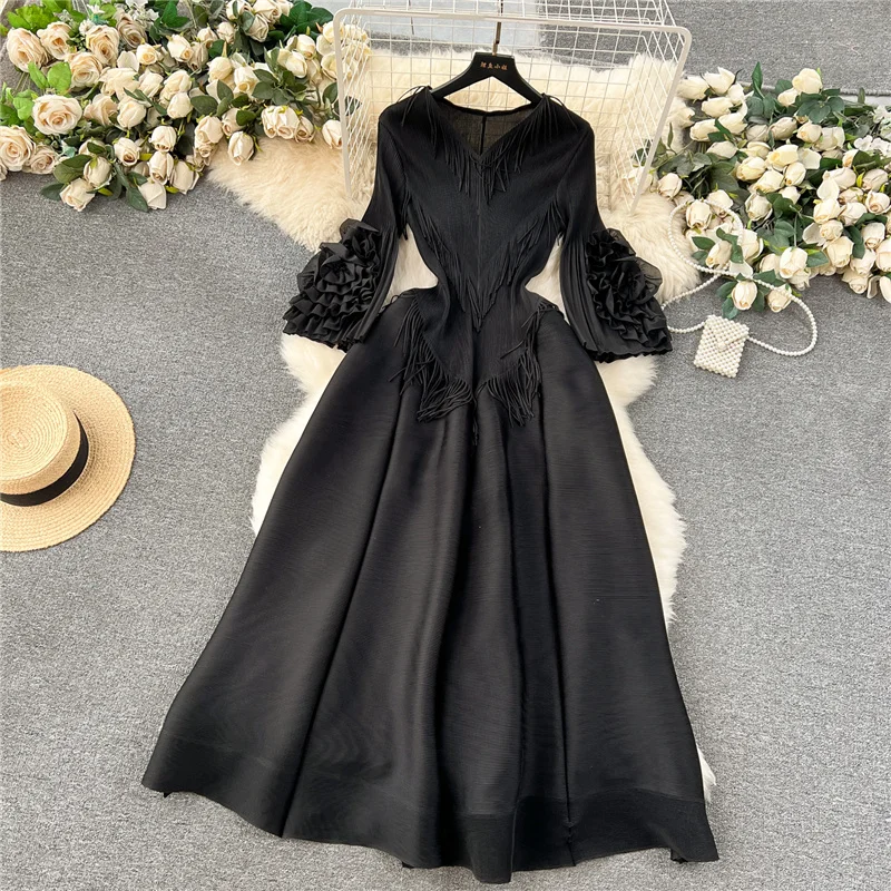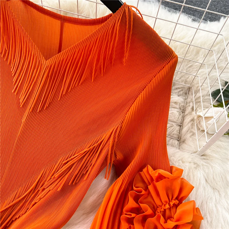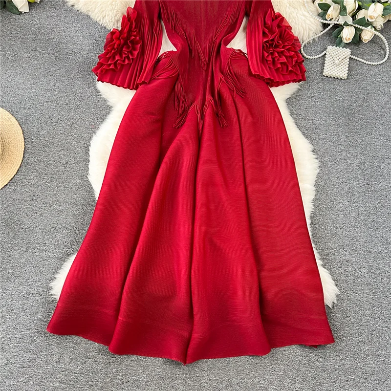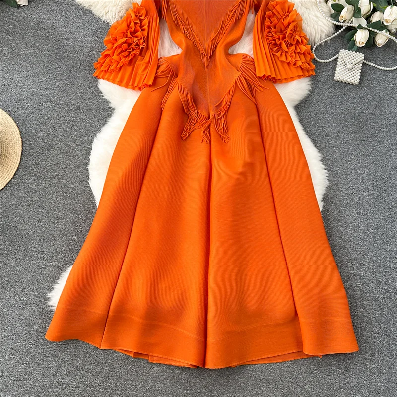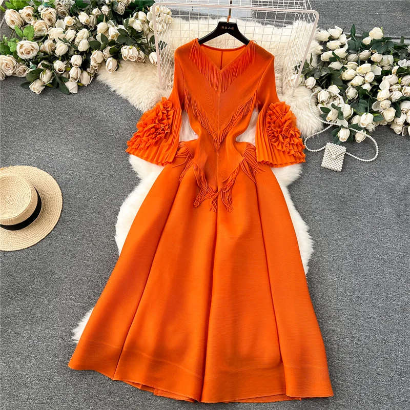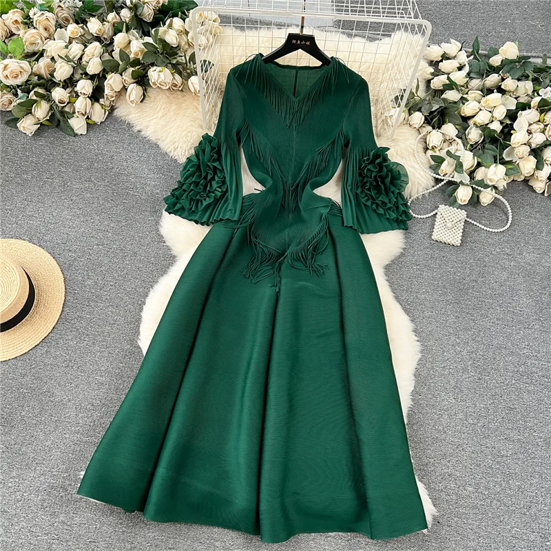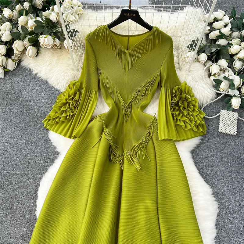 2024 Elegant Miyake V-Neck A-line Dress with Tassel and 3D Flower Detail