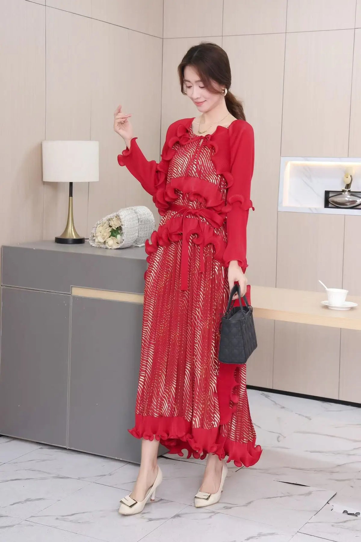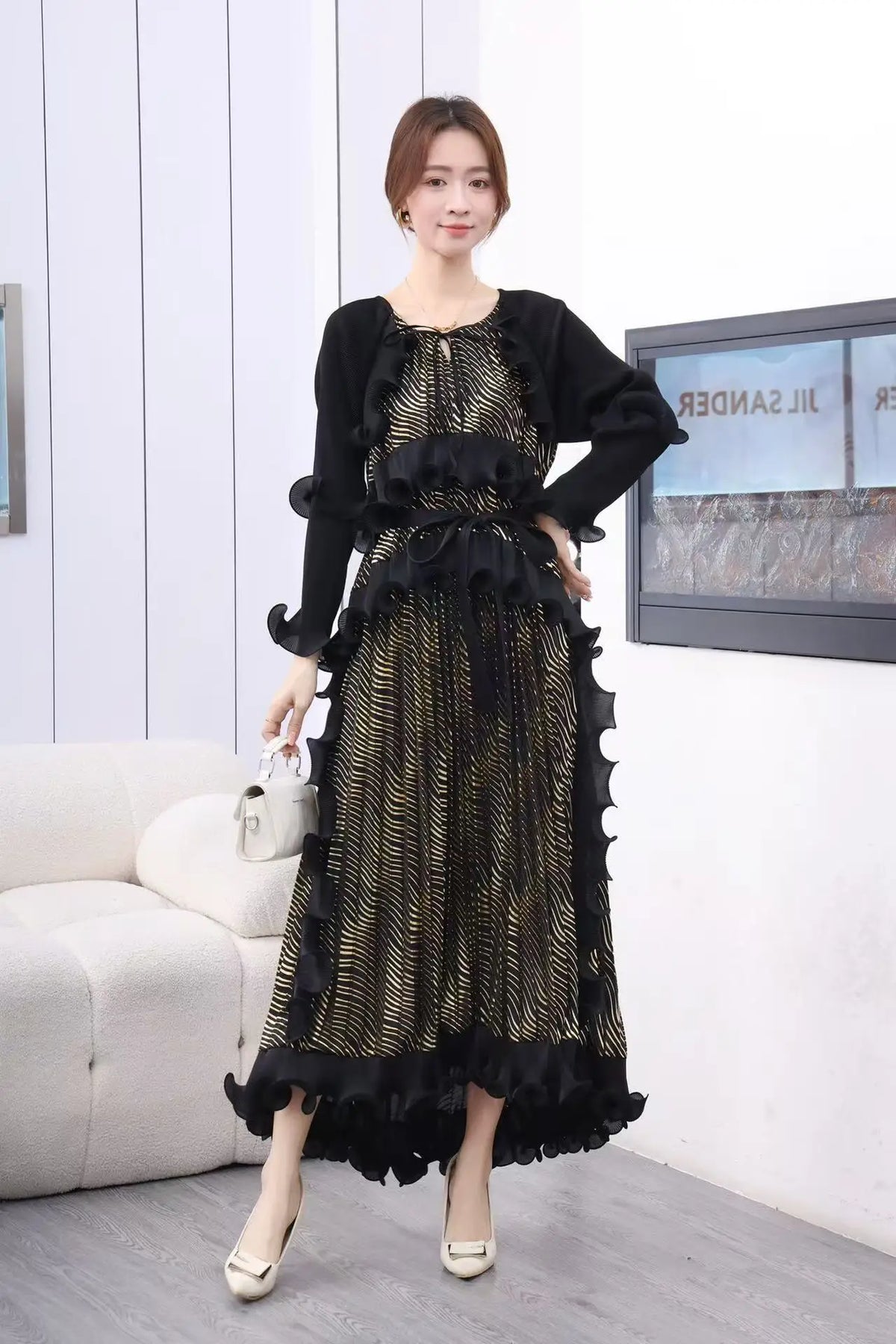 - Luxurious Miyake pleating for a striking silhouette.