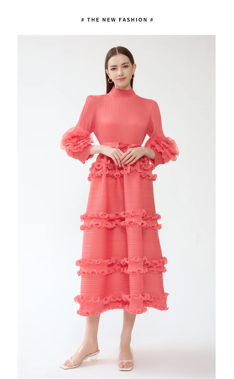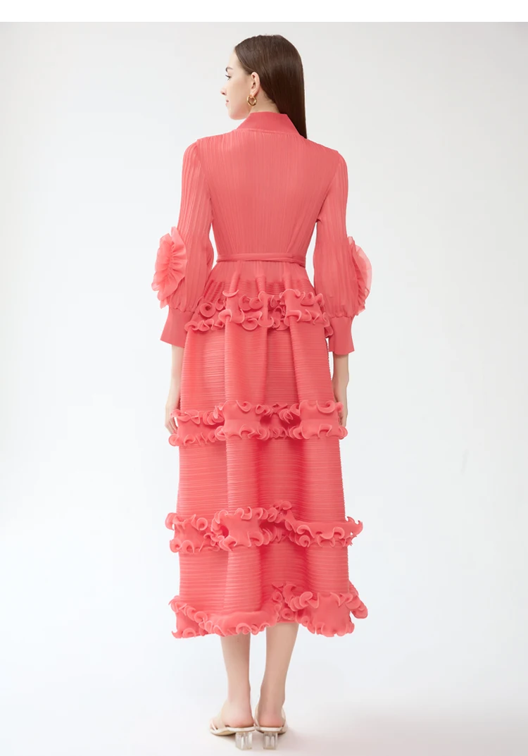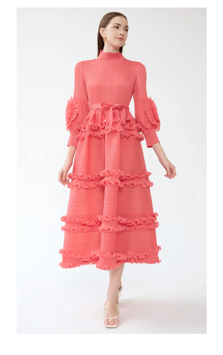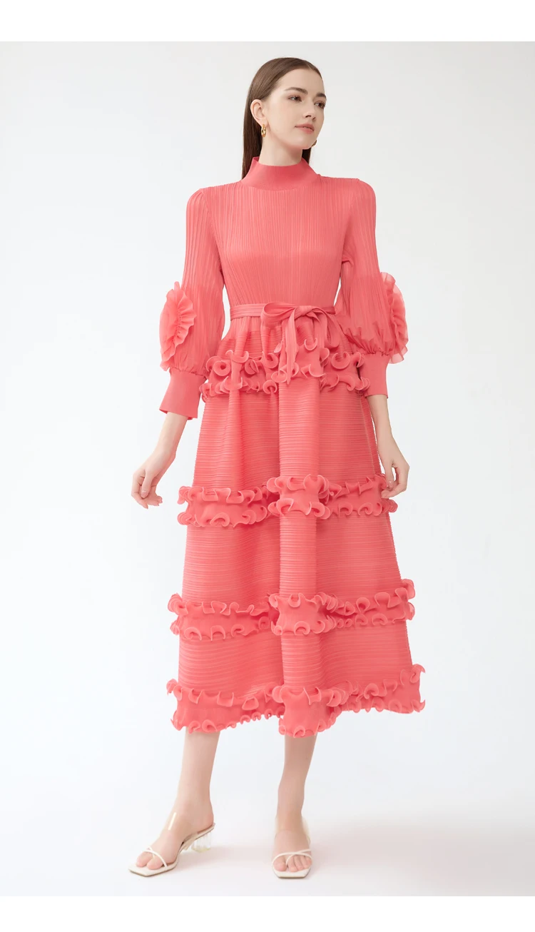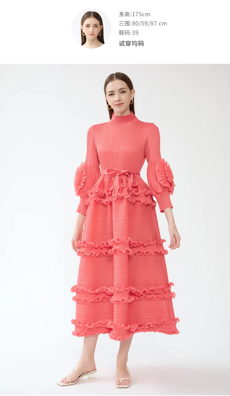 Introducing our newest addition to the 2024 collection, the Miyake Pleated Wave Cut Belt Elastic Waist Petal Sleeve Dress. Designed by our original designer, this dress features 3D appliques and a unique wave cut belt that accentuates your waistline. Made with high-quality materials, this dress is available in plus sizes and is perfect for any occasion. Its pleated design and petal sleeves add a touch of elegance, while the elastic waist ensures a comfortable and perfect fit. Wash it gently for easy maintenance and enjoy the lightweight feel. Upgrade your wardrobe with this premium dress, a limited time best seller that solves all your outfit dilemmas.