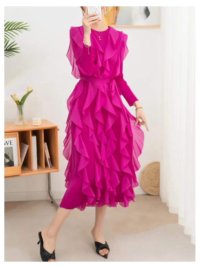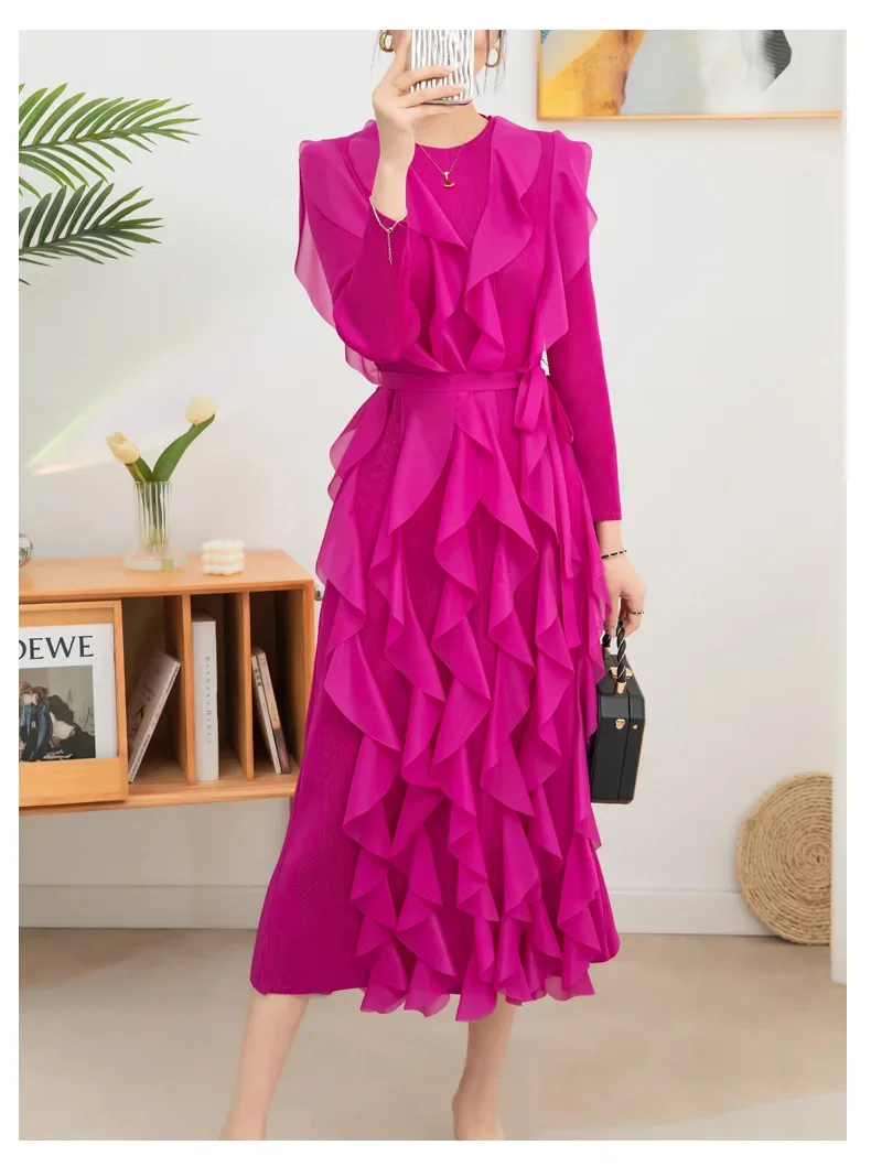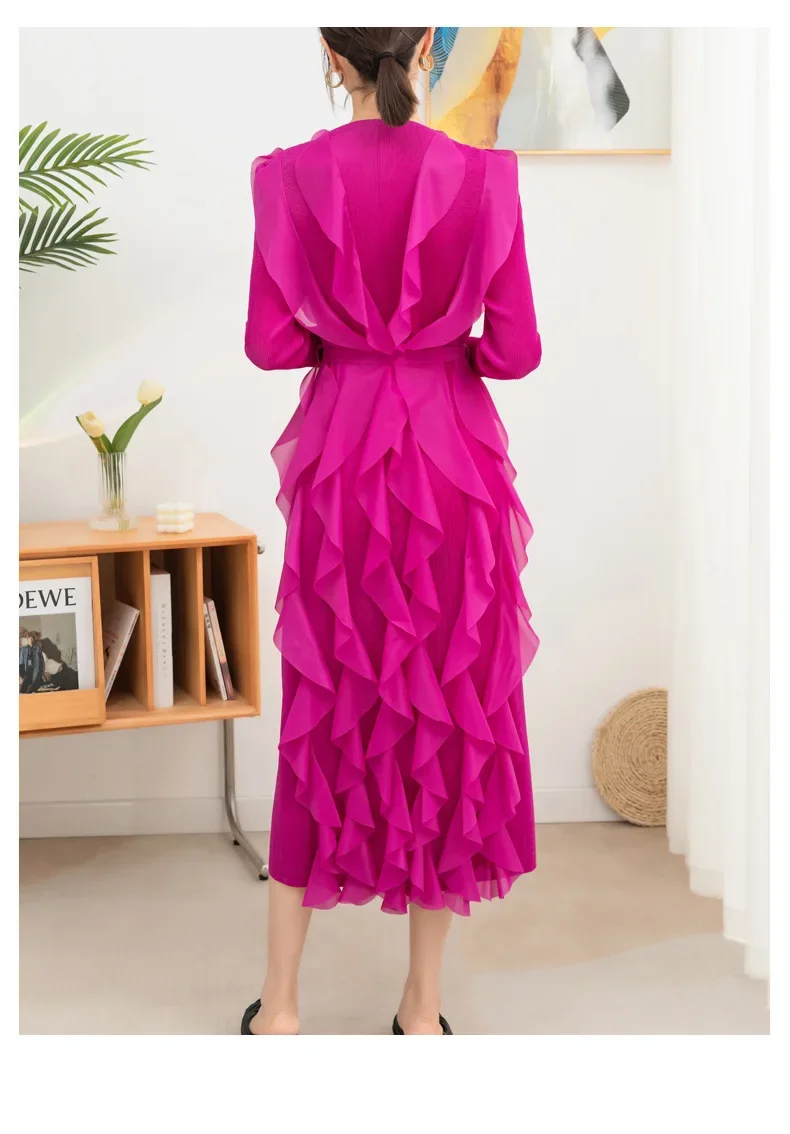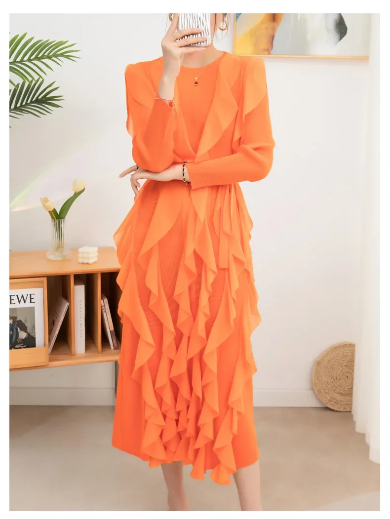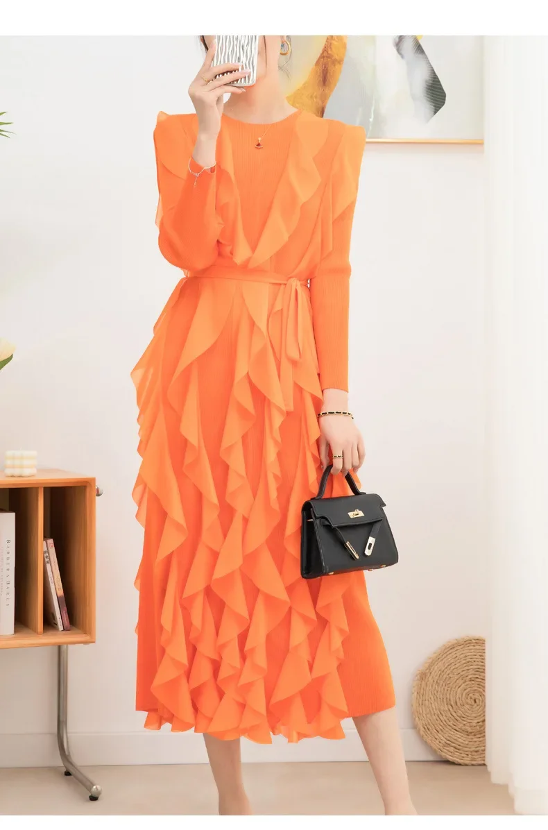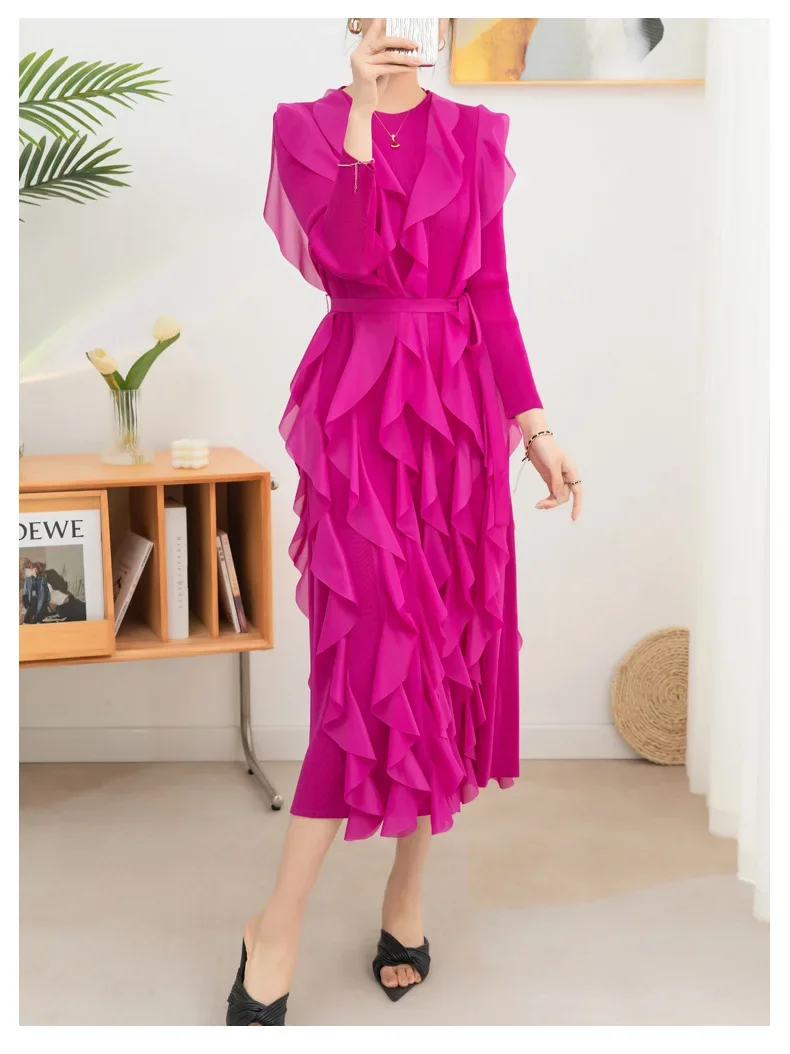 Introducing the YUDX Miyake Pleated Ruffles Dress, your go-to choice for a chic and stylish look this spring. With full sleeves and a round collar, this dress exudes elegance and sophistication. The pleated ruffles add a touch of femininity, while the included belt cinches your waist for a flattering silhouette. Available in a solid color, this dress is perfect for evening parties and special occasions. Made with premium quality materials, it offers a perfect fit for women of all sizes. Don't miss out on this limited time exclusive design and upgrade your wardrobe with the YUDX Miyake Pleated Ruffles Dress.