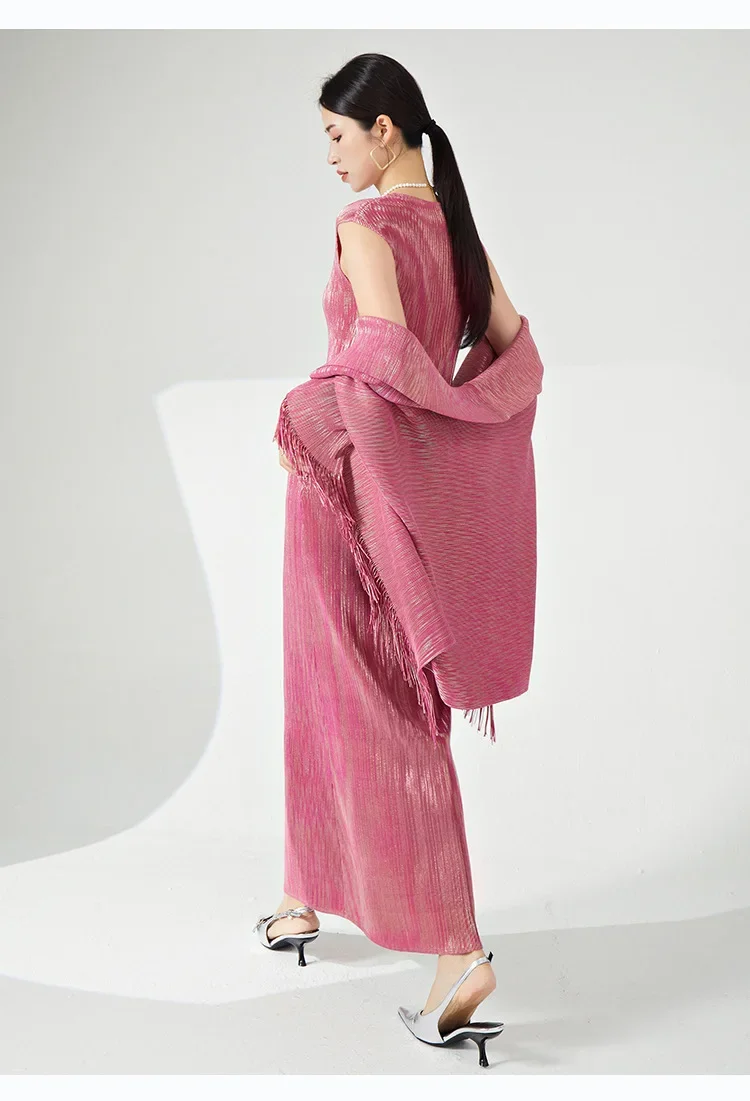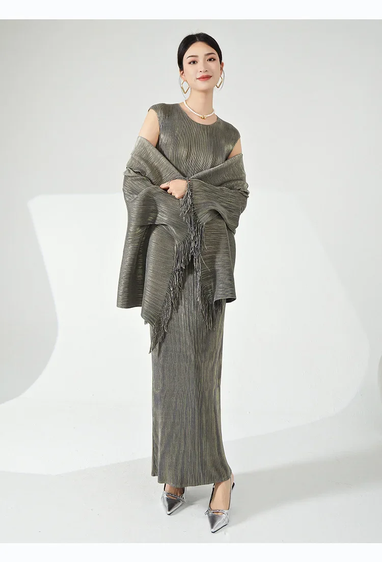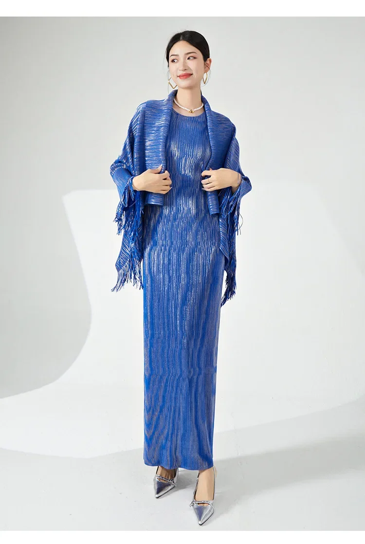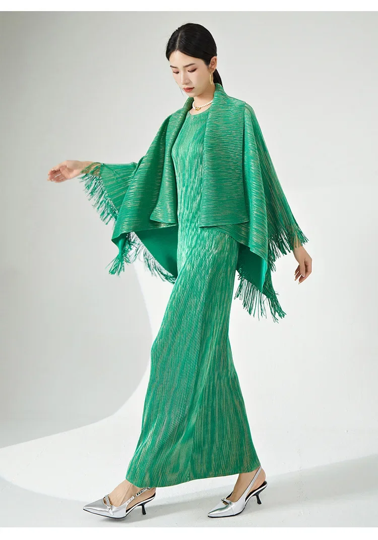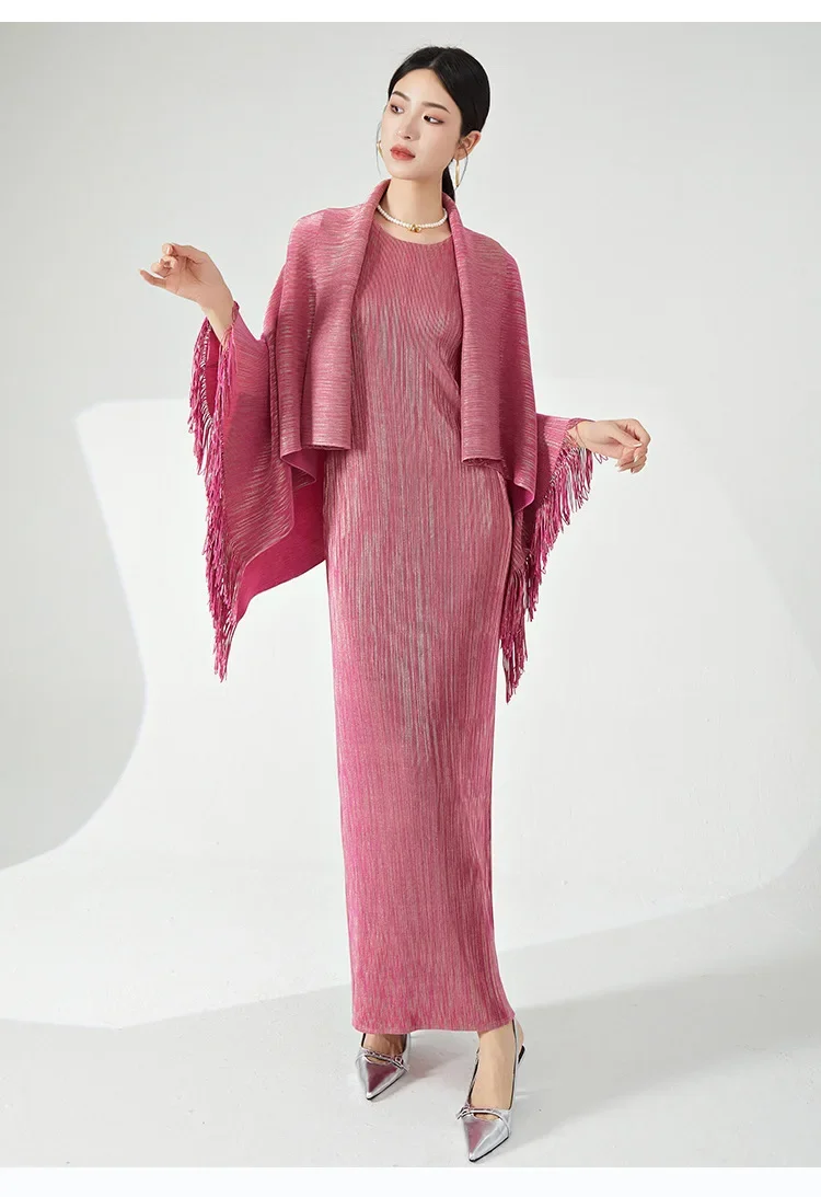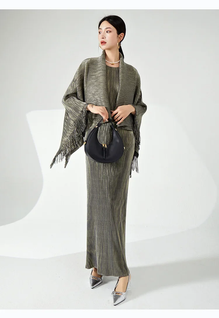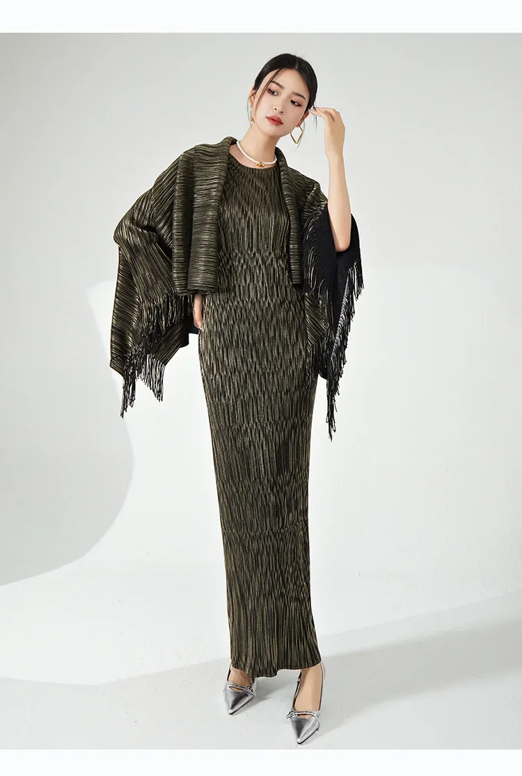 🧥 What it is - This set includes a stylish tassel shawl coat and a flattering maxi slim dress, perfect for any special occasion.