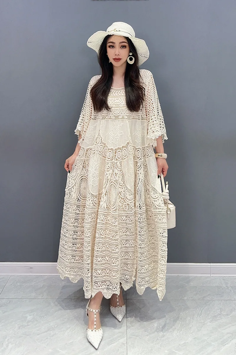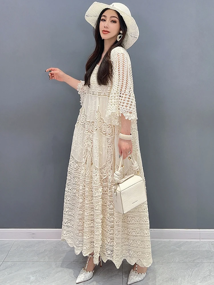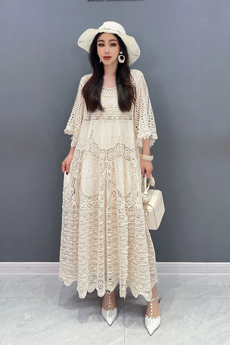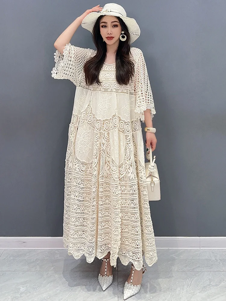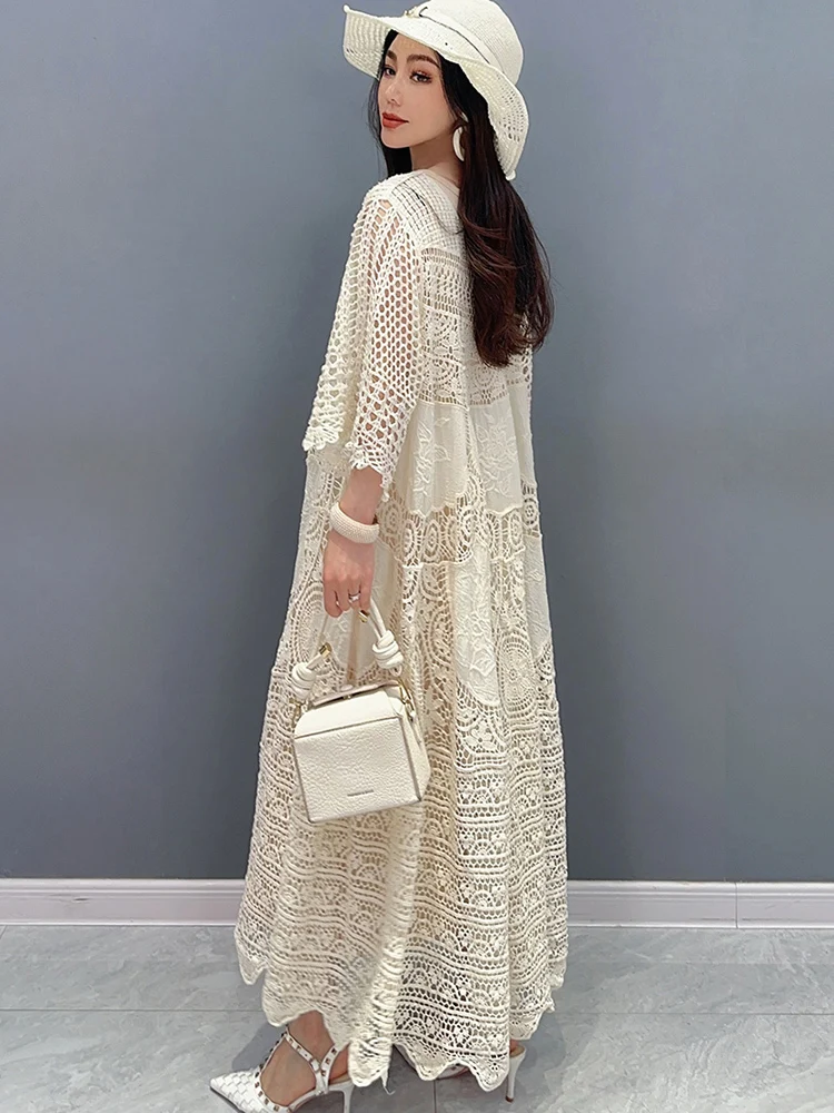 Introducing our SHENGPALAE Lace Dress, the perfect addition to your wardrobe for the upcoming 2024 Spring/Summer season. This elegant dress features a delicate lace design with mid sleeves and a large hem, giving it an effortlessly chic look. The loose fit and hollow out details make it a comfortable and stylish option for any occasion. Made with high-quality materials, this dress is designed to solve the problem of finding the perfect balance between fashion and comfort. Plus, its unique design and limited availability make it a must-have for any fashion-forward individual. Don't miss out on this best-selling item and add it to your cart today!