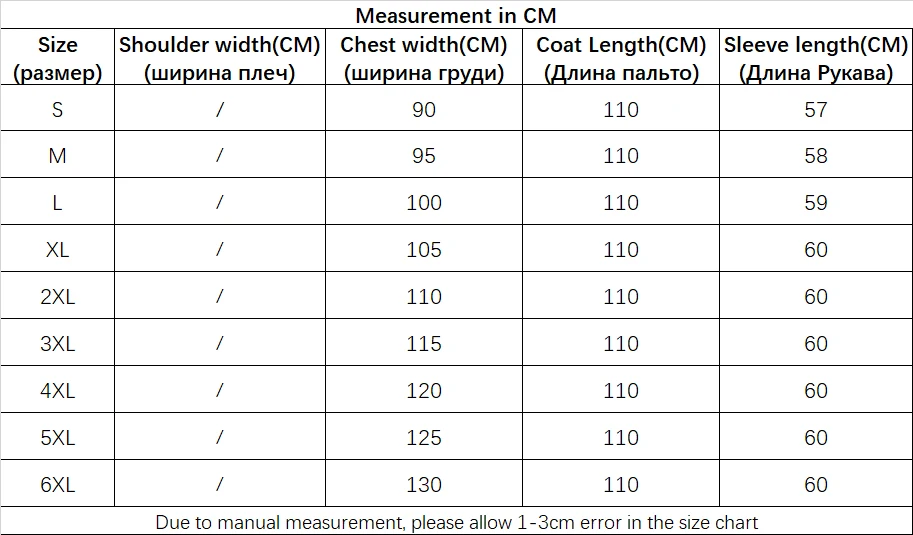 Please choose coat bust size 8-10 cm larger than your body's bust