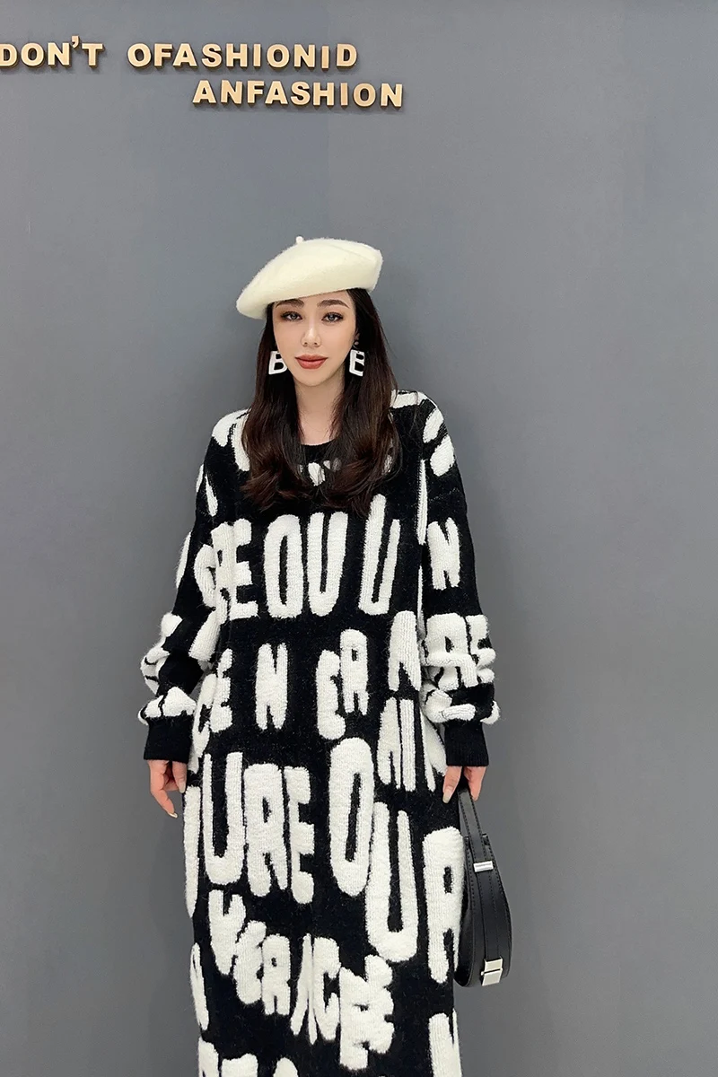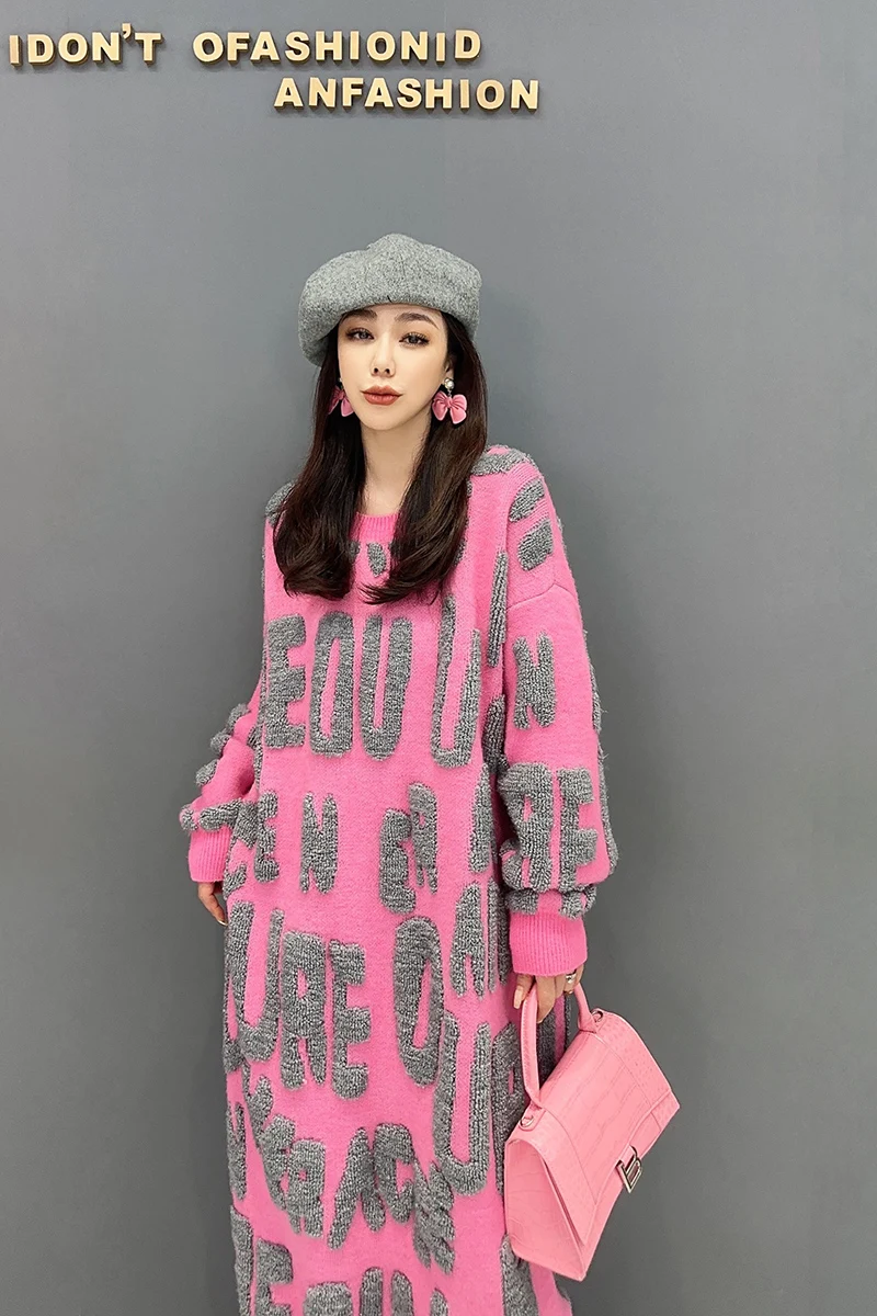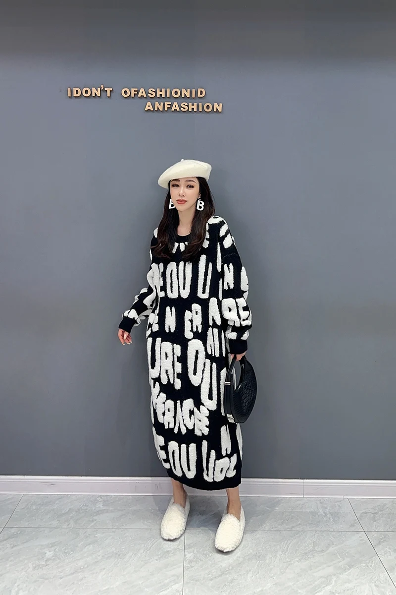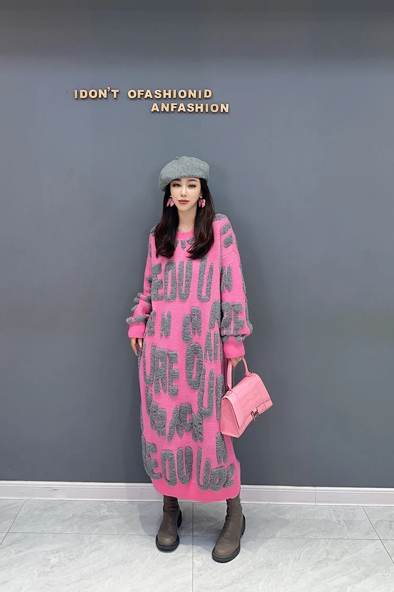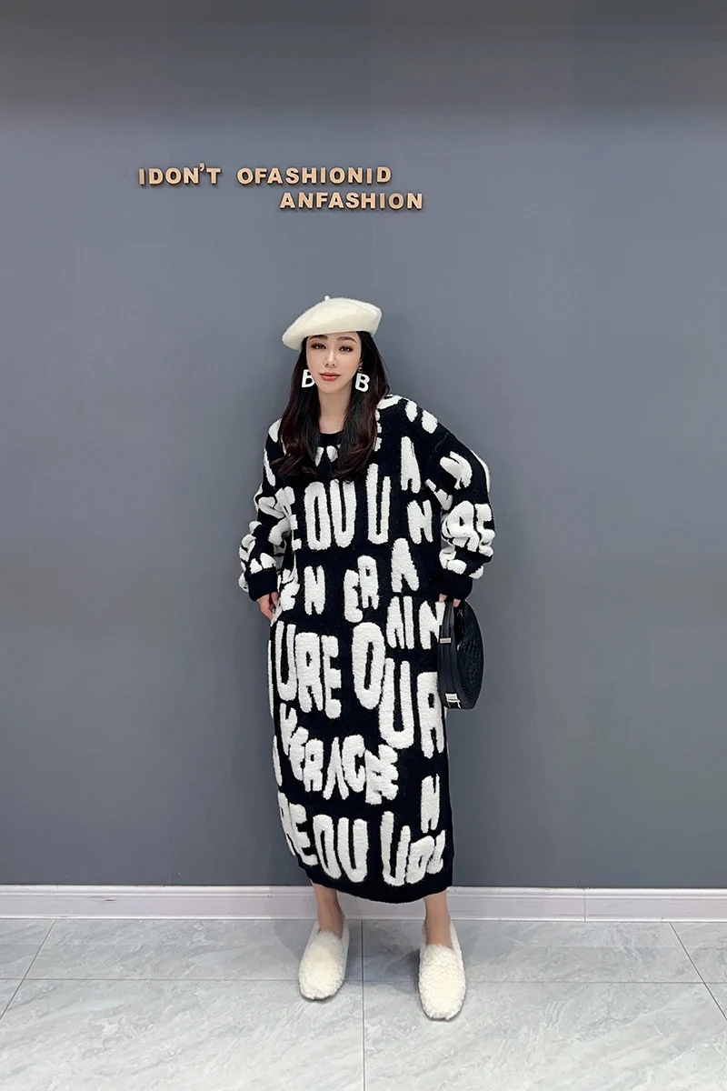 Autumn 2024 Versatile Knit Dress for Women - SHENGPALAE Villus Letter Print - O-neck - Straight - 5R7812