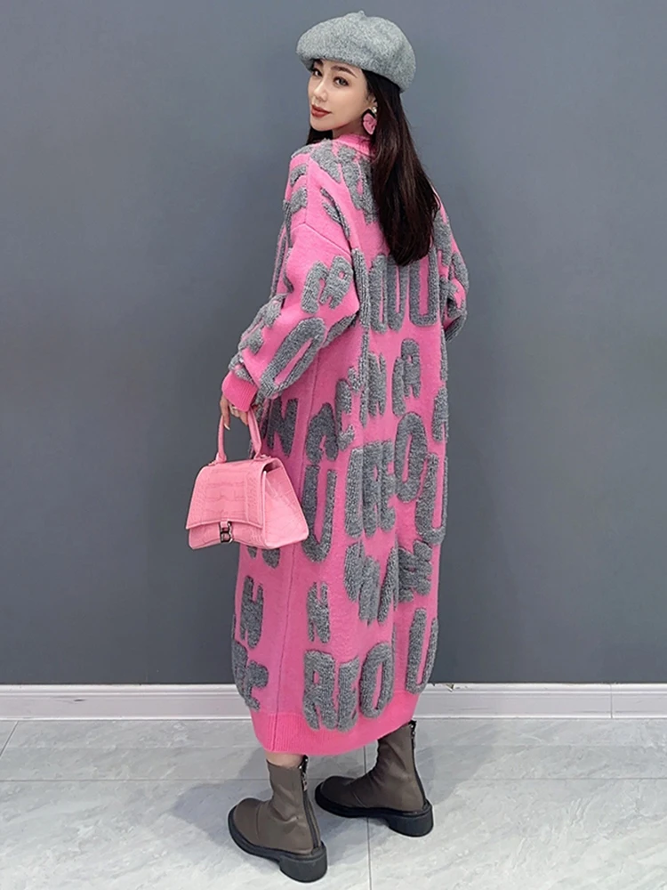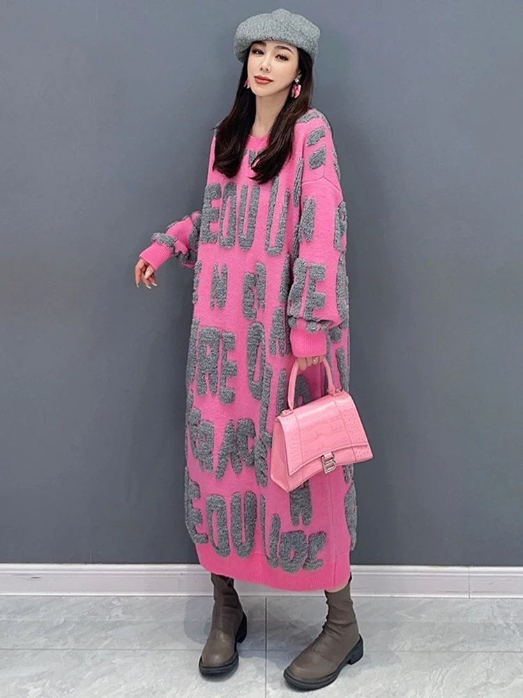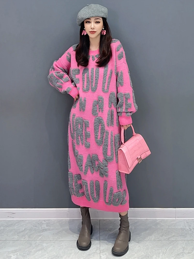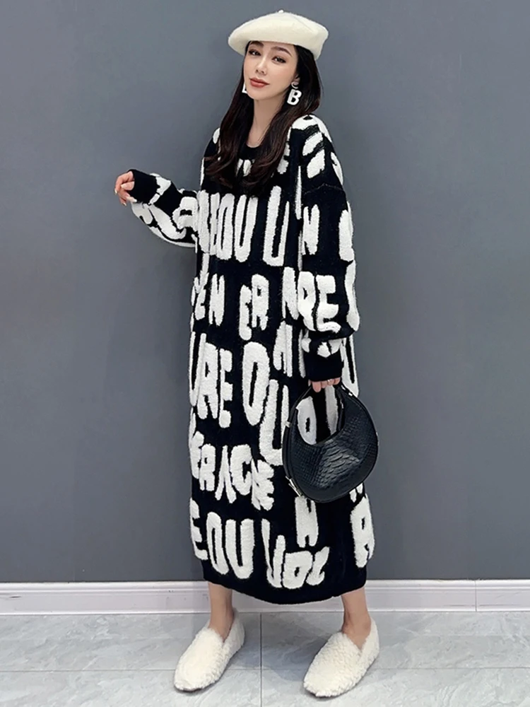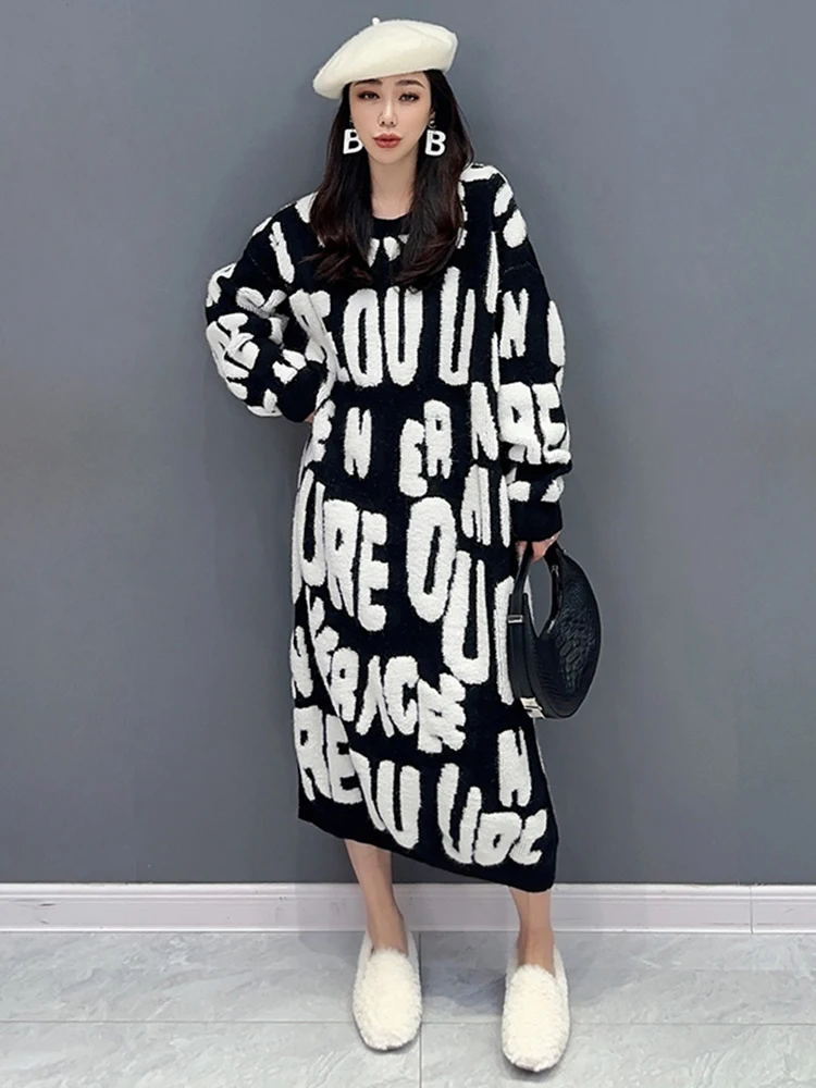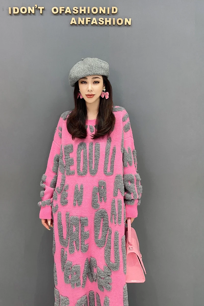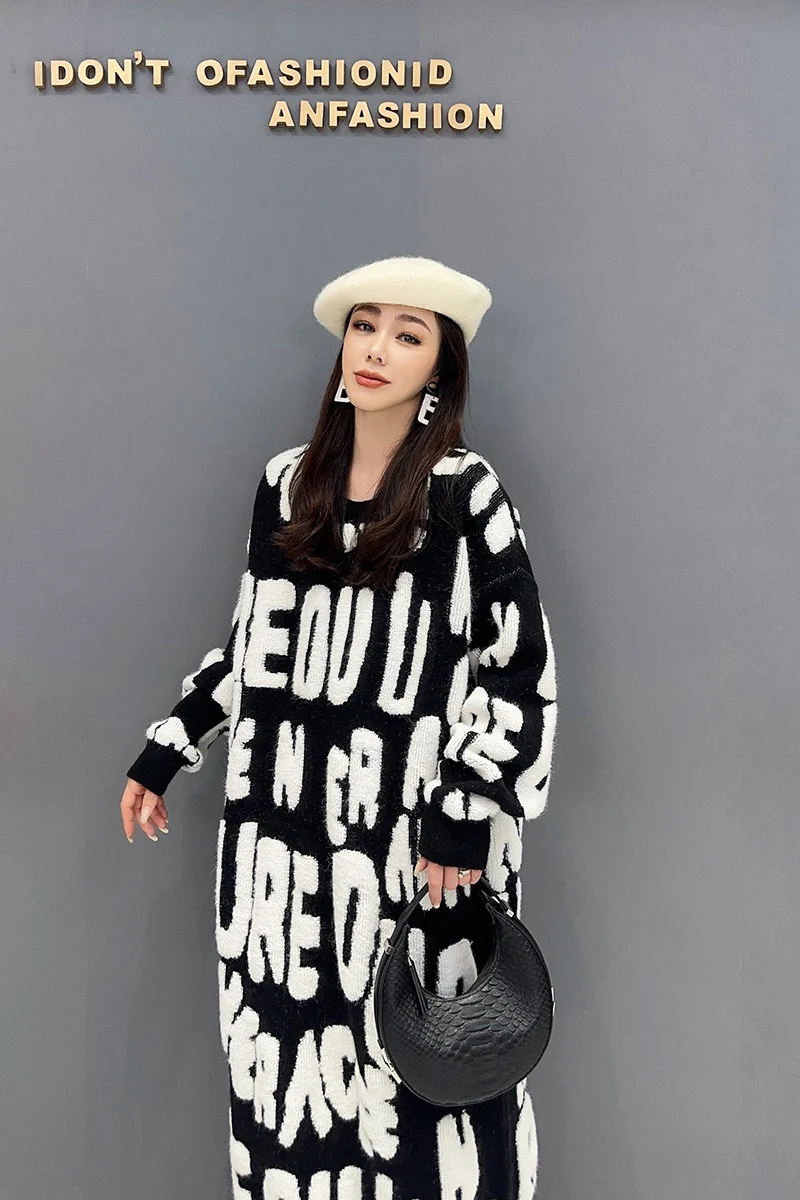 Autumn 2024 Versatile Knit Dress for Women - SHENGPALAE Villus Letter Print - O-neck - Straight - 5R7812