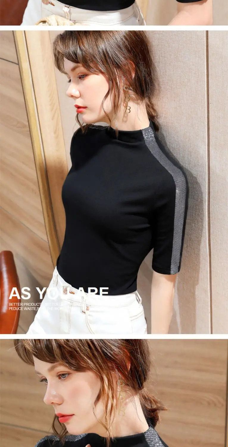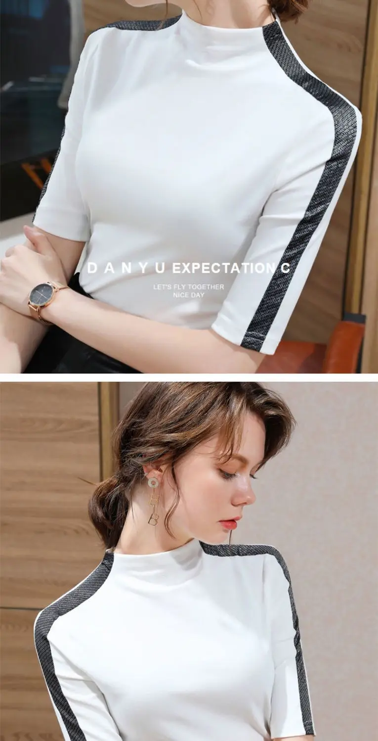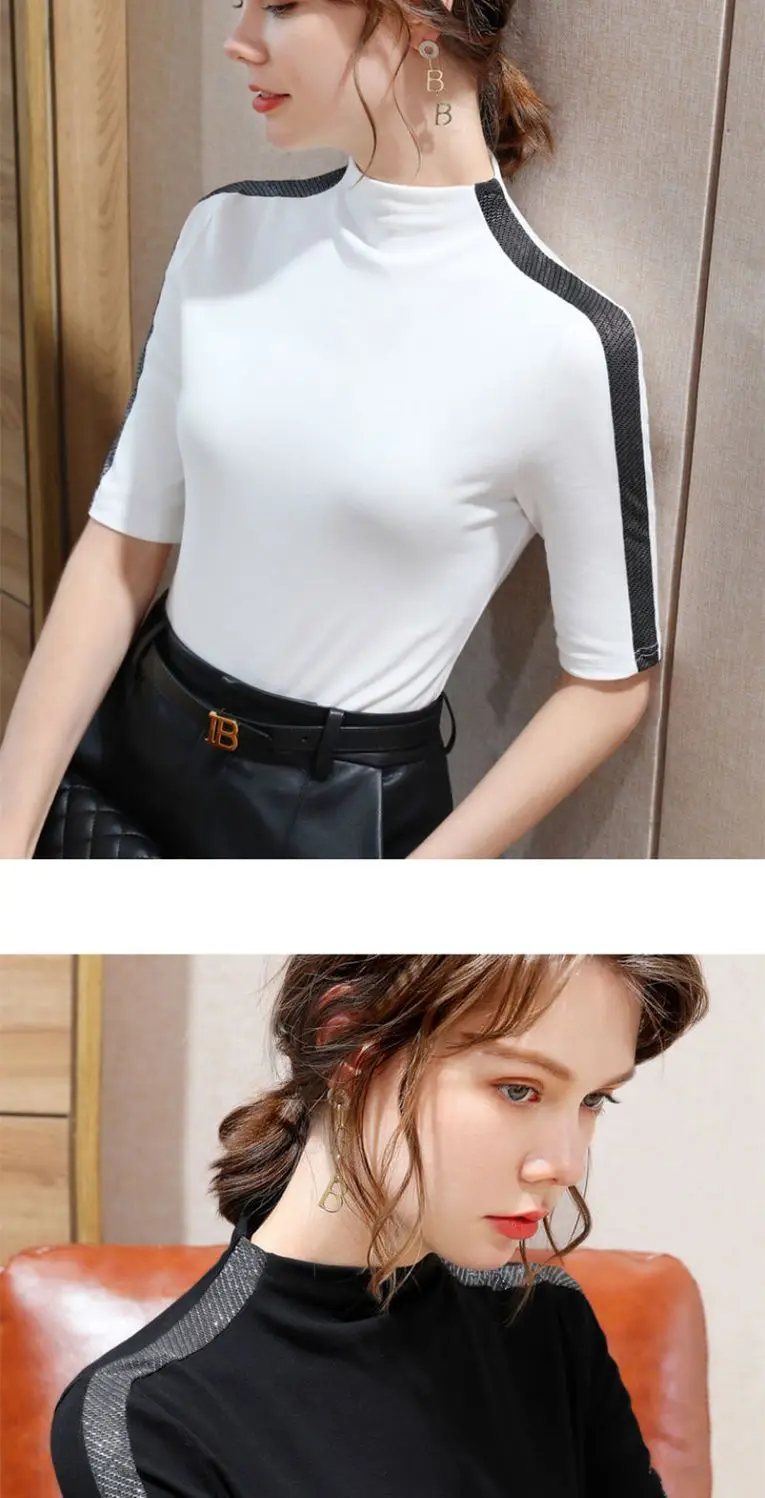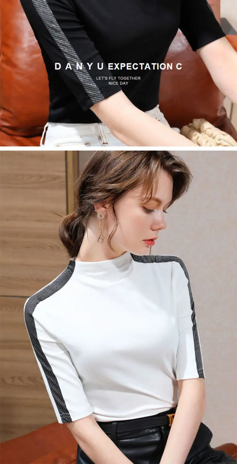 Introducing our latest addition to the 2023 Autumn Women's Fashion collection - the Black and White Contrast Medium Sleeve T-shirt. Made with high-quality cotton and featuring a unique spliced design, this t-shirt is perfect for those looking to make a statement. The half high neck adds a touch of elegance, making it a versatile piece for any occasion. Say goodbye to boring plain t-shirts and elevate your style with this premium, best-selling piece. Limited time only, get yours now while stocks last!