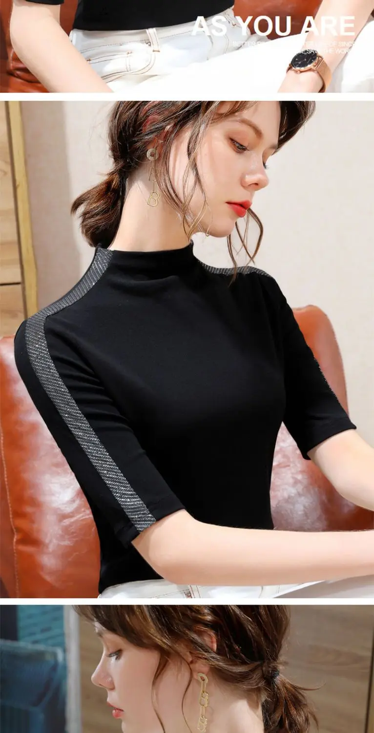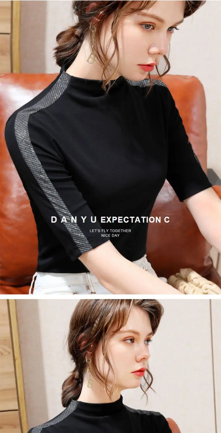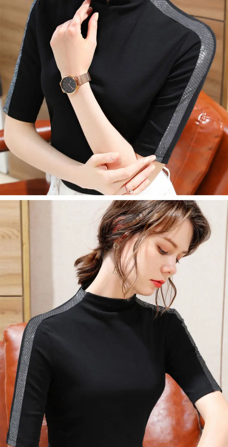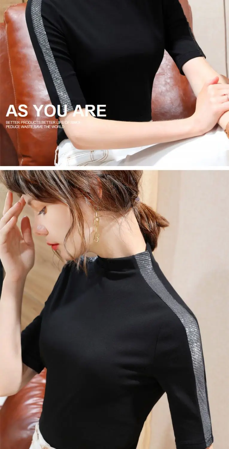 Introducing our latest addition to the 2023 Autumn Women's Fashion collection - the Black and White Contrast Medium Sleeve T-shirt. Made with high-quality cotton and featuring a unique spliced design, this t-shirt is perfect for those looking to make a statement. The half high neck adds a touch of elegance, making it a versatile piece for any occasion. Say goodbye to boring plain t-shirts and elevate your style with this premium, best-selling piece. Limited time only, get yours now while stocks last!