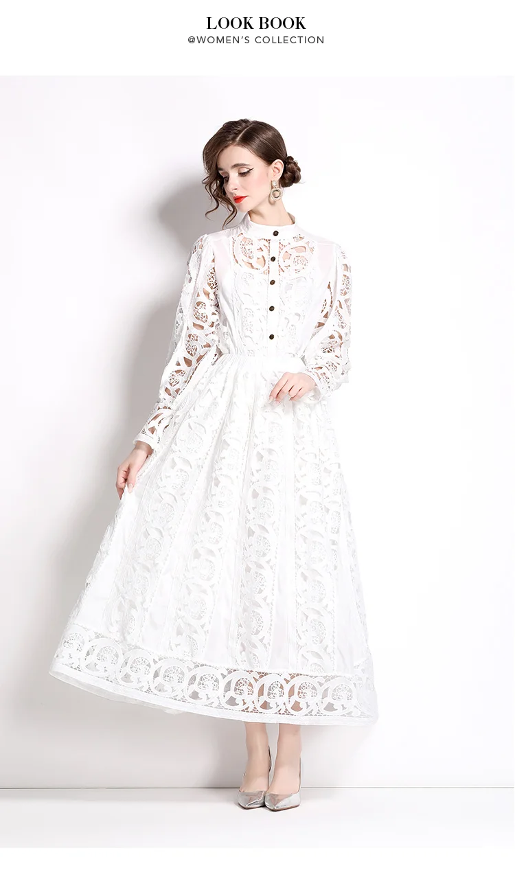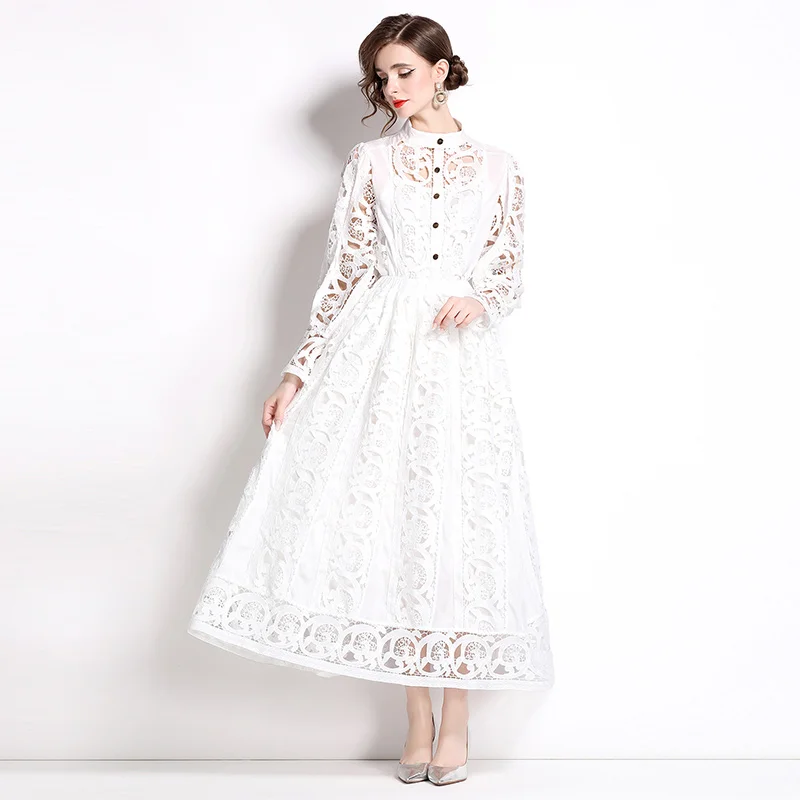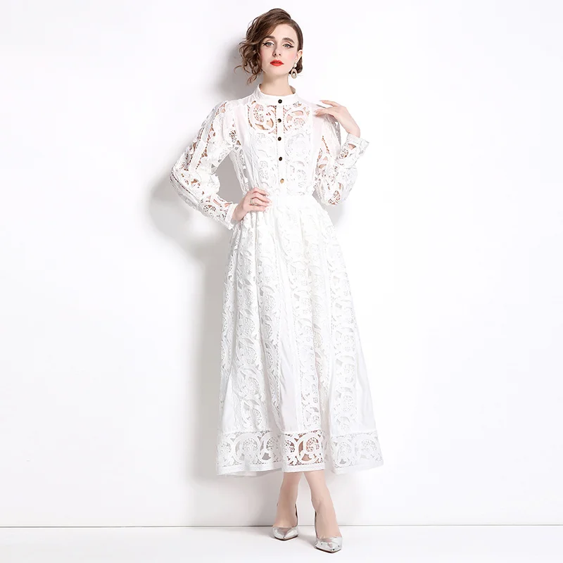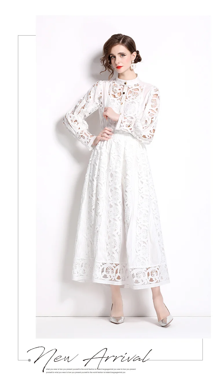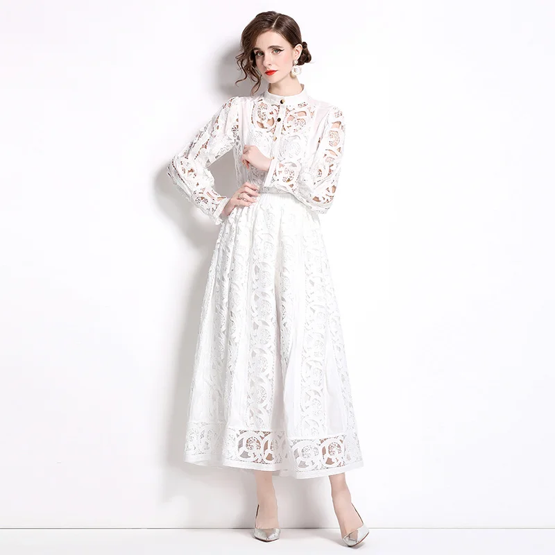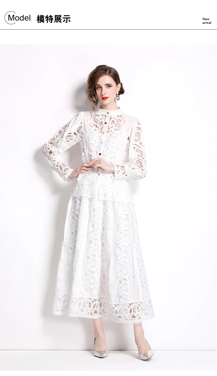 Autumn Crochet Lace Embroidery Hollow Out 3 Pieces Sets Women Loose Shirt Top Lining and Elastic Waist Maxi Robe Skirt Suit