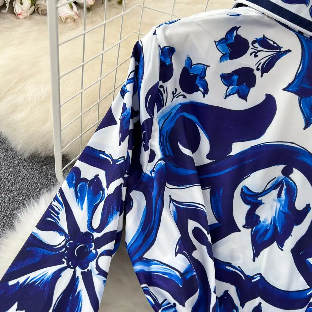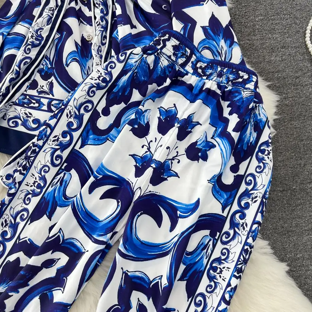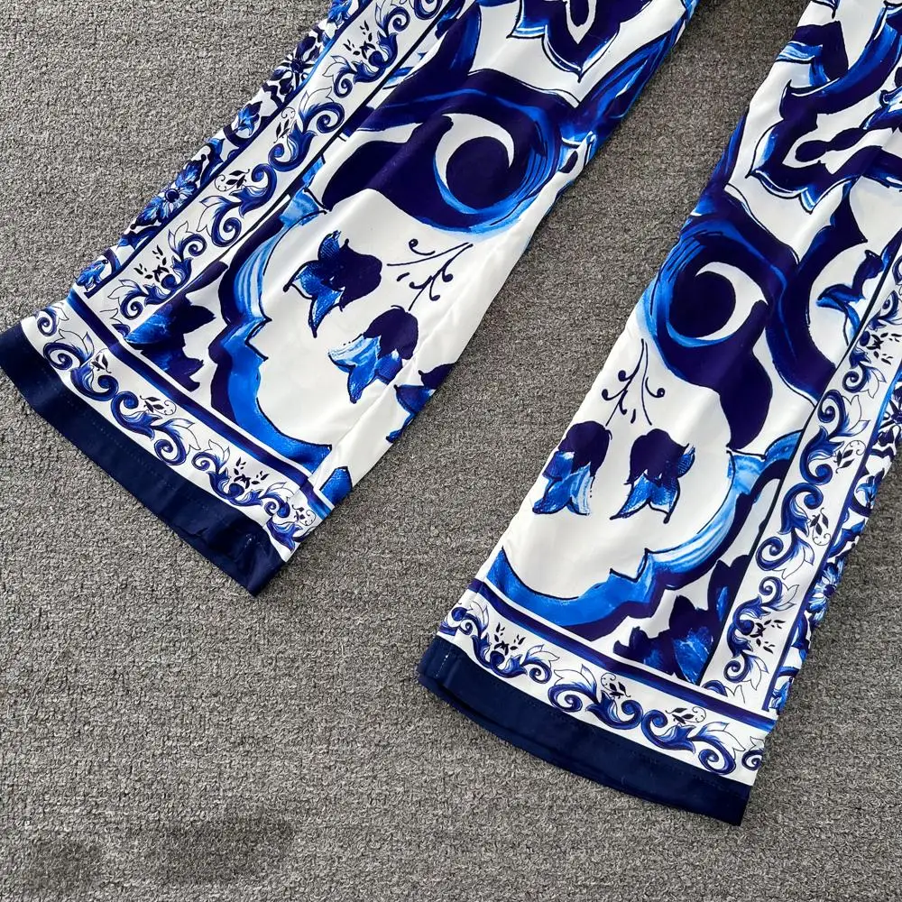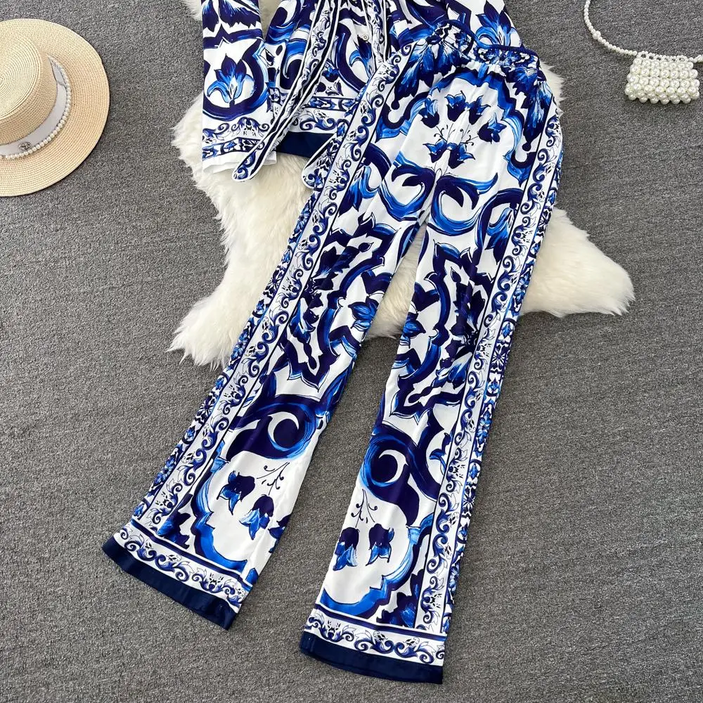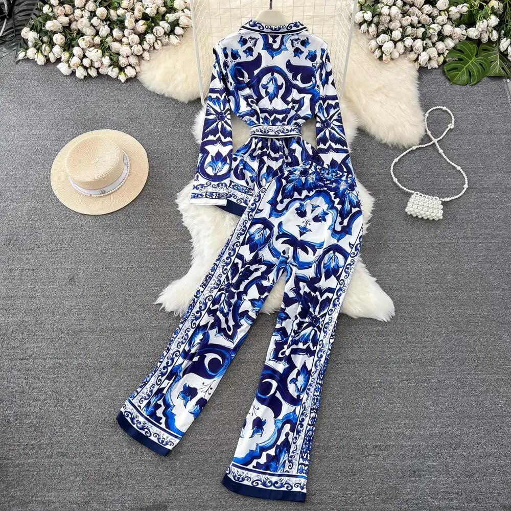 Introducing our best-selling Autumn Fashion Runway Pants Suit, featuring a stunning blue and white porcelain print on a long jacket and pants set. Made for the modern woman, this suit is perfect for any occasion and will solve the problem of finding a stylish and comfortable outfit. With its long sleeves and premium fabric, customers will gain confidence and sophistication while wearing this exclusive and limited-time set. Be runway-ready and make a statement with our N8730 set, the perfect fit for your fall wardrobe.