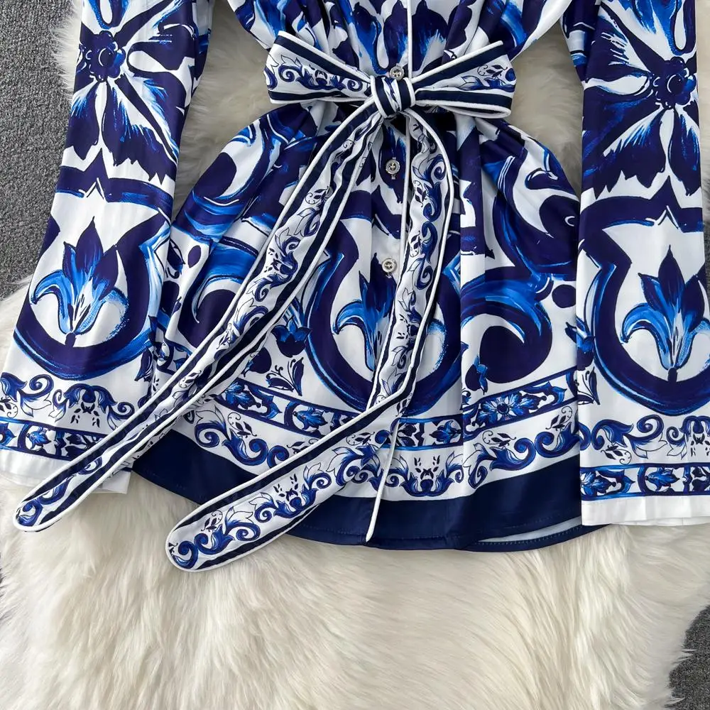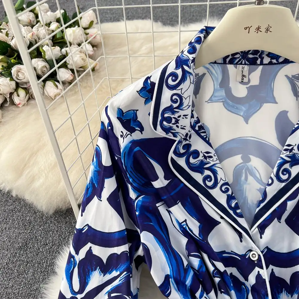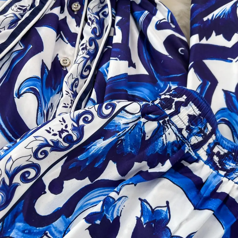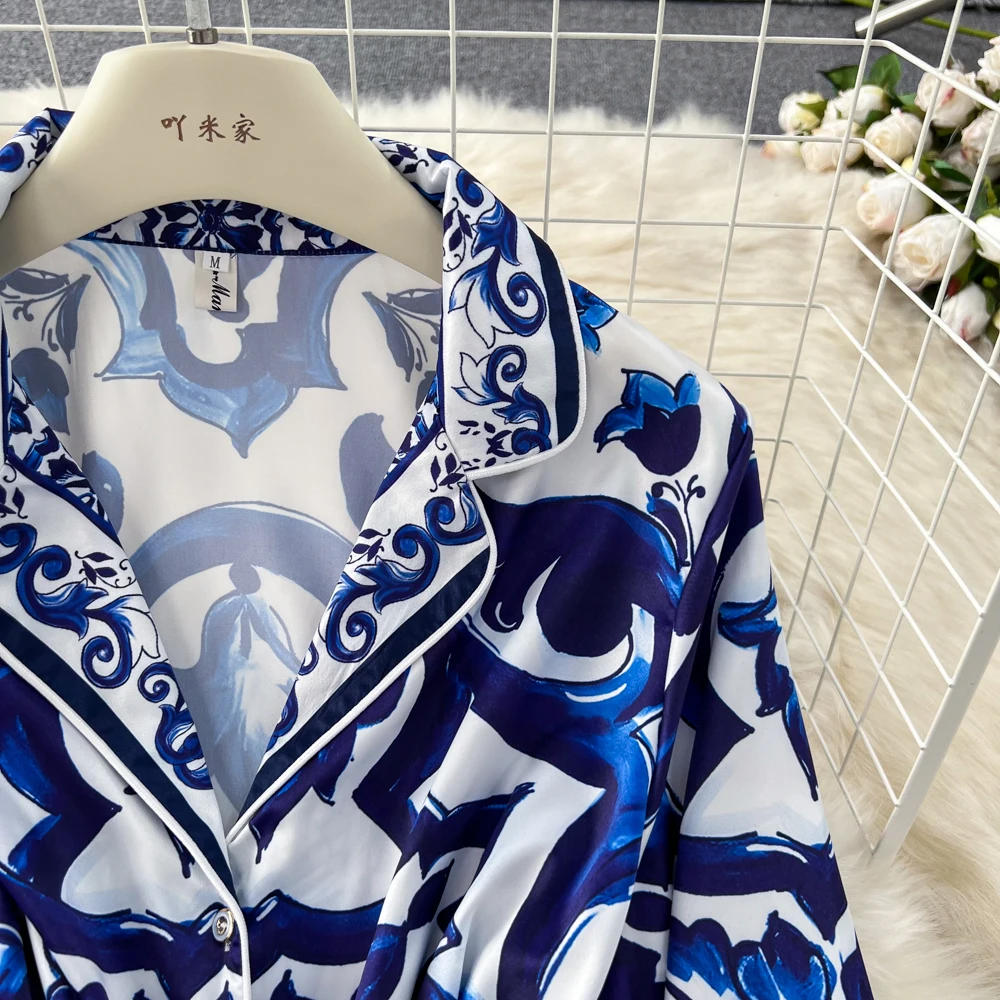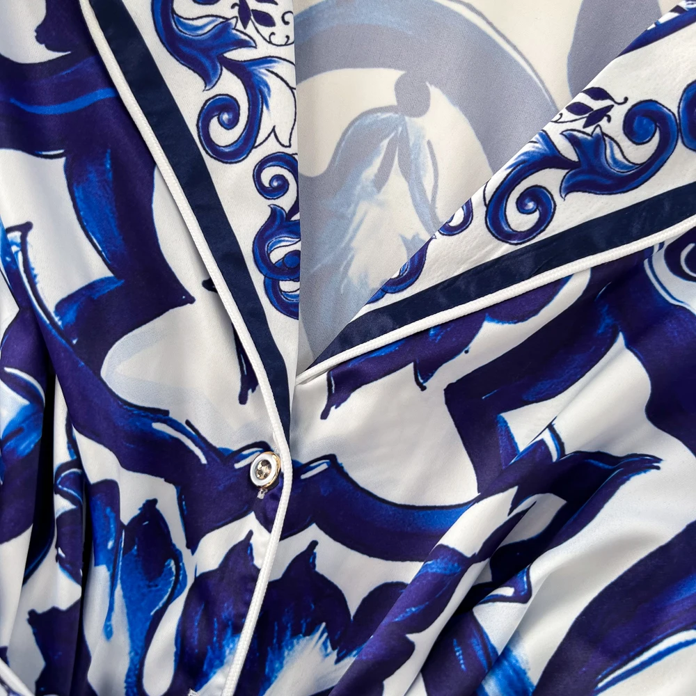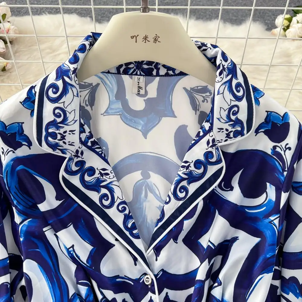 Introducing our best-selling Autumn Fashion Runway Pants Suit, featuring a stunning blue and white porcelain print on a long jacket and pants set. Made for the modern woman, this suit is perfect for any occasion and will solve the problem of finding a stylish and comfortable outfit. With its long sleeves and premium fabric, customers will gain confidence and sophistication while wearing this exclusive and limited-time set. Be runway-ready and make a statement with our N8730 set, the perfect fit for your fall wardrobe.