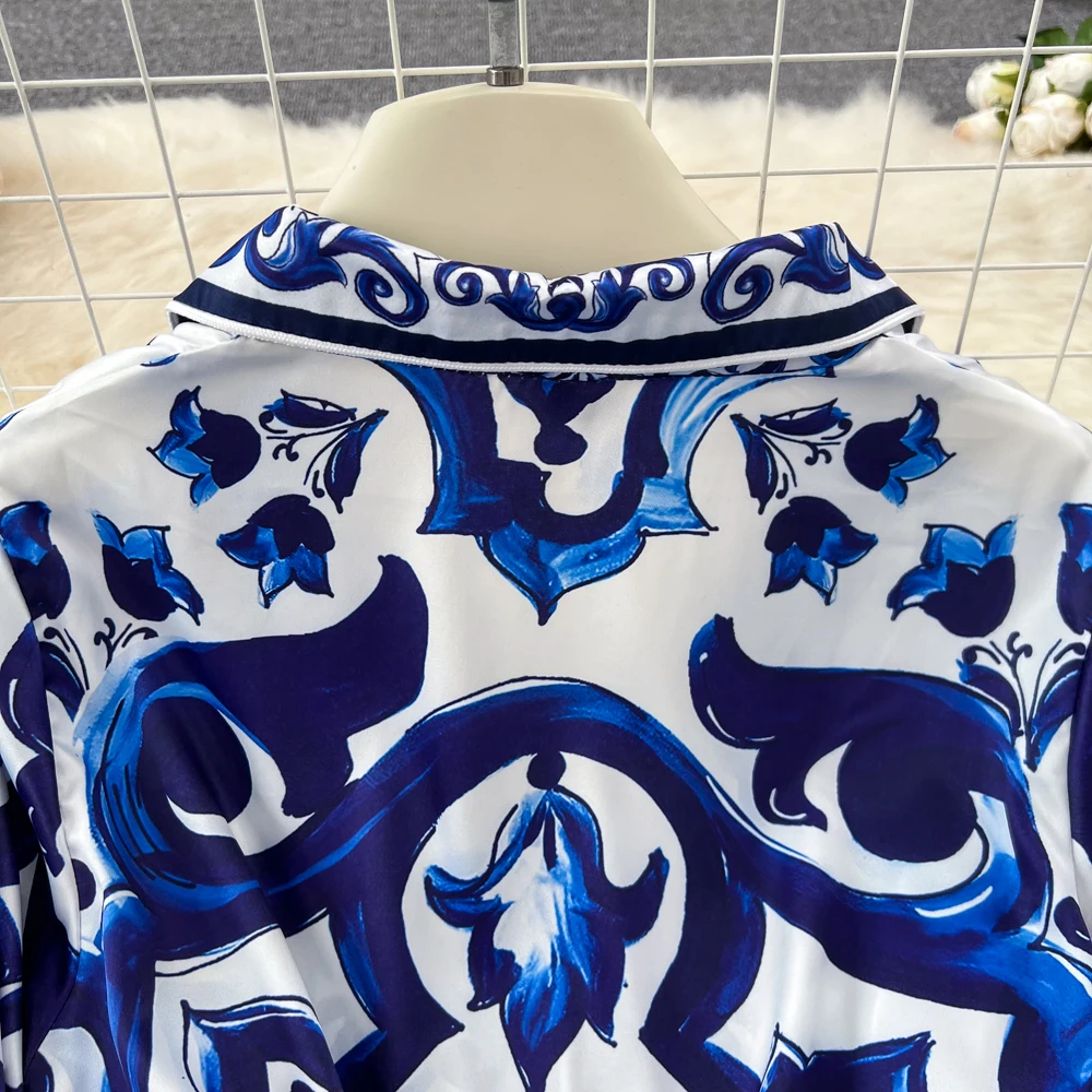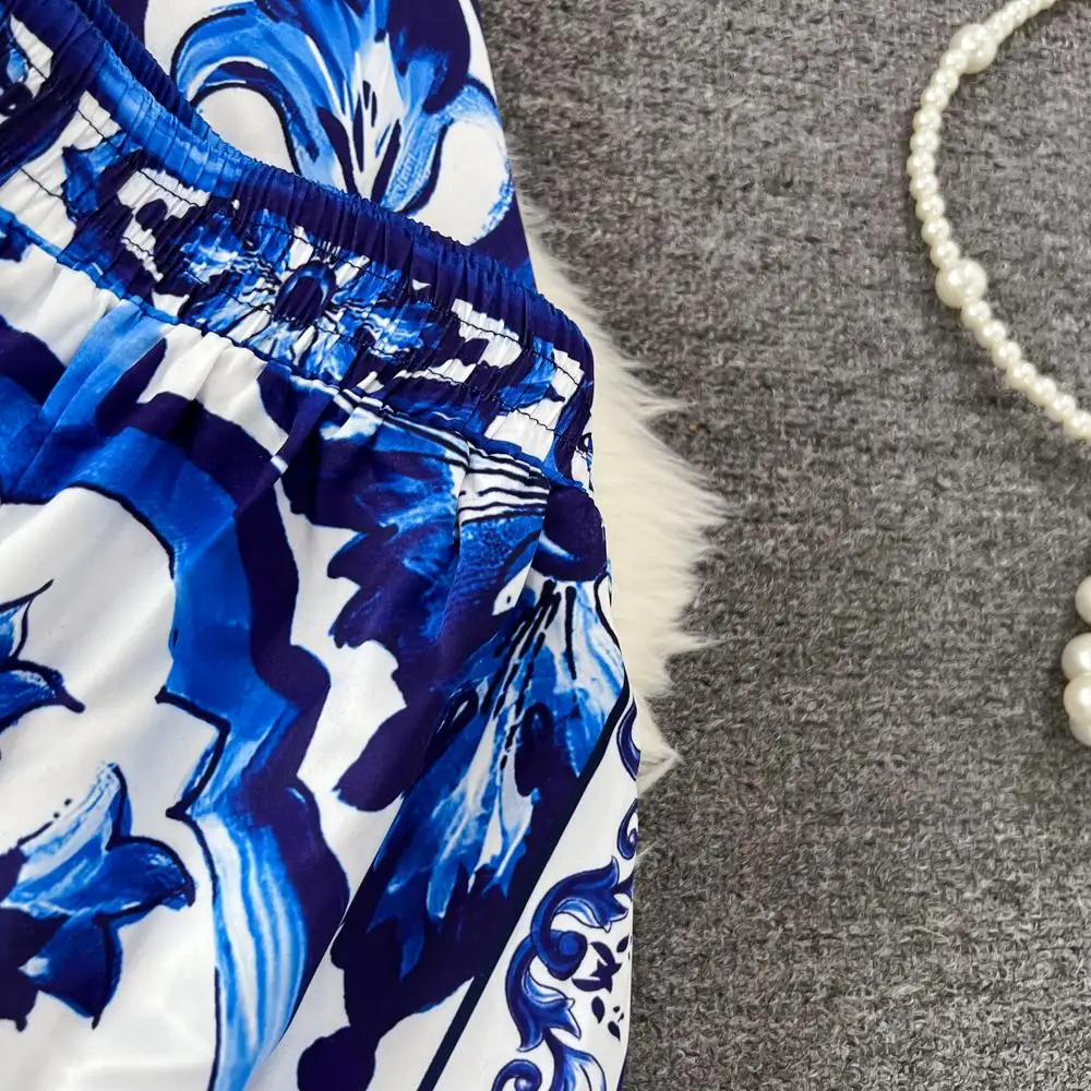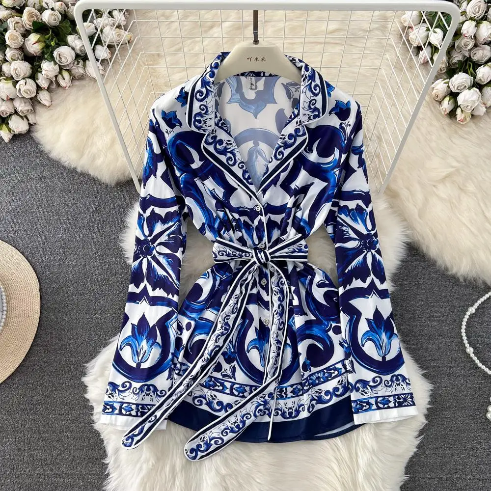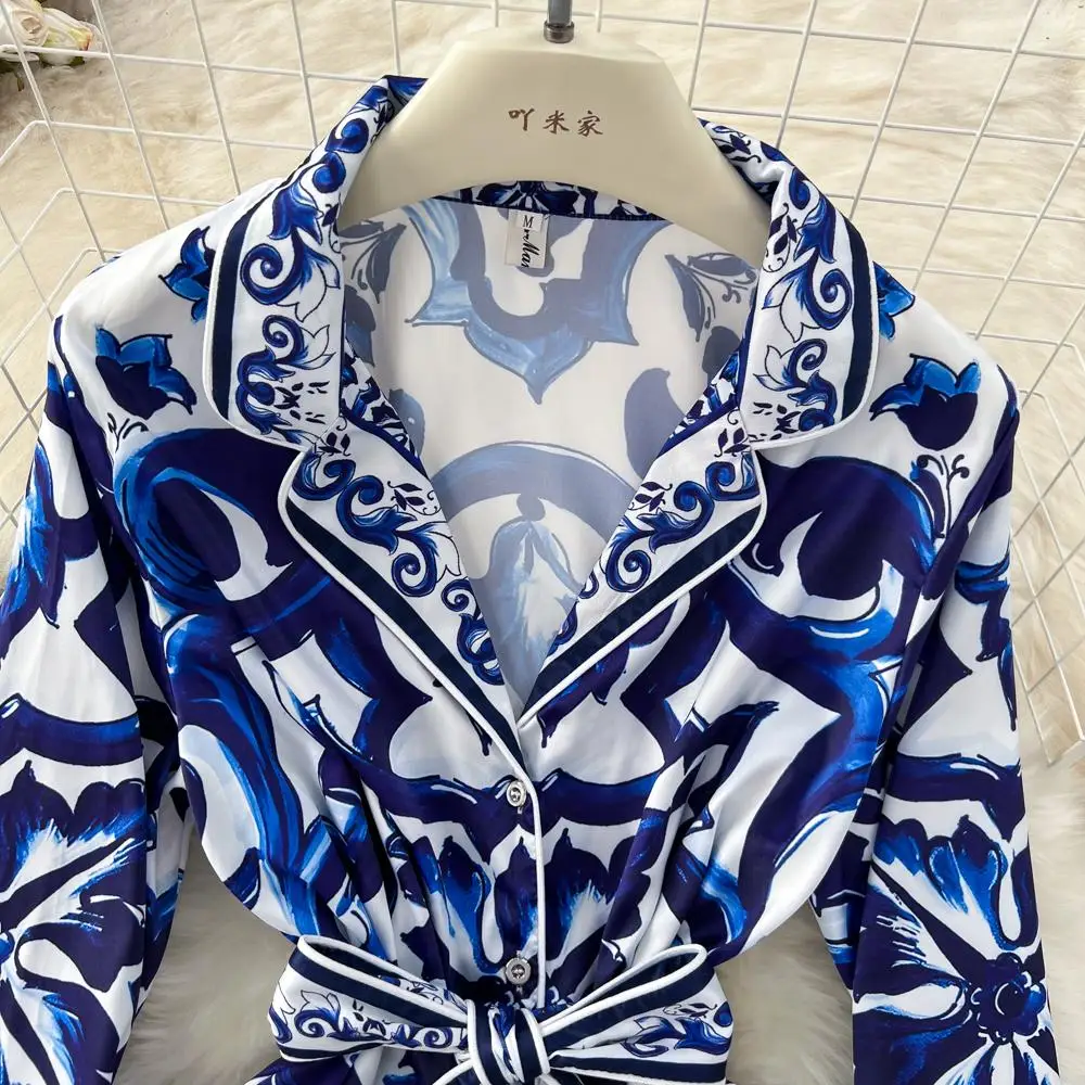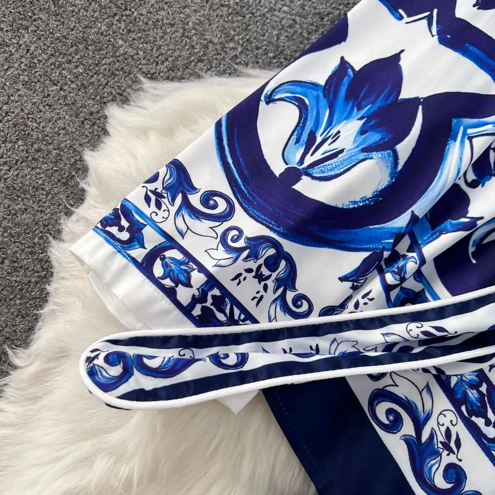 Introducing our best-selling Autumn Fashion Runway Pants Suit, featuring a stunning blue and white porcelain print on a long jacket and pants set. Made for the modern woman, this suit is perfect for any occasion and will solve the problem of finding a stylish and comfortable outfit. With its long sleeves and premium fabric, customers will gain confidence and sophistication while wearing this exclusive and limited-time set. Be runway-ready and make a statement with our N8730 set, the perfect fit for your fall wardrobe.