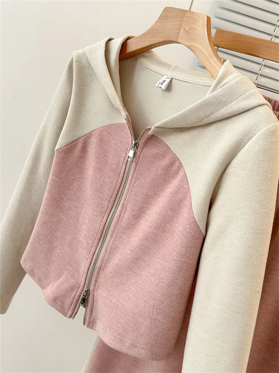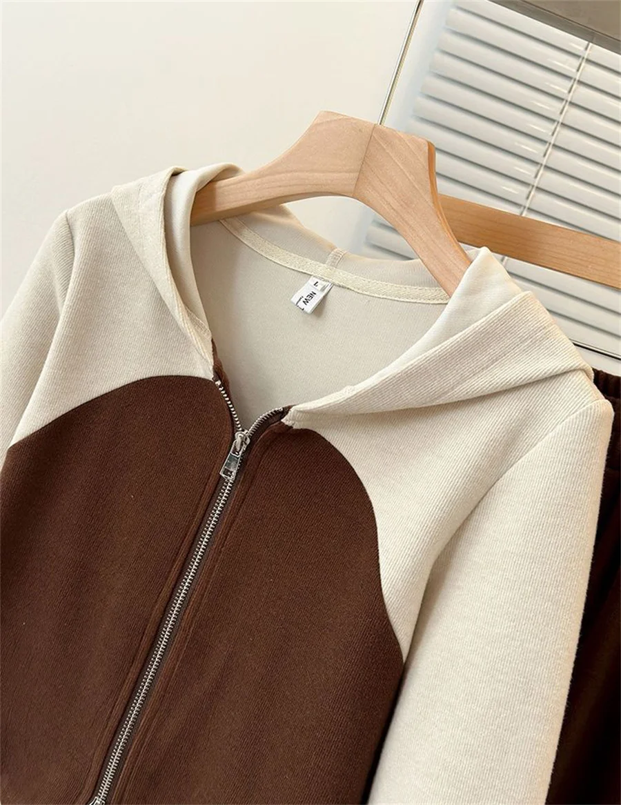 Elevate your daily style with our Patchwork Casual Women's Tracksuit Set, featuring a hooded zipper top and high-waisted pants with side stripe detail for a trendy look.