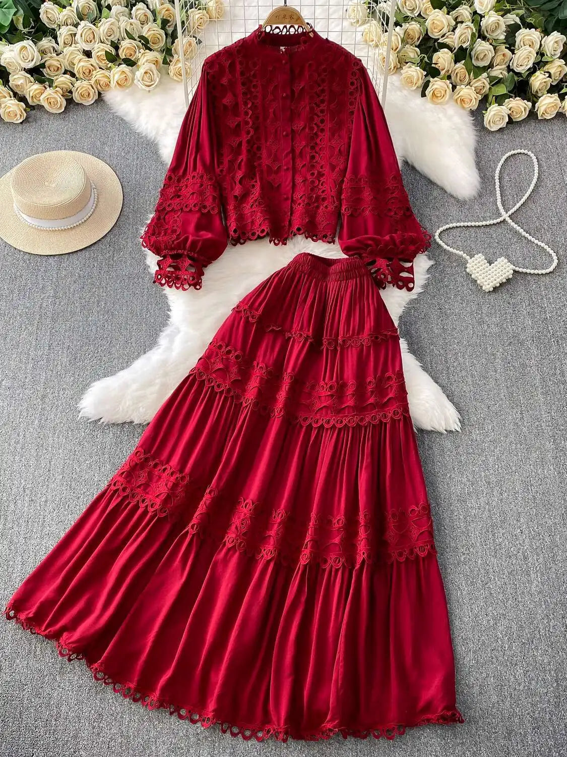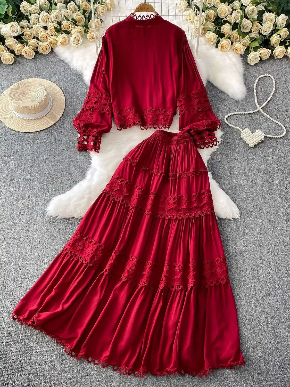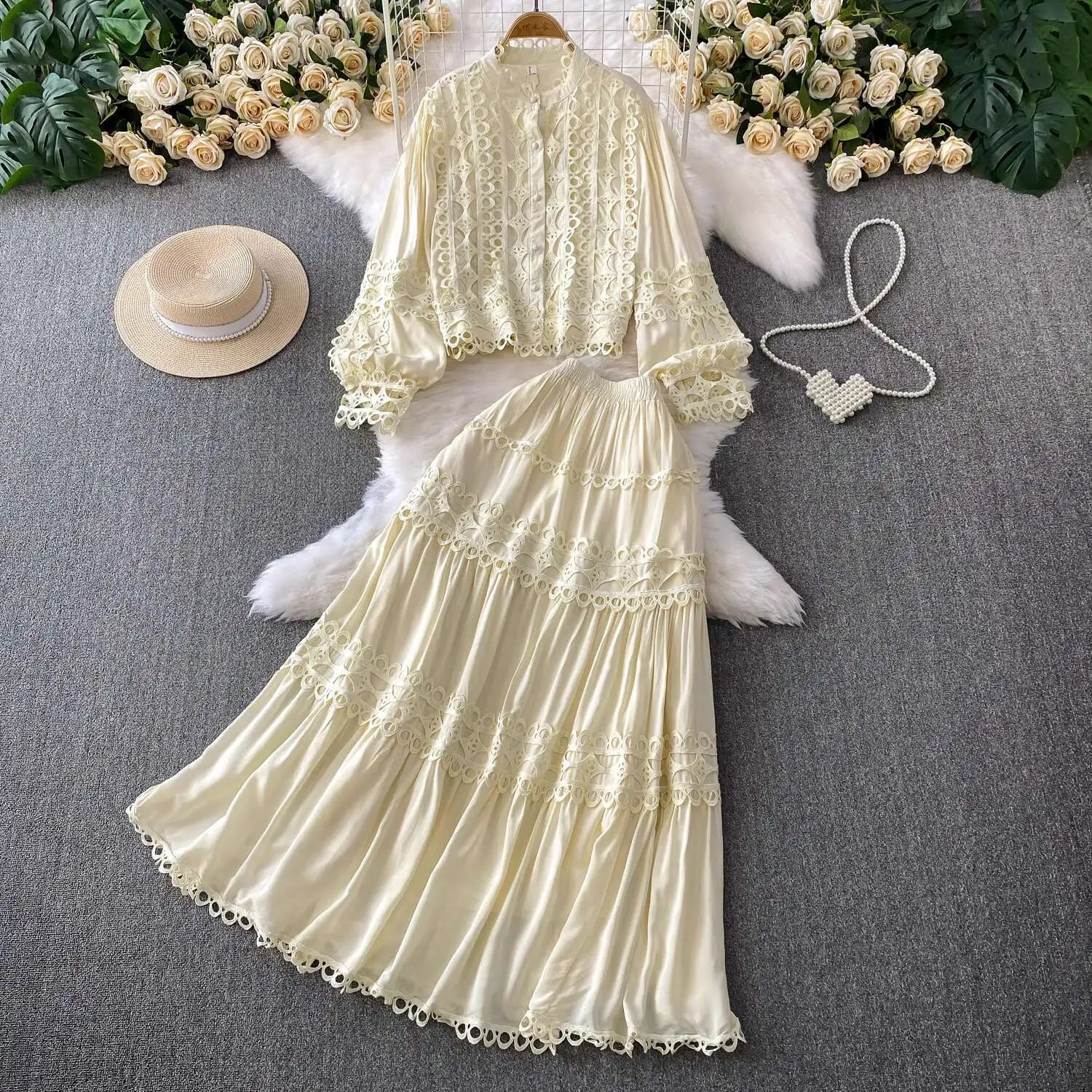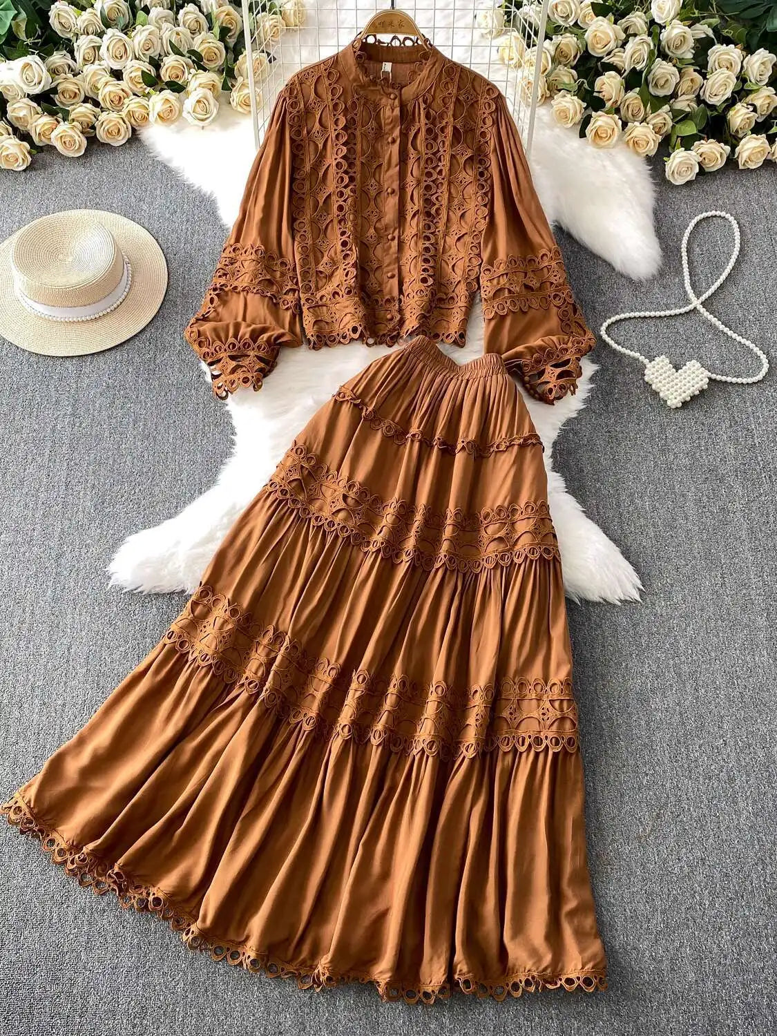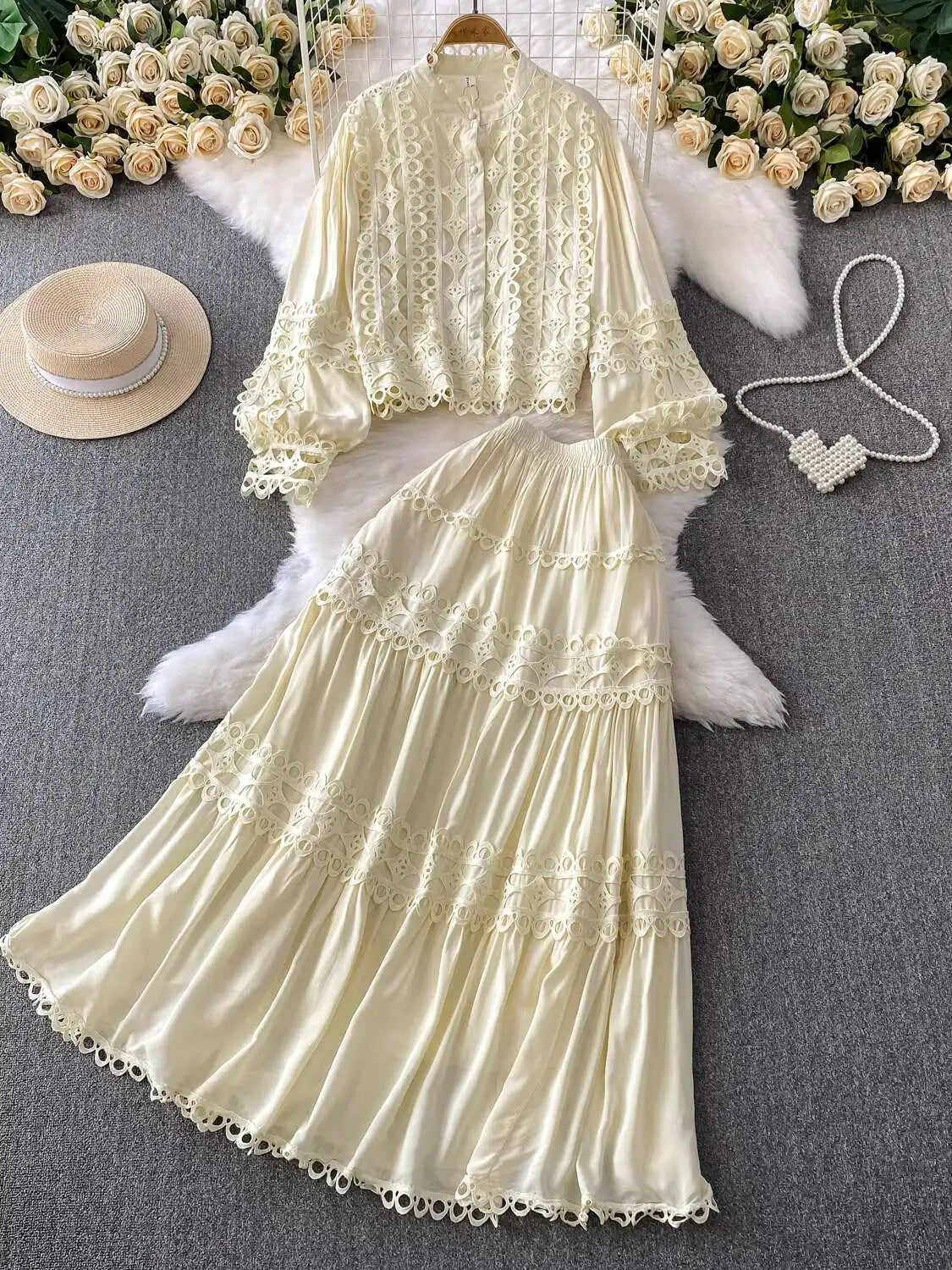 Crafted from breathable materials, this dress set not only keeps you comfortable but also ensures you look stylish all day. Simply pair the relaxed crochet shirt with the elastic waistband skirt for a complete look, and accessorize with your favorite jewelry to elevate your outfit.