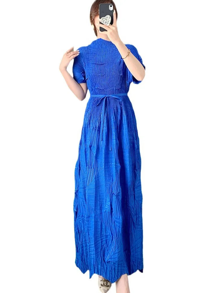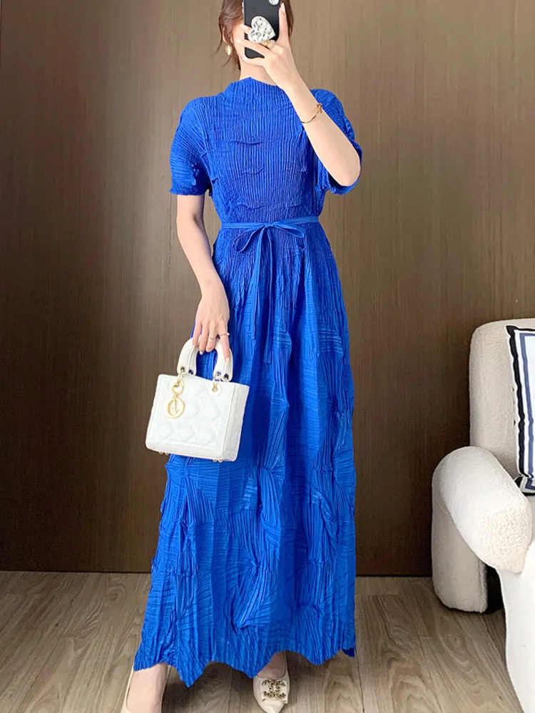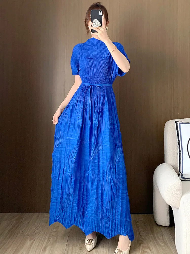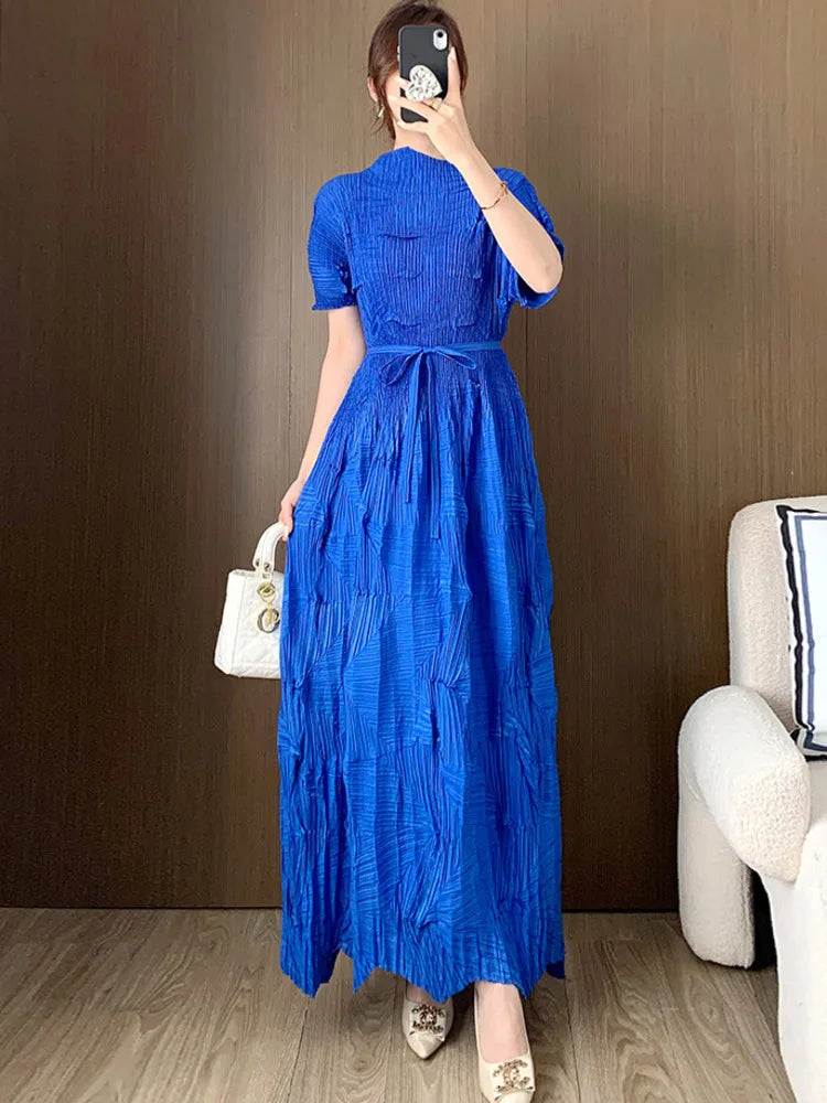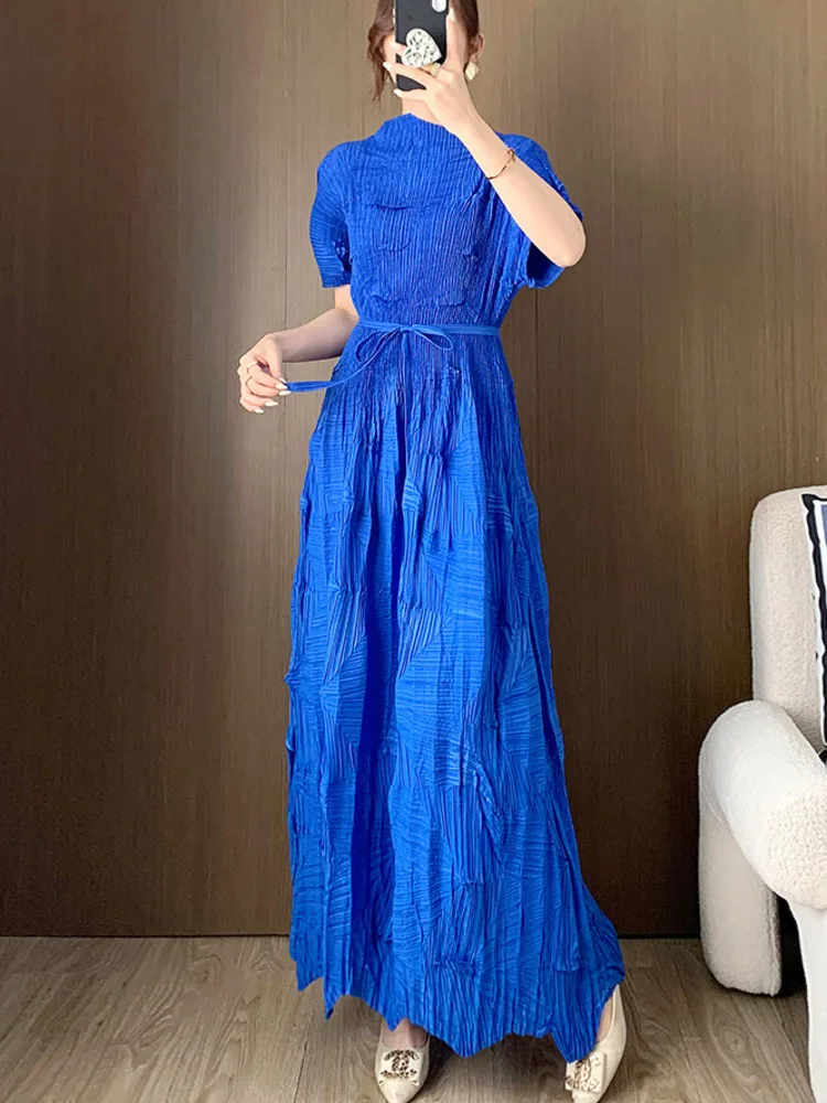Elevate your wardrobe with our stunning Chic Pleated A-Line Dress featuring a draped lace-up design and short sleeves.