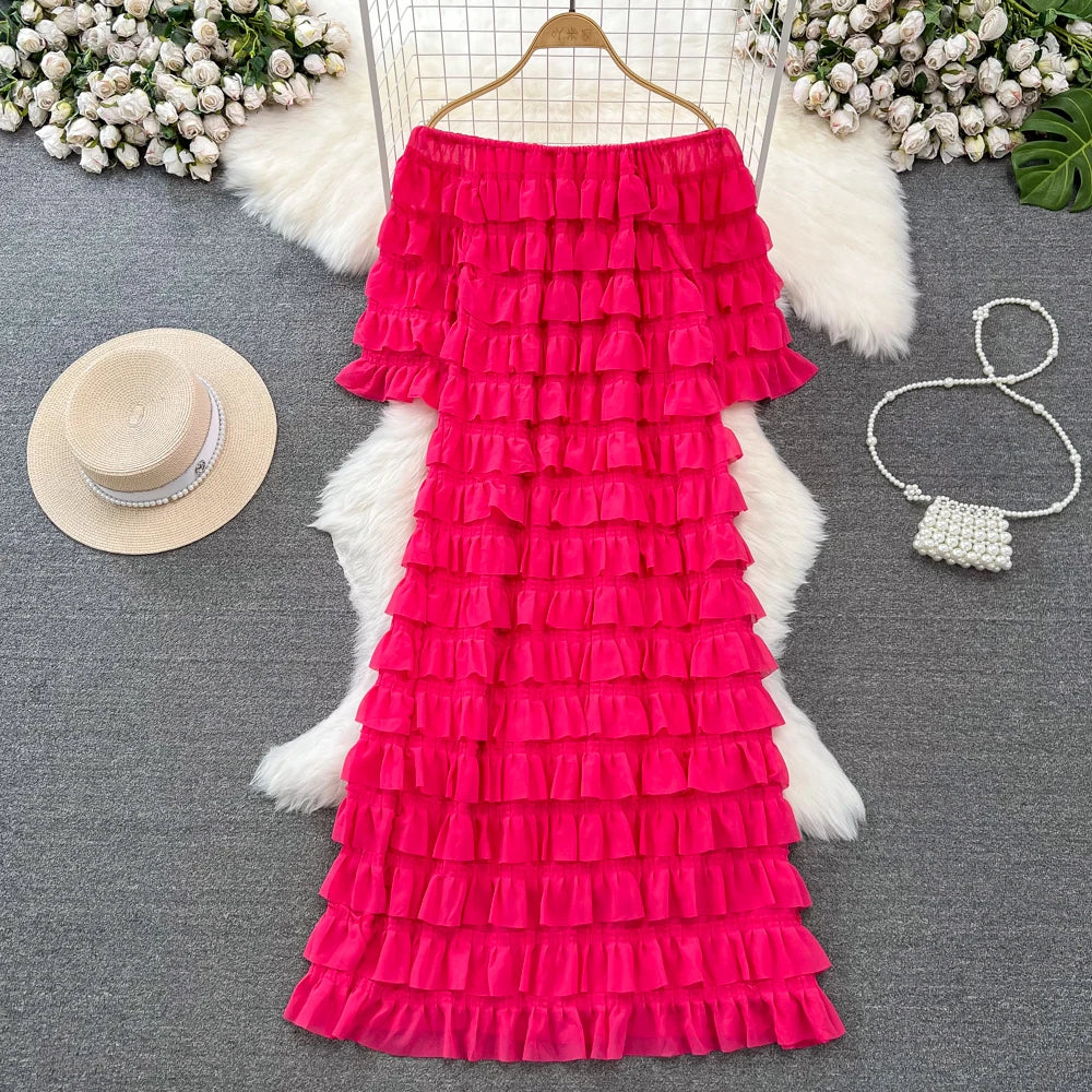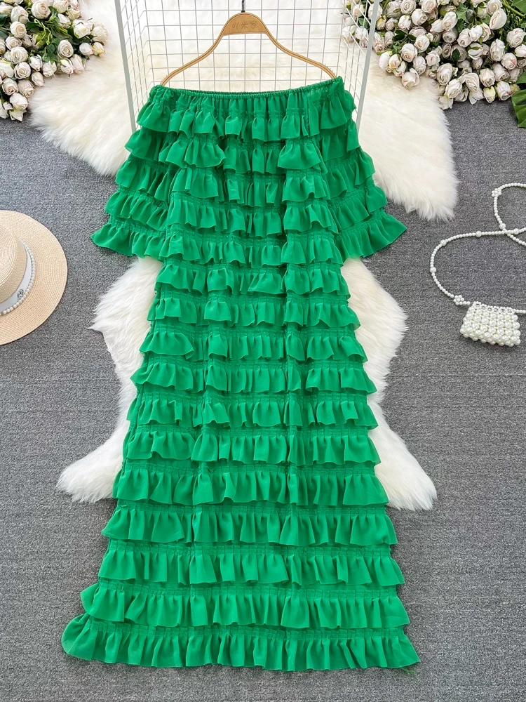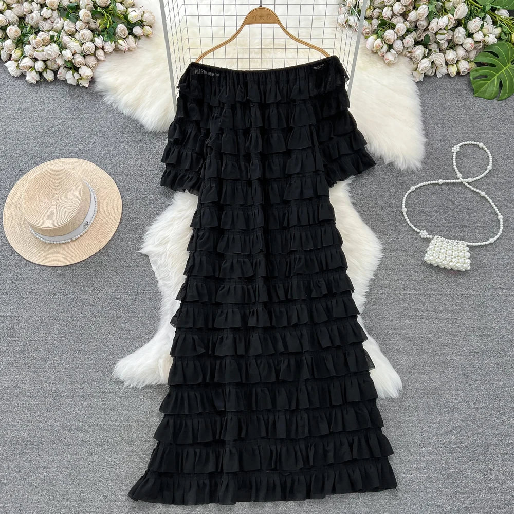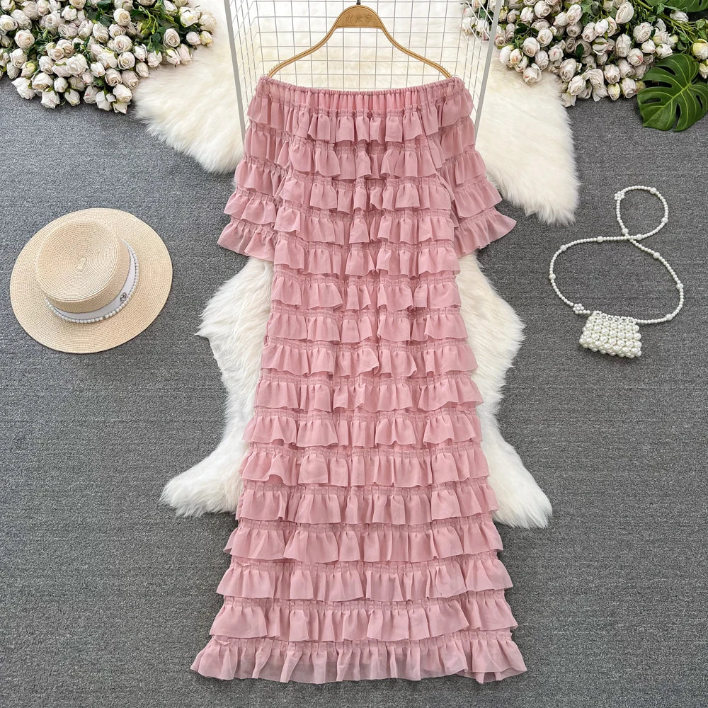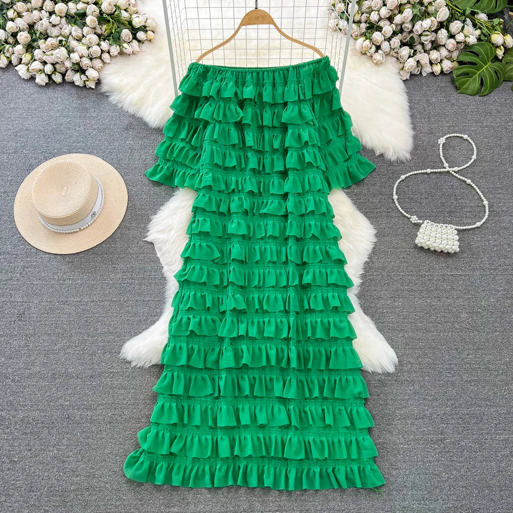 Introducing our latest addition to the 2024 collection - the XFPV Women Ruffles Korean Version Mid Length High Waist A-line Dress! This tasteful dress is designed to enhance your inner charm and transform your style. Made with premium quality materials, it boasts a loose fit and a flattering high waist, perfect for any body type. The ruffled details and slash neck add a touch of elegance to the overall look. This dress is a must-have for the spring and summer season, and its versatile design makes it suitable for any occasion. Don't miss out on this limited time offer and elevate your wardrobe with this exclusive dress. Order now and experience the perfect fit for yourself!