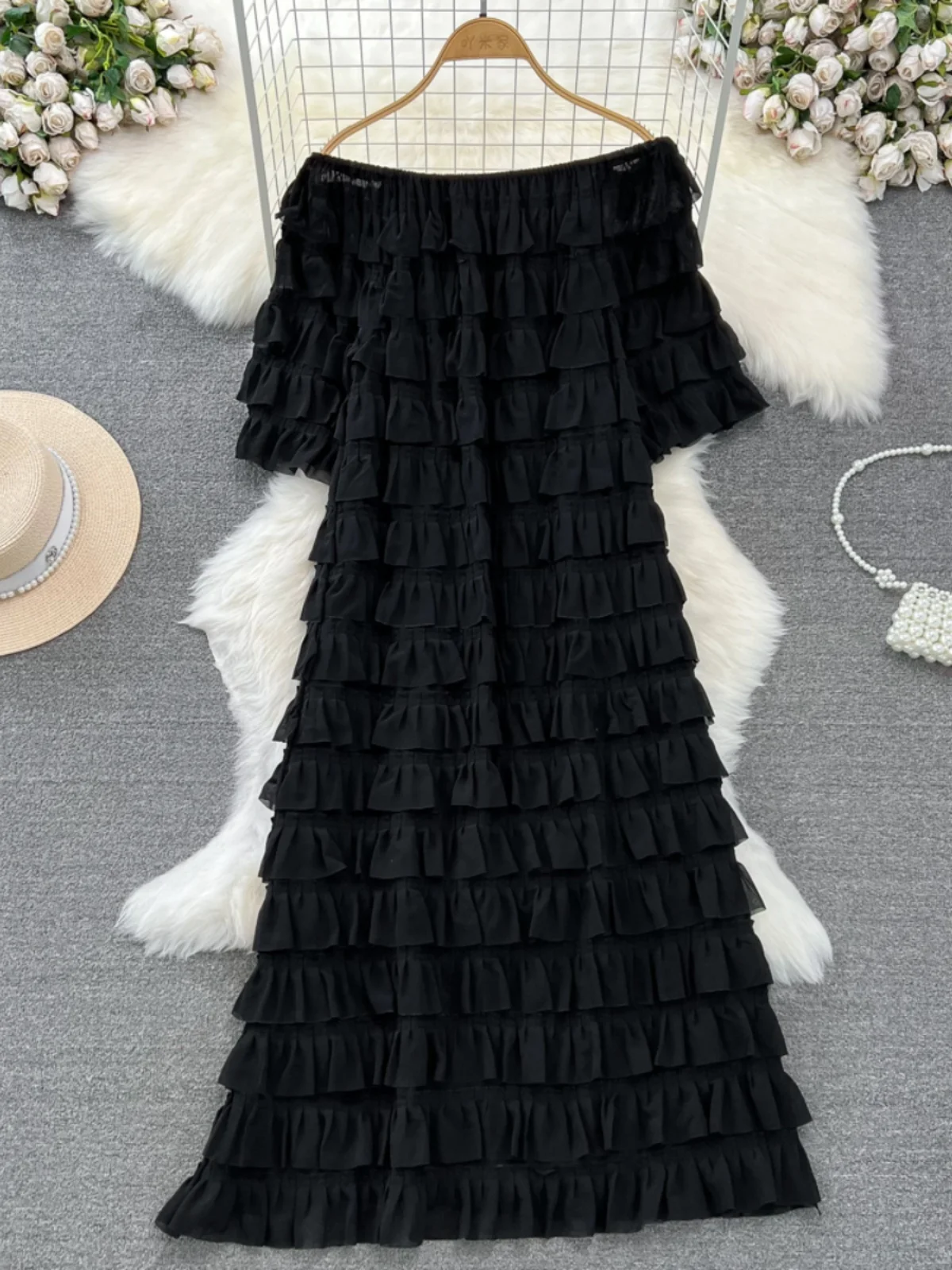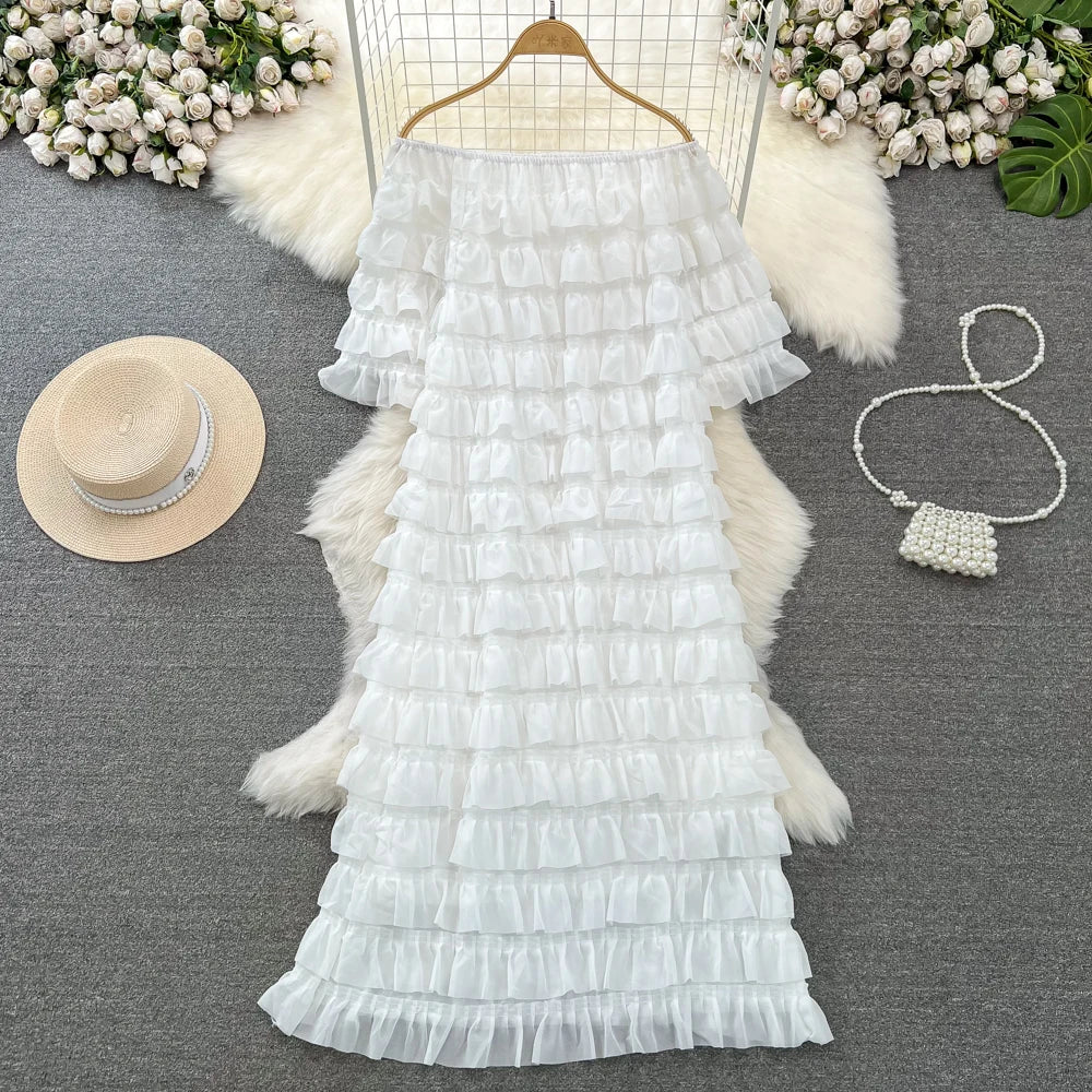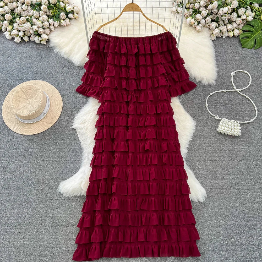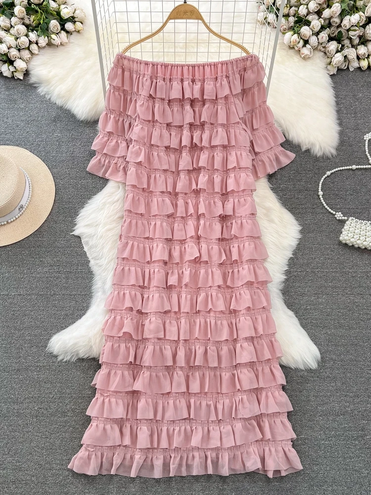 Introducing our latest addition to the 2024 collection - the XFPV Women Ruffles Korean Version Mid Length High Waist A-line Dress! This tasteful dress is designed to enhance your inner charm and transform your style. Made with premium quality materials, it boasts a loose fit and a flattering high waist, perfect for any body type. The ruffled details and slash neck add a touch of elegance to the overall look. This dress is a must-have for the spring and summer season, and its versatile design makes it suitable for any occasion. Don't miss out on this limited time offer and elevate your wardrobe with this exclusive dress. Order now and experience the perfect fit for yourself!