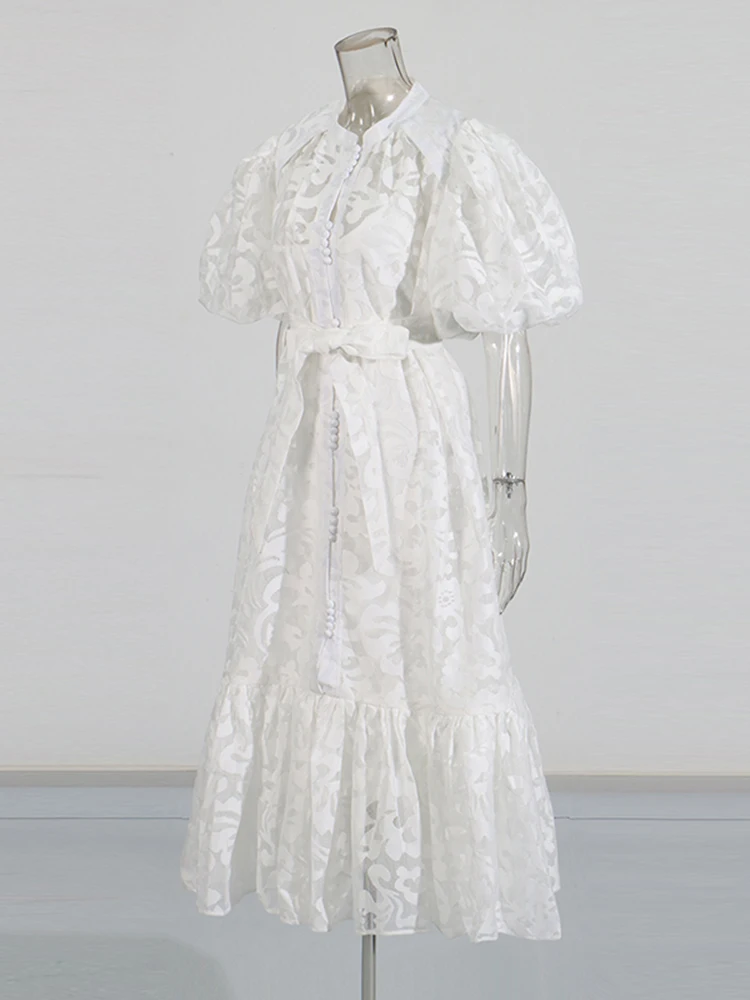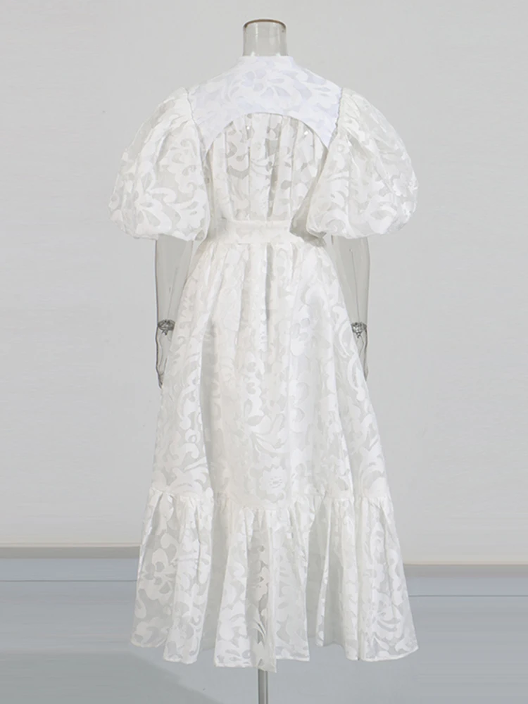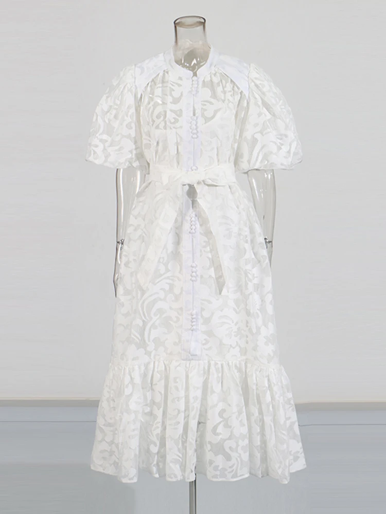 This stunning dress features a flattering silhouette with a round neck and long sleeves, ensuring you stay fashionable and comfortable all day long. The beautiful spliced printing combined with the bow detail makes it a standout piece in any collection.
