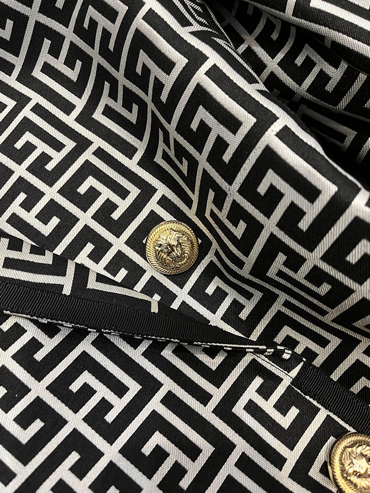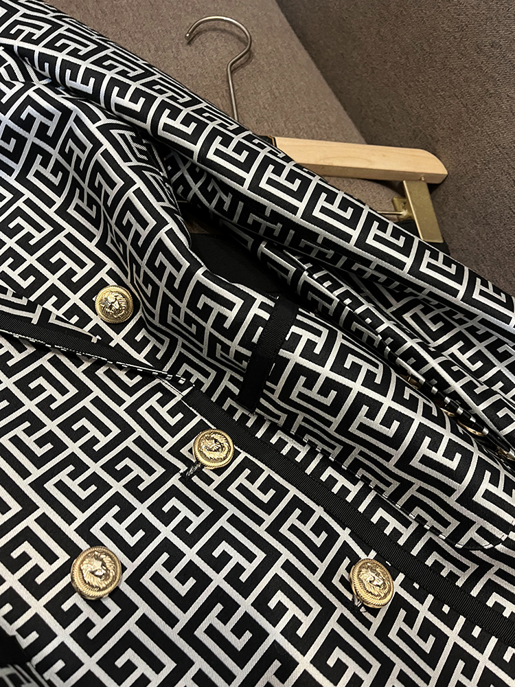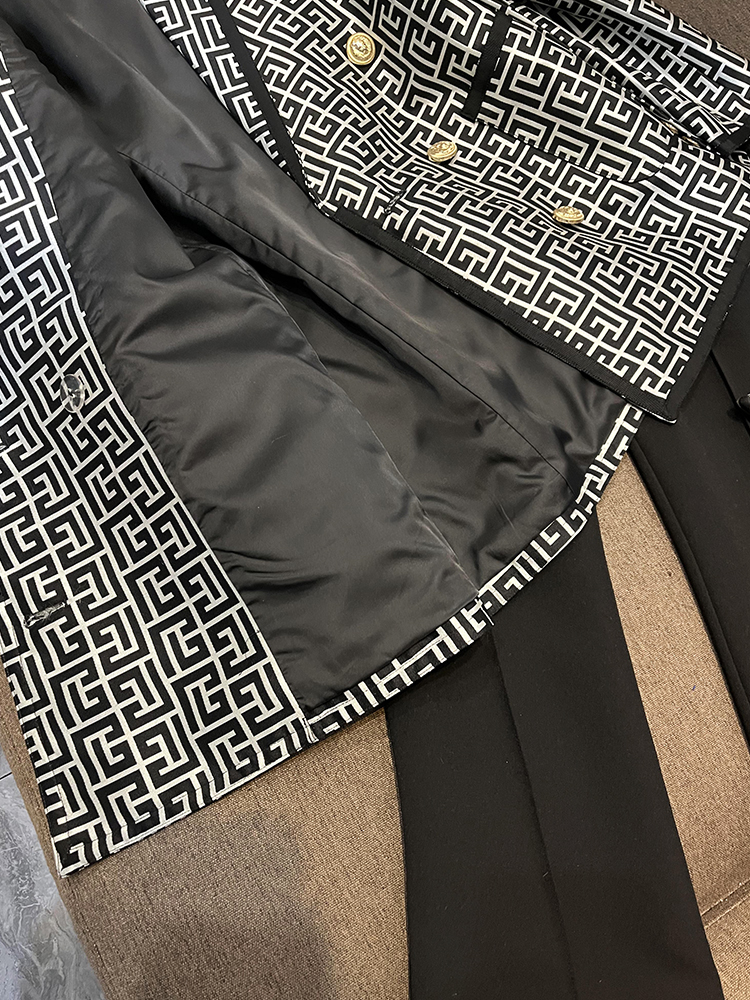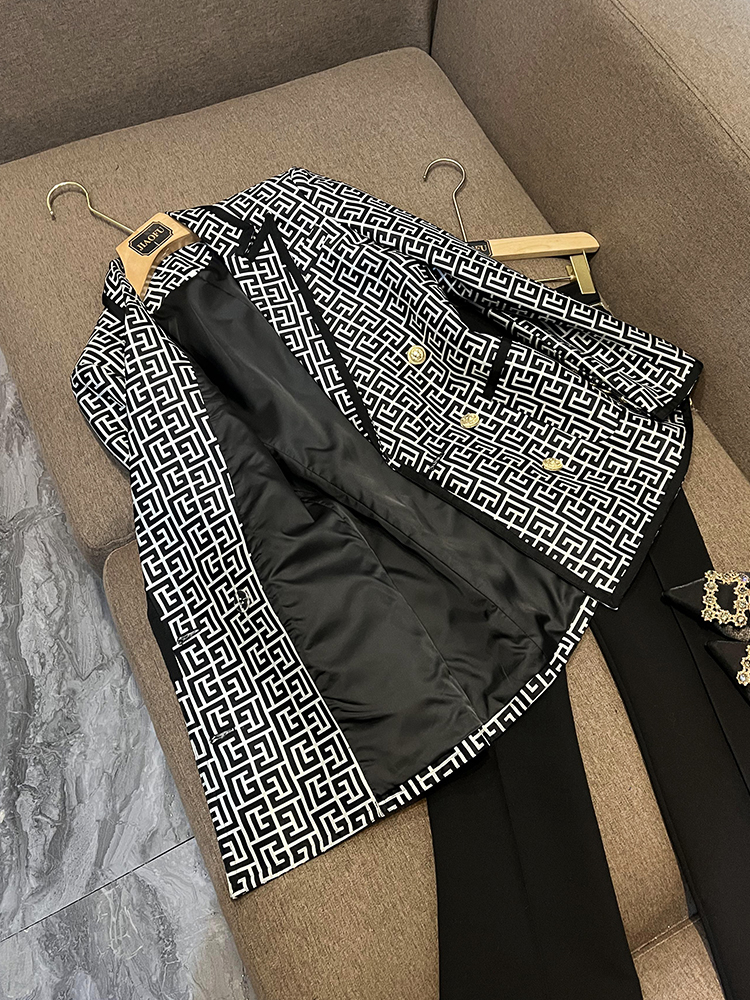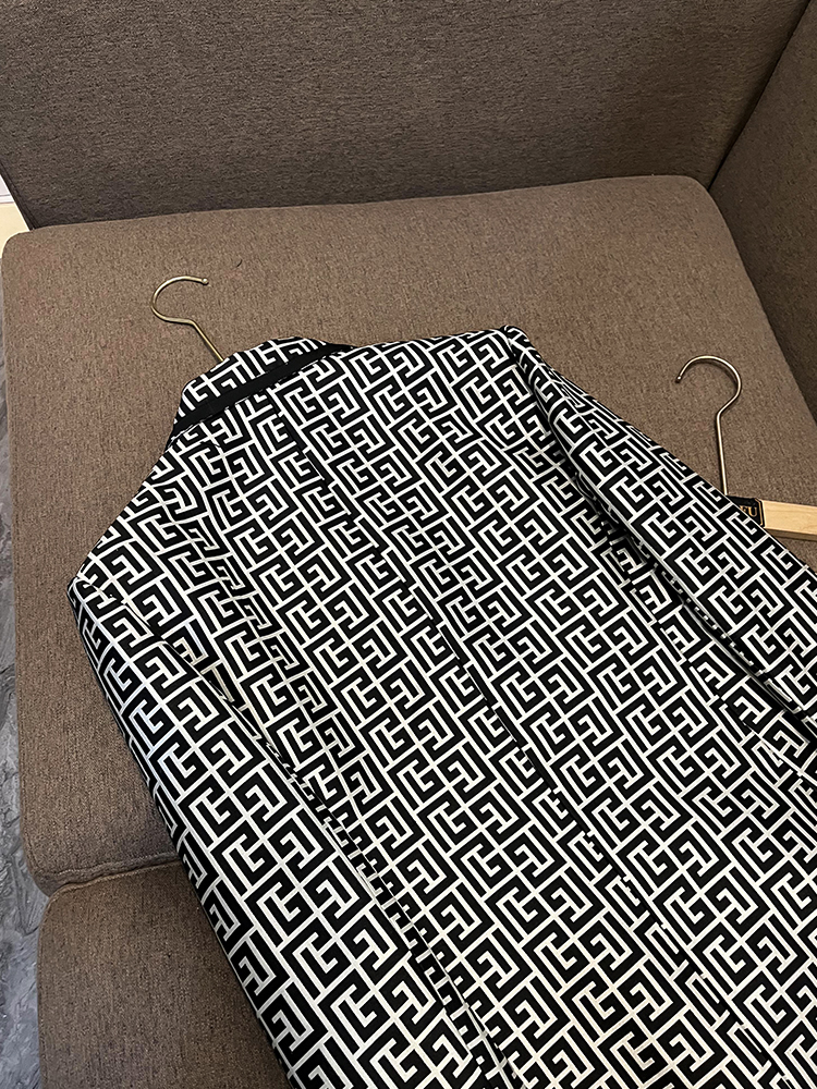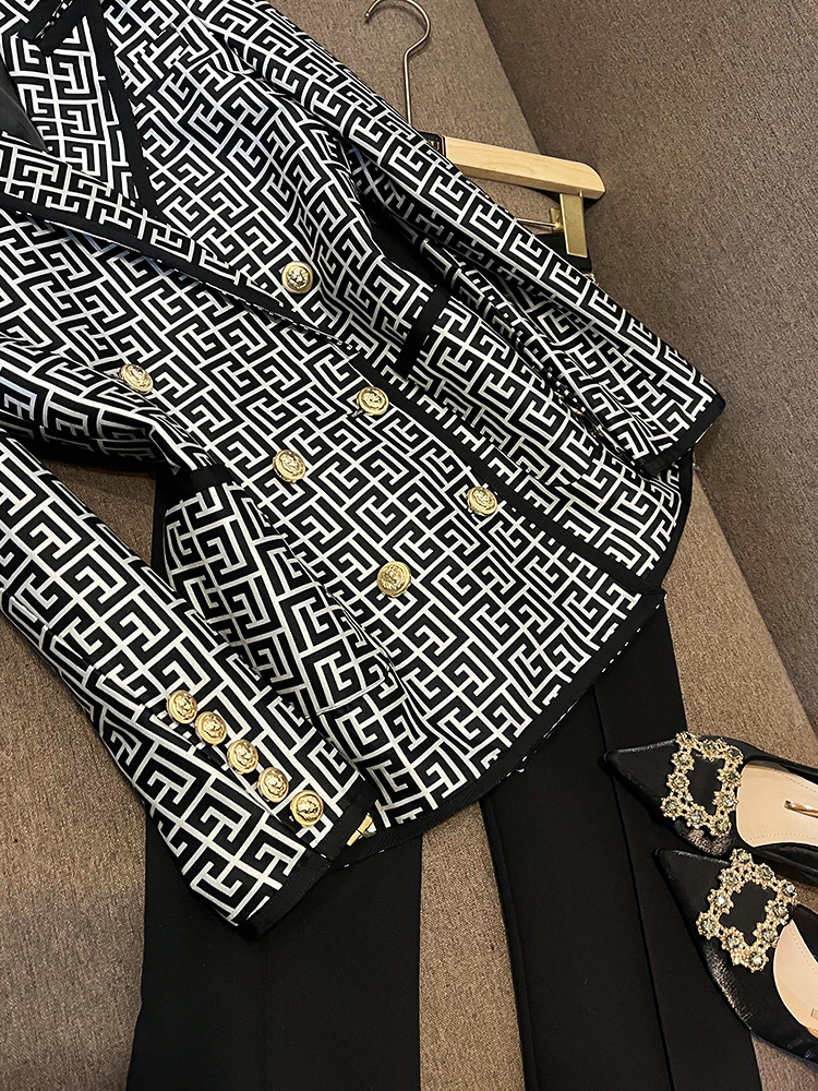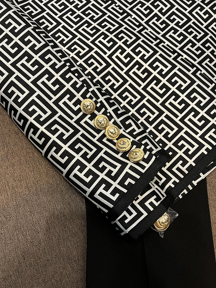 Introducing our best-selling Western Style Ribbon Edge Classical Black White Geometric Pattern Jacquard Double-breasted Women Blazer. This premium blazer is designed with a stylish ribbon edge and a classic black and white geometric pattern, perfect for any occasion. Made with high-quality jacquard fabric, it offers a perfect fit and is available in sizes S-XXL. The double-breasted design adds a touch of sophistication to your outfit. Don't miss out on this exclusive limited time offer and elevate your wardrobe with this must-have blazer.