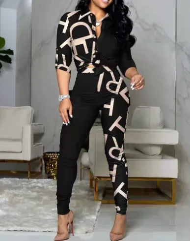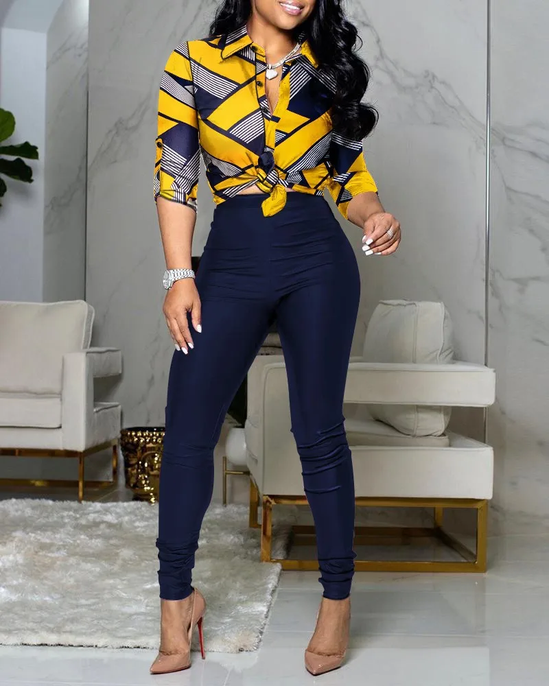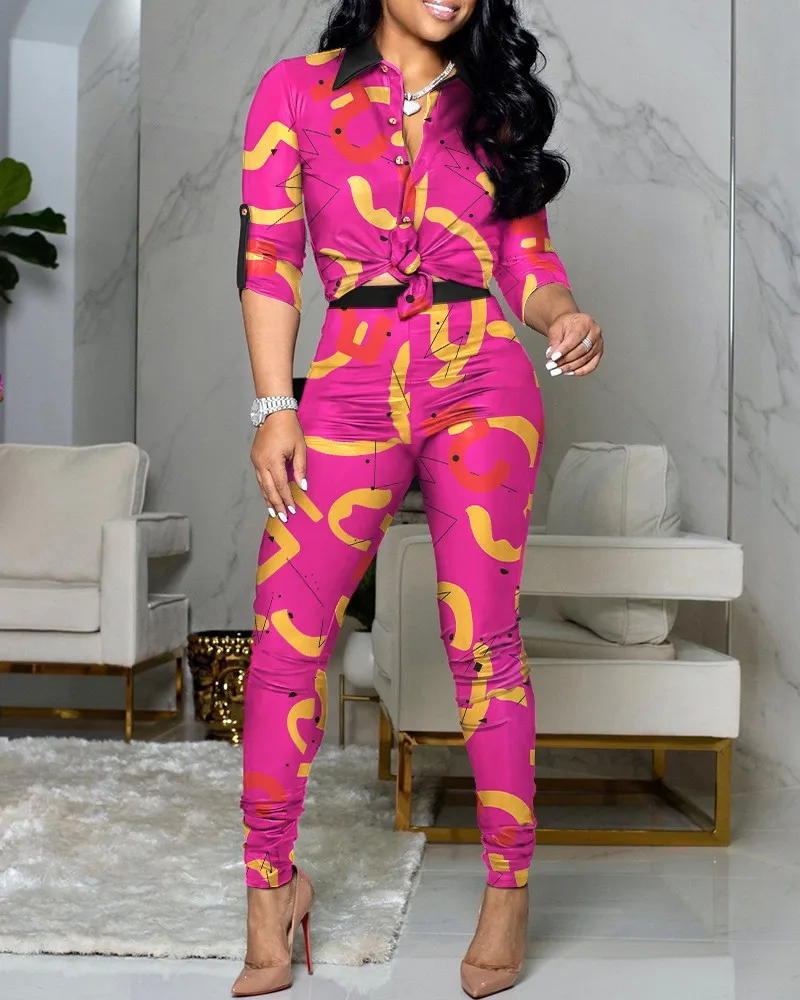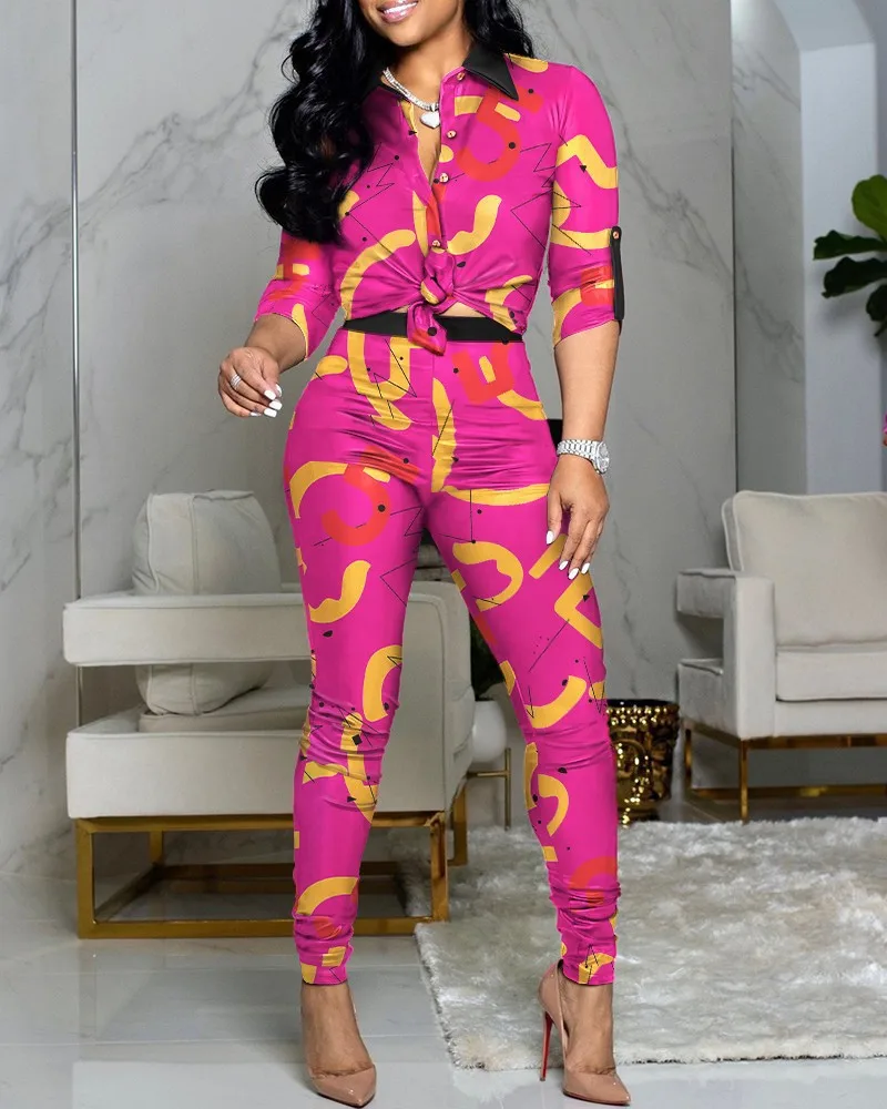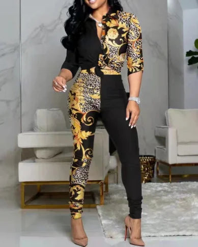 Colorblock Print Two-Piece Set - Casual Suit with Long Sleeve Lapel Shirt and Pants