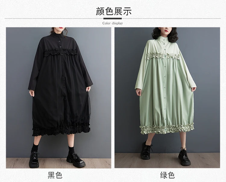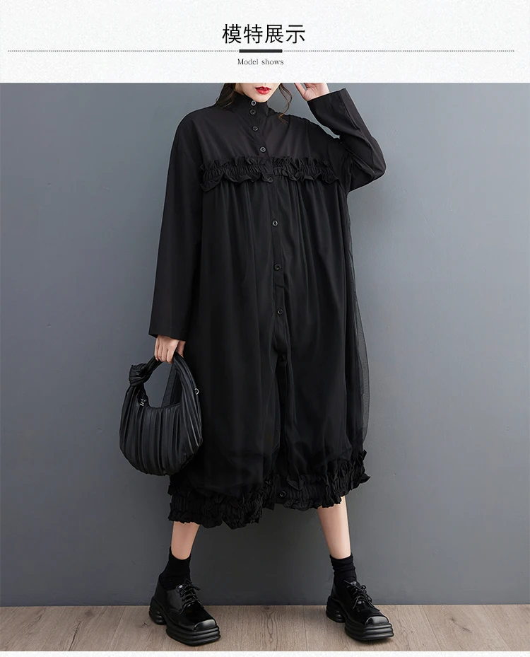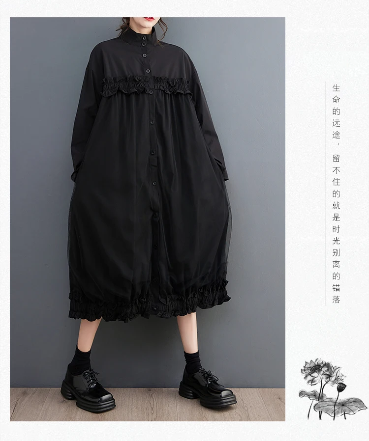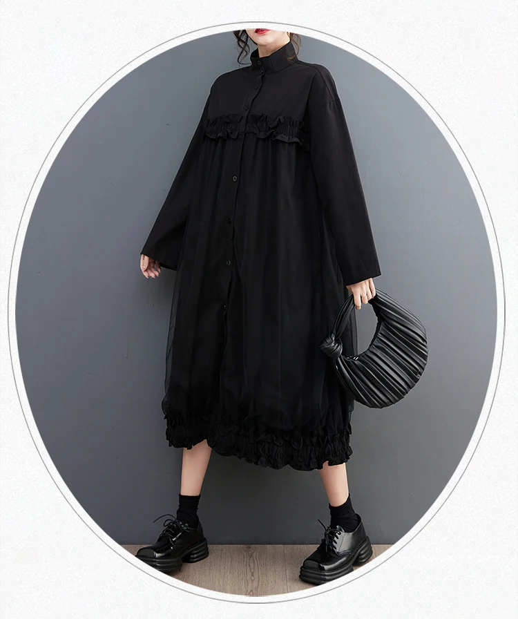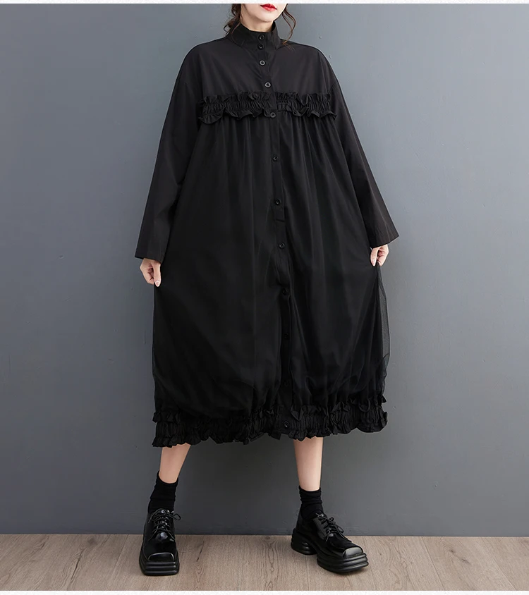 Introducing our best-selling Oversized Spring Autumn Long Shirts Dress for Women! This dress is designed with a unique mesh patchwork and loose ruffle pleats, giving it a modish and stylish look. Made with high-quality materials, this dress is perfect for any occasion and provides a comfortable fit. With our customized service, we can add your own brand or labels to the dress. Plus, for orders of 50 or more, we offer a mix of styles to choose from. Don't miss out on this exclusive offer and get your perfect fit today!