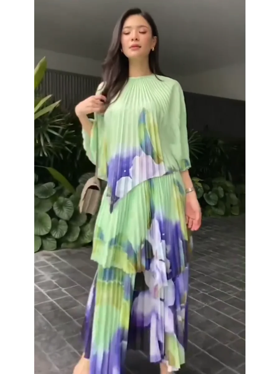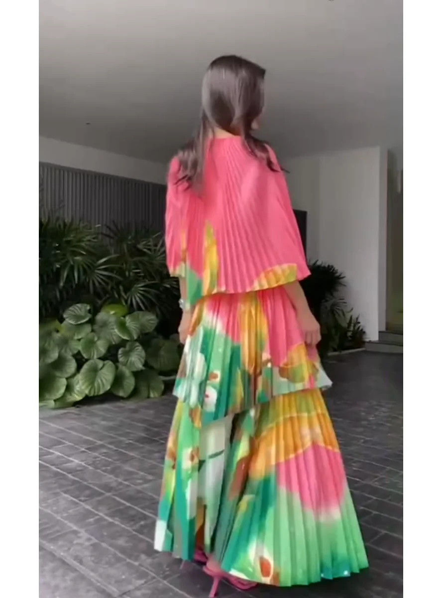 👗 What it is - A stunning ensemble featuring a print batwing sleeve top and an A-line folds skirt, both crafted for a perfect fit and maximum comfort.