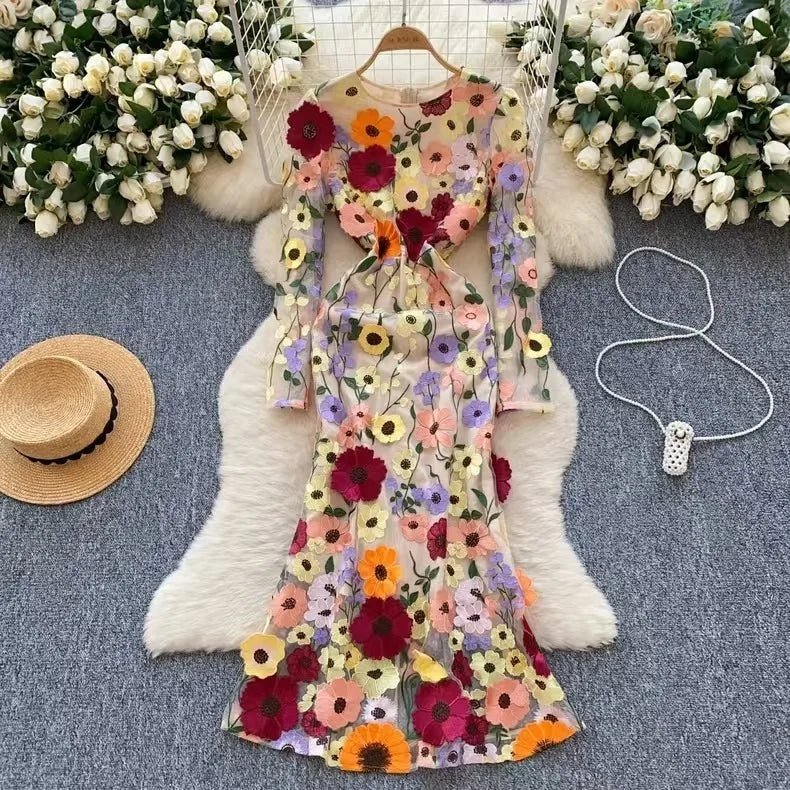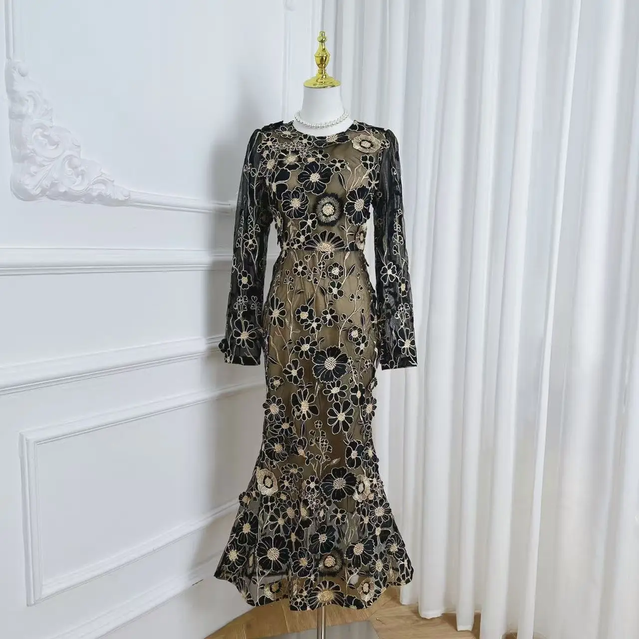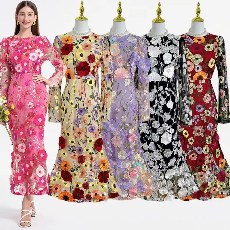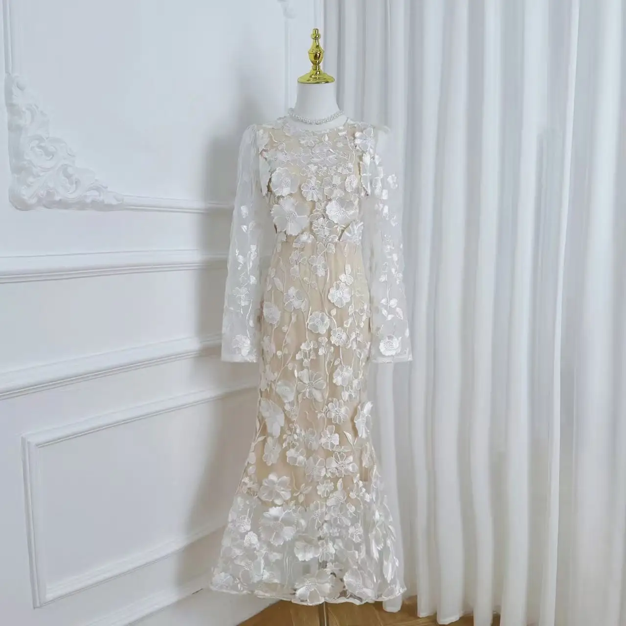 Crafted with exquisite detailing, this luxury dress features intricate embroidery and soft lace that gracefully drapes your silhouette. The long sleeves add elegance, making it an ideal choice for evening gatherings or formal celebrations.