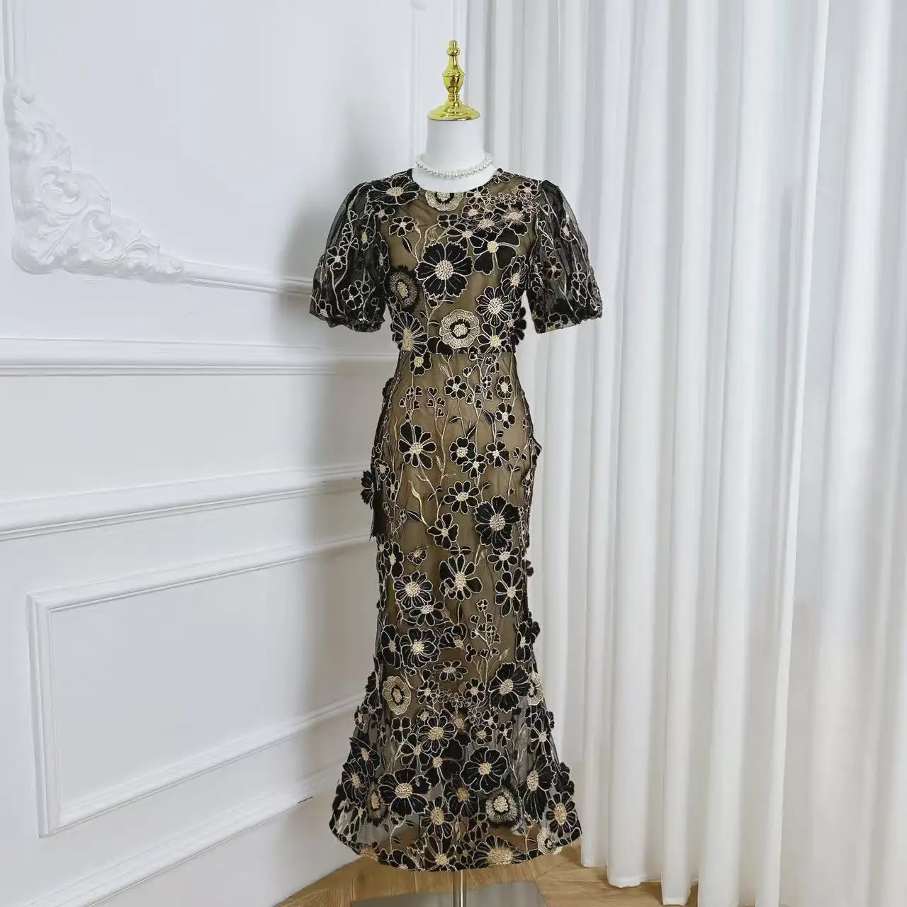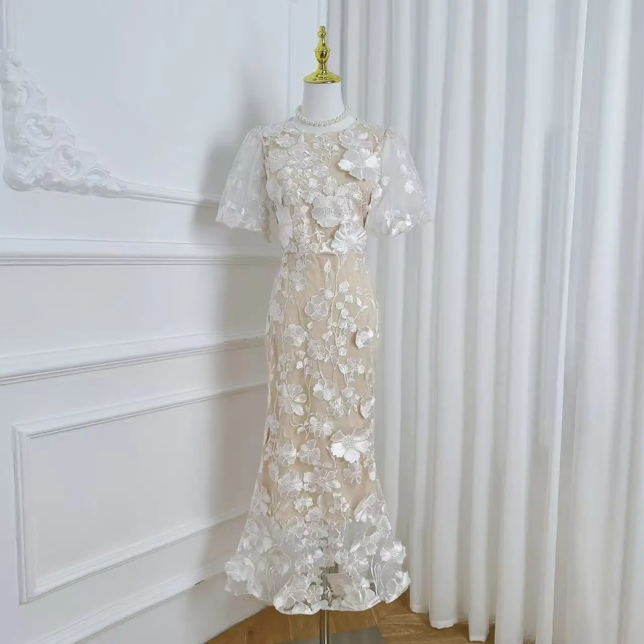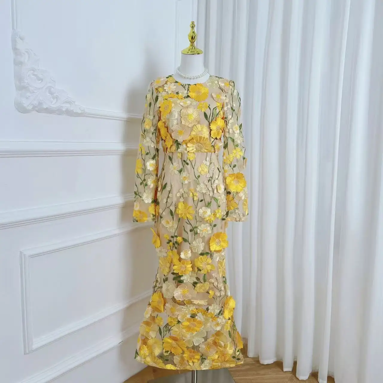Crafted with exquisite detailing, this luxury dress features intricate embroidery and soft lace that gracefully drapes your silhouette. The long sleeves add elegance, making it an ideal choice for evening gatherings or formal celebrations.