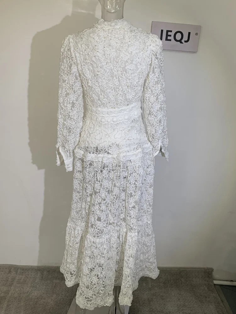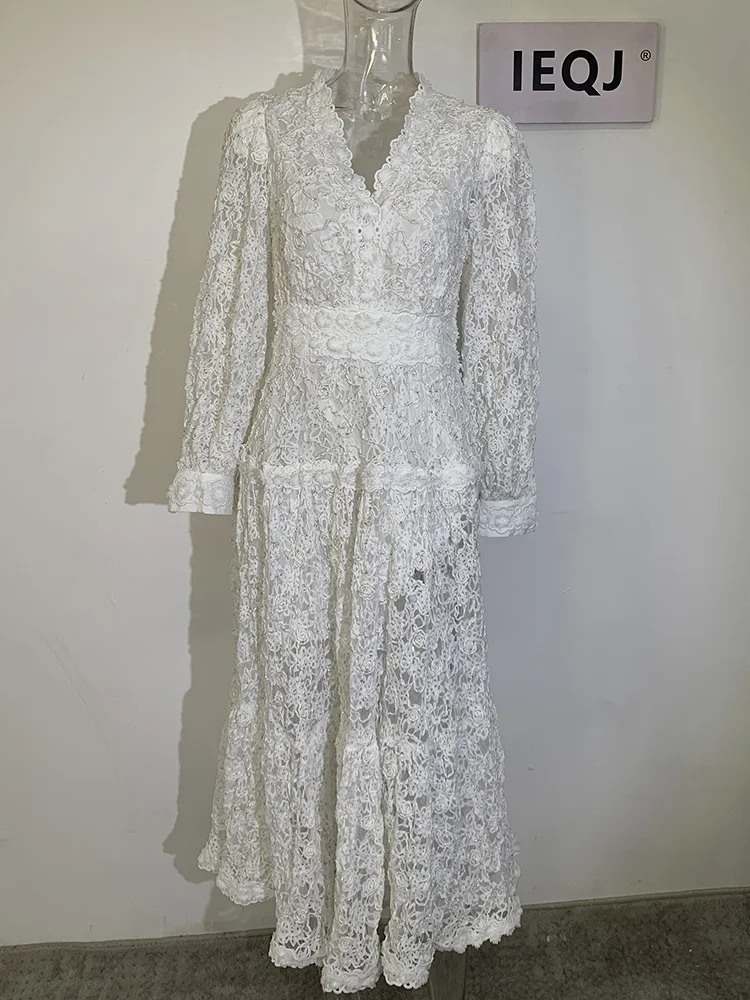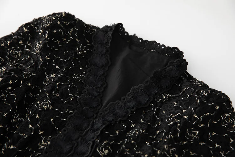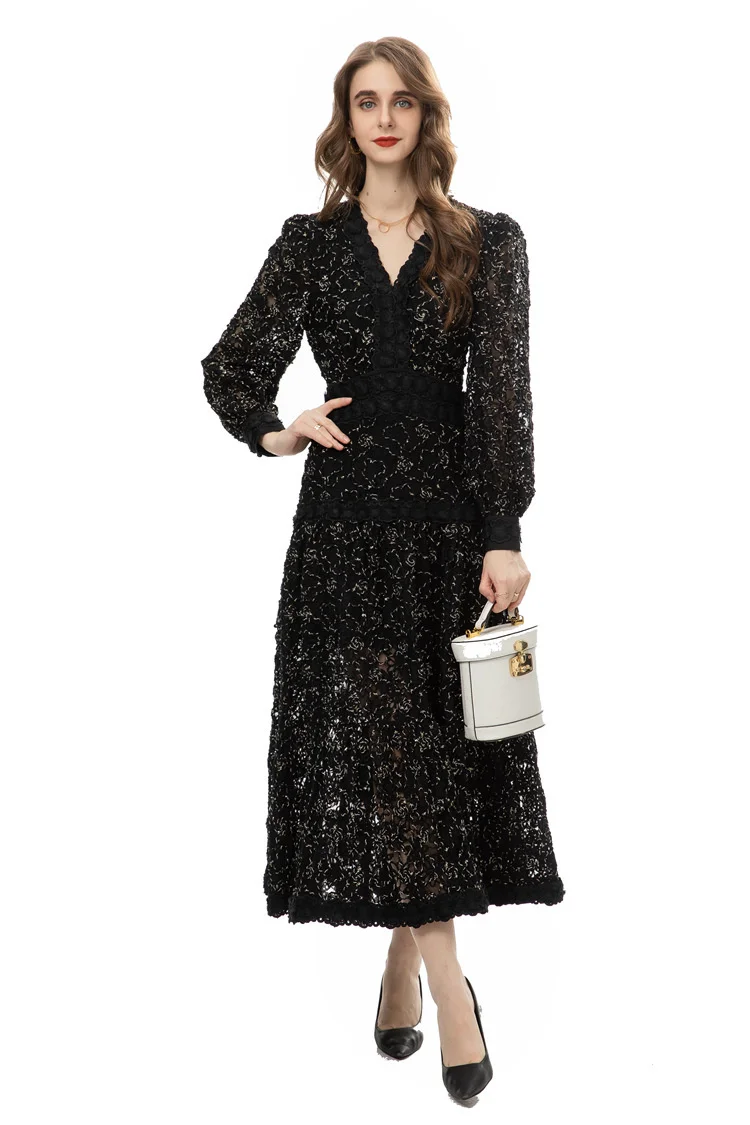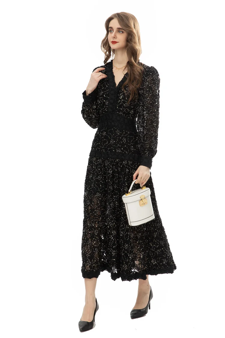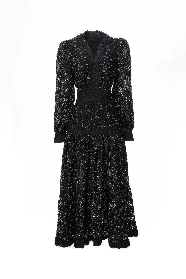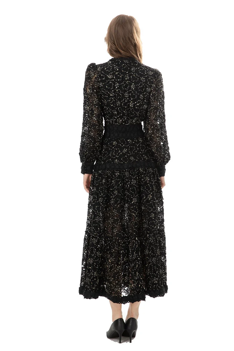 Introducing our IEQJ Hollow Out Embroidery Spliced Lantern Long Sleeve Black Big Swing Dresses! Designed for the modern woman, this dress combines elegance and comfort with its intricate lace detailing and flowy silhouette. Available in sizes S-XXL, it offers a perfect fit for any body type. Whether you're attending a party or a special evening event, this dress will solve all your outfit dilemmas. With its premium quality and unique design, it's a must-have in your wardrobe. Don't miss out on this limited time offer and be the best dressed wherever you go!