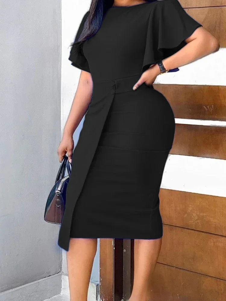 Why you'll love it: - Flattering body-hugging fit enhances your silhouette. - Beautiful ruffle detailing for an added touch of elegance. - Versatile round neck and short sleeves for comfort and style. - Crafted with exclusive splice design for a chic look. - Ideal for parties, date nights, or summer gatherings.