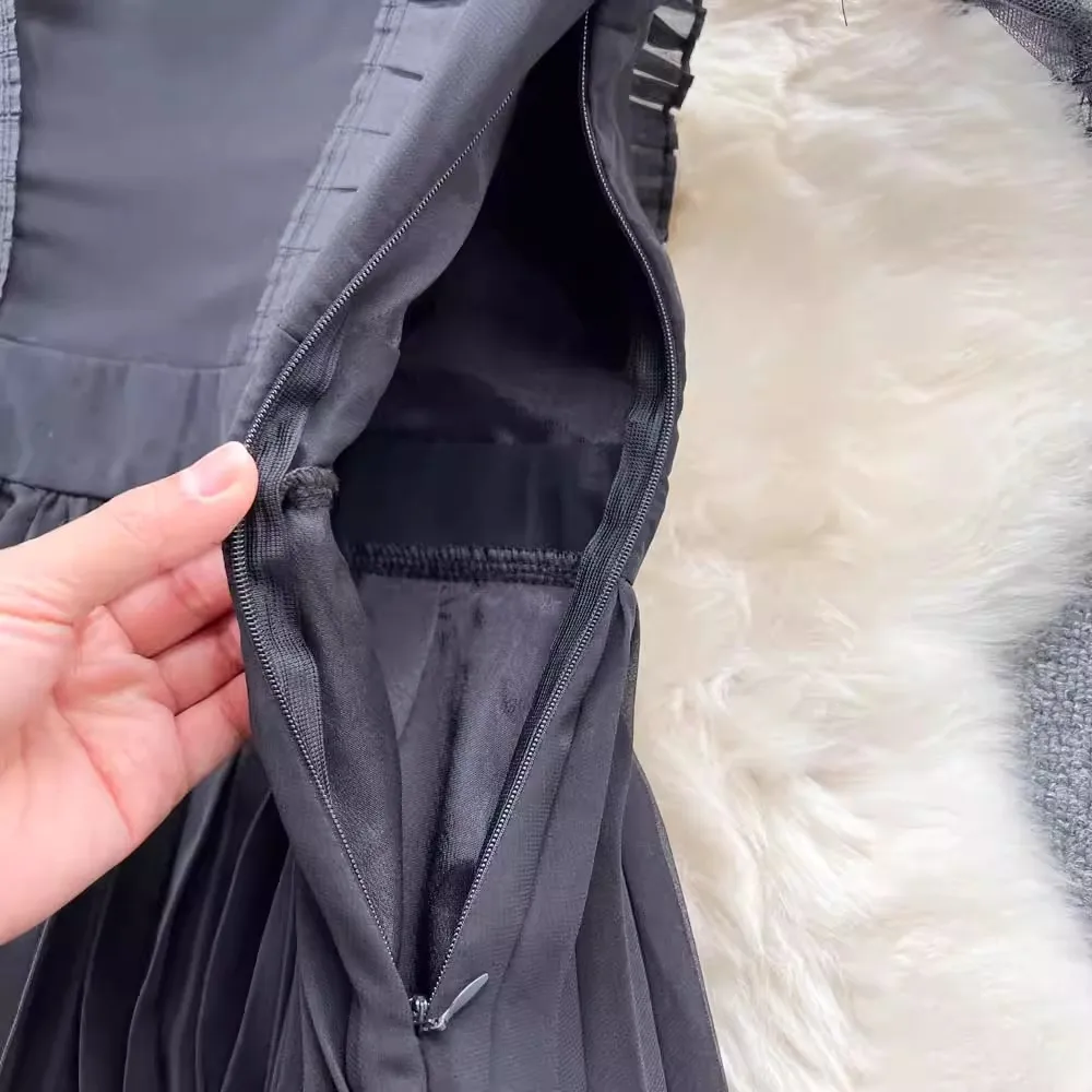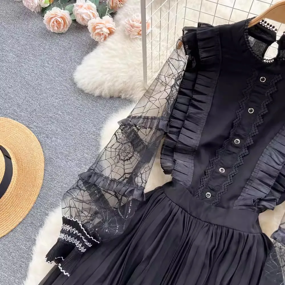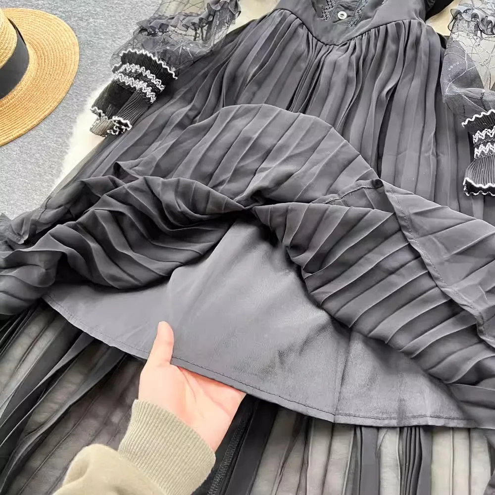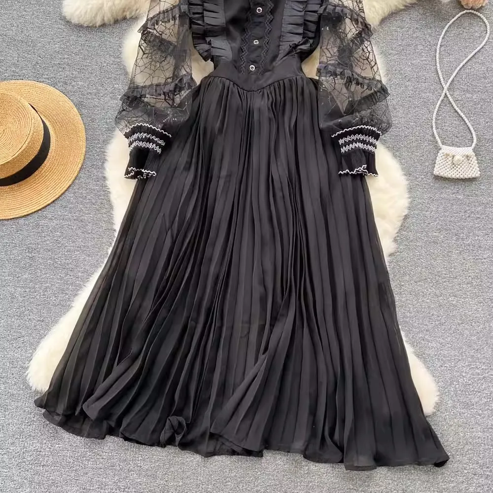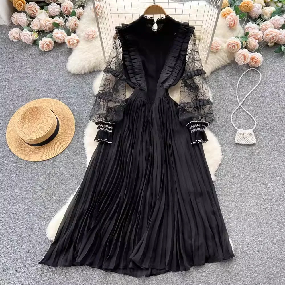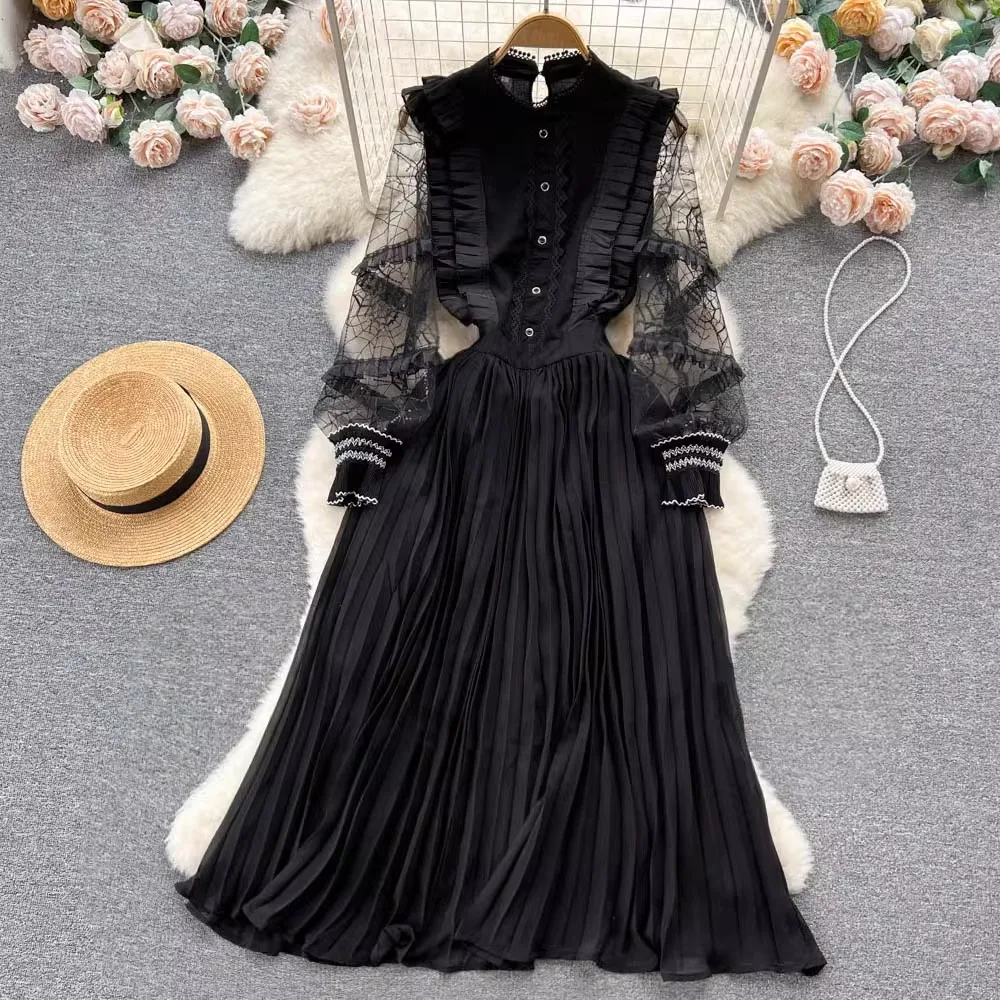 Own the season with our Autumn Elegant Mesh Embroidered Black Pleated Dress! 🍁✨ Made for the bold and beautiful, this stunning midi dress features intricate mesh embroidery, sequined stand collar, and see-through long sleeves for a touch of vintage charm. Stand out in style and make a statement with this wardrobe essential for any special occasion.
