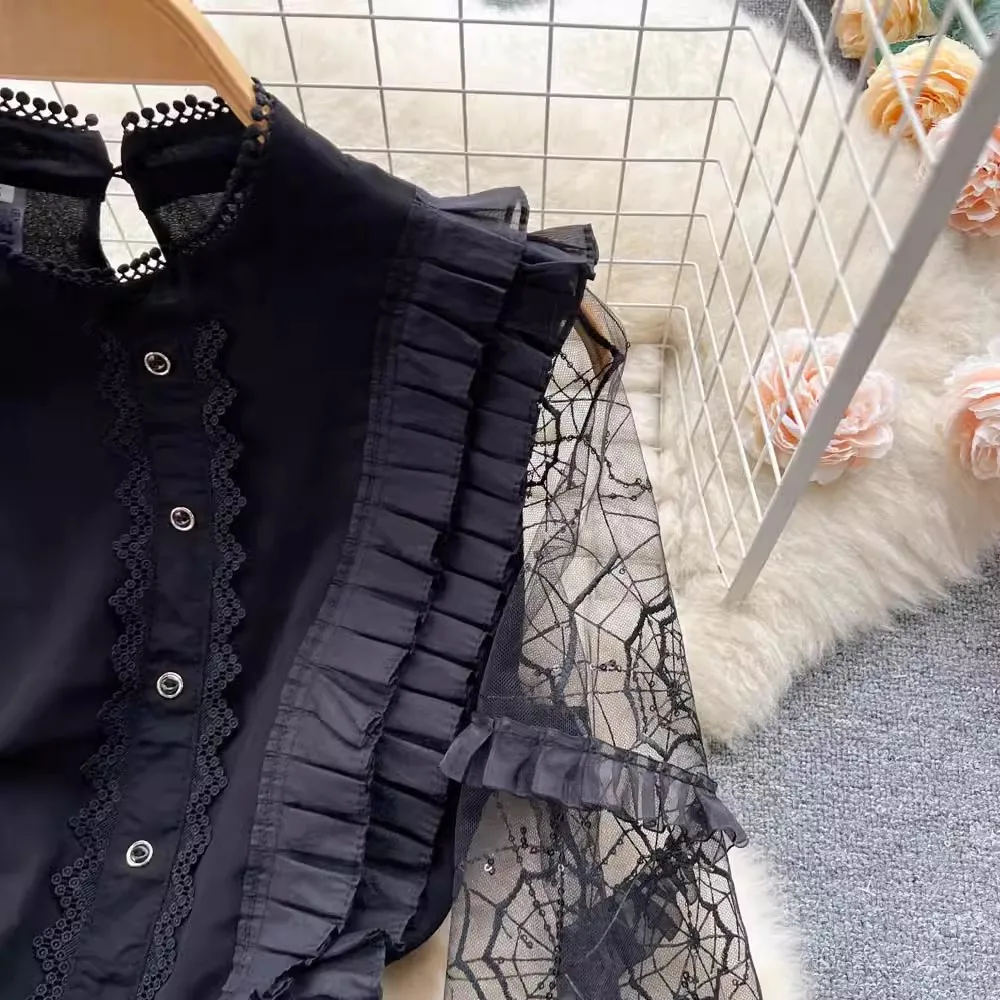 - Stand out in style at any event - Intricate mesh embroidery and sequined stand collar - See-through long sleeves add a touch of vintage charm - Perfect fit for a bold and elegant look